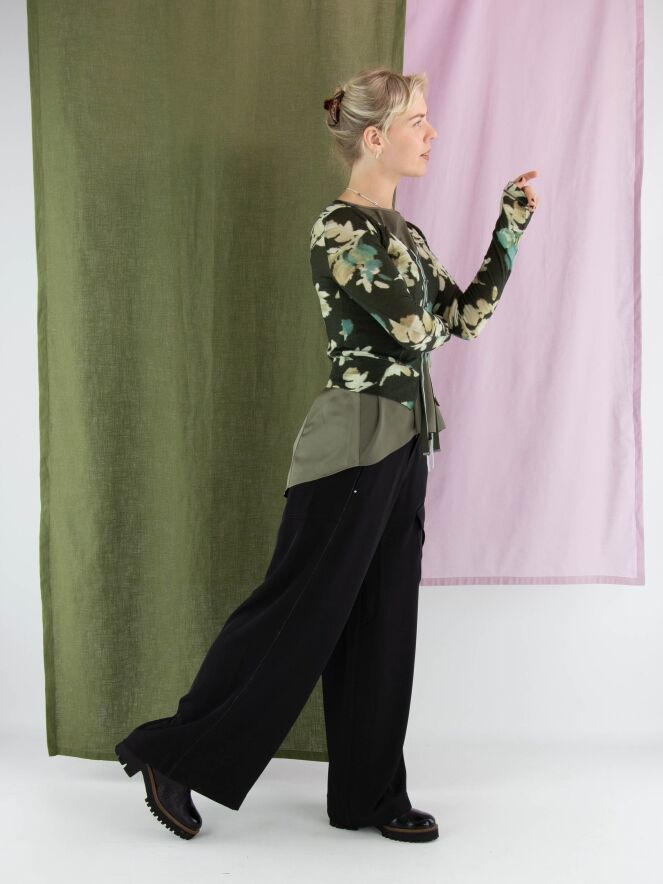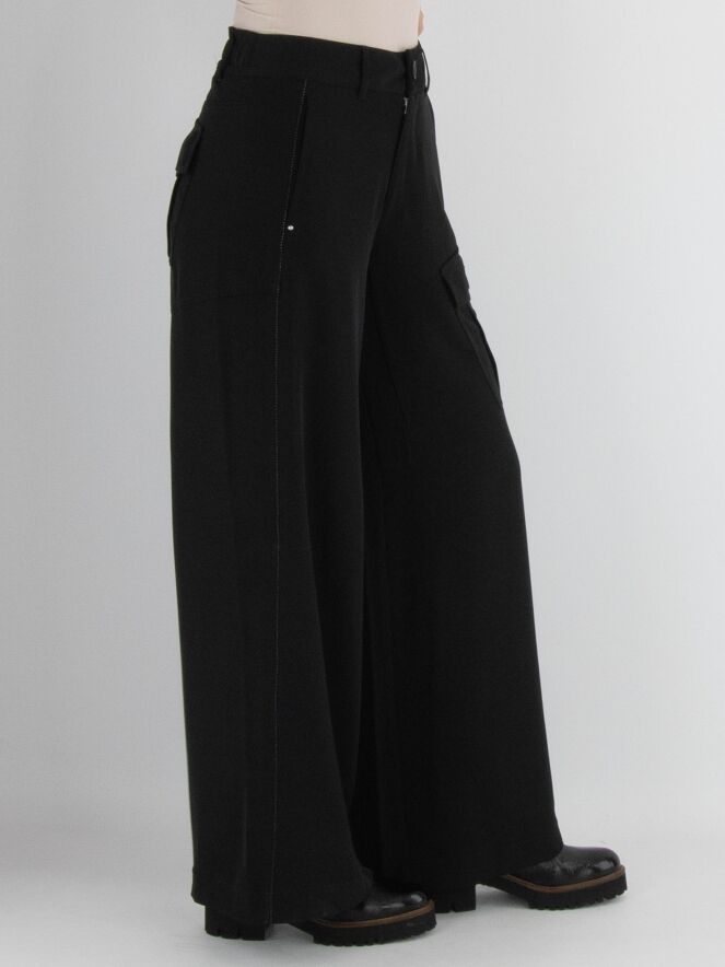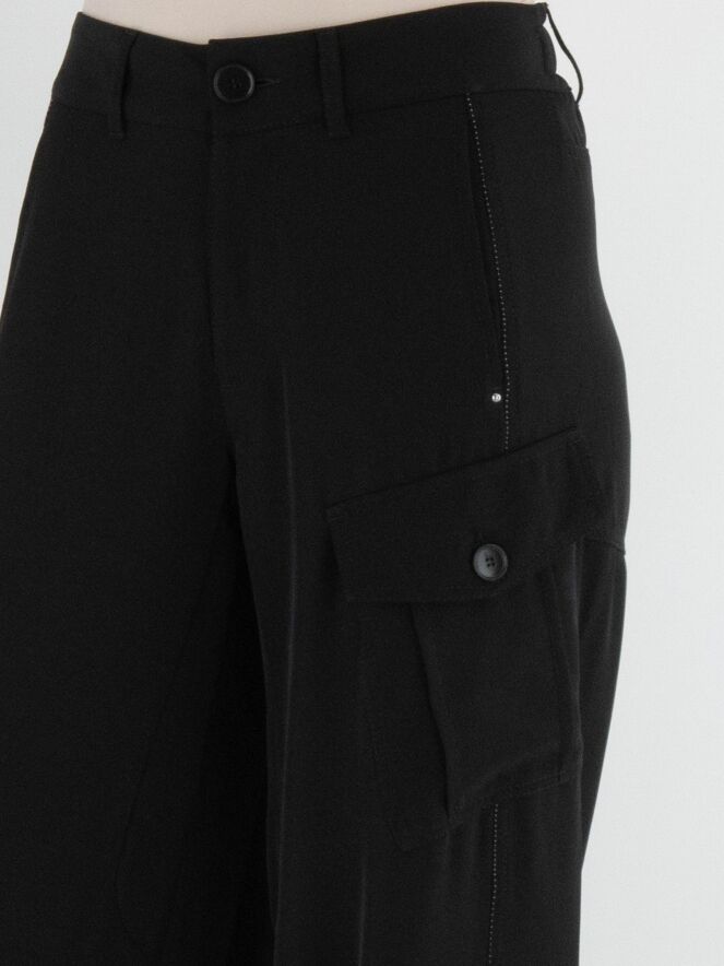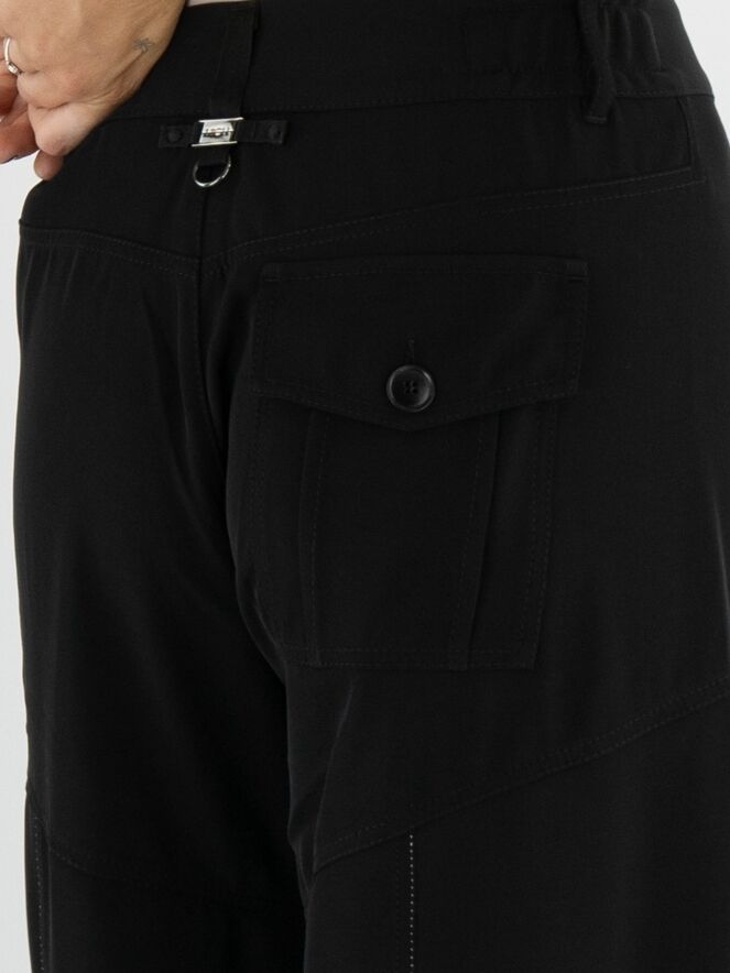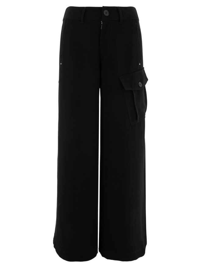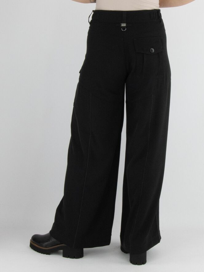 Een broek van High in de kleur zwart. In de taille bevinden zich aan de zijkanten korte elastische inzetten. Onder de heup, op het rechterbovenbeen, zit een decoratieve zak. De verticale stiknaden zijn uitgevoerd met wit stikgaren. Deze broek mag op 30 graden worden gewassen.