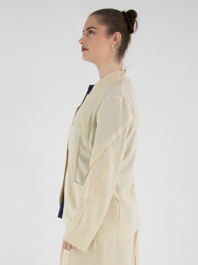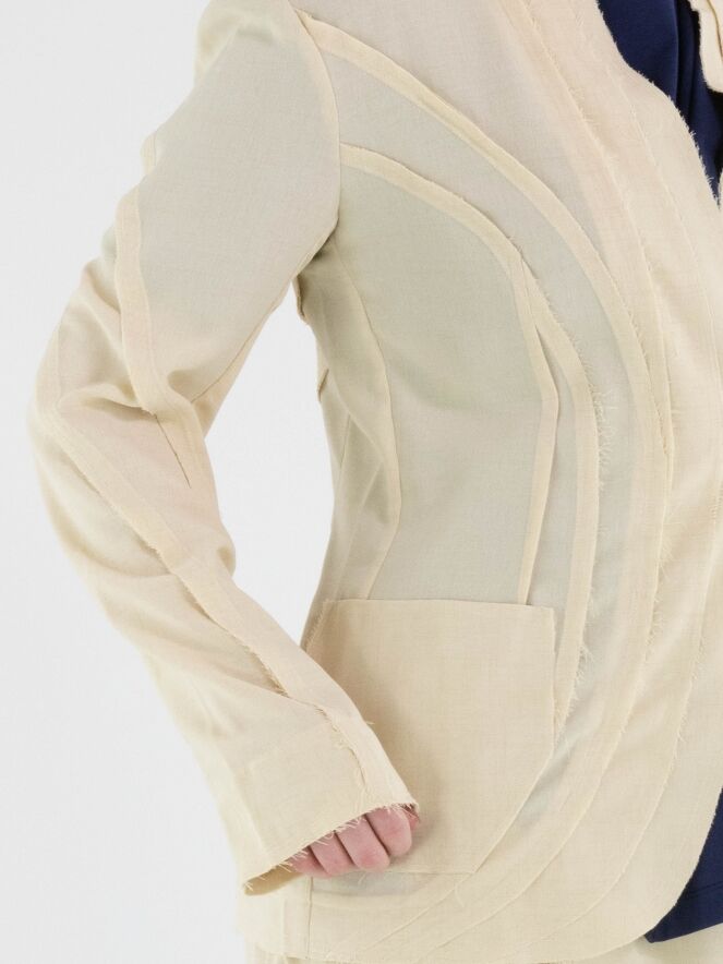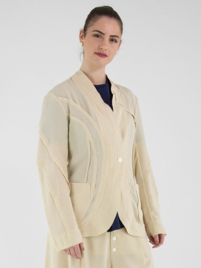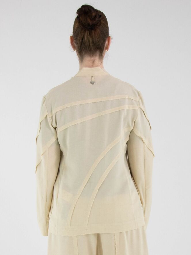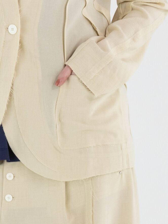 Een licht transparante blazer van High in een zandkleur. De randen van de taillenaad aan de voor- en achterzijde zijn fijn gerafeld. De blazer heeft een sluiting met één knoop. Deze blazer kan met de hand worden gewassen.