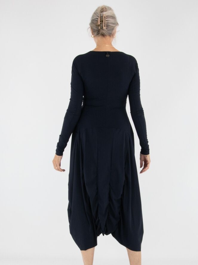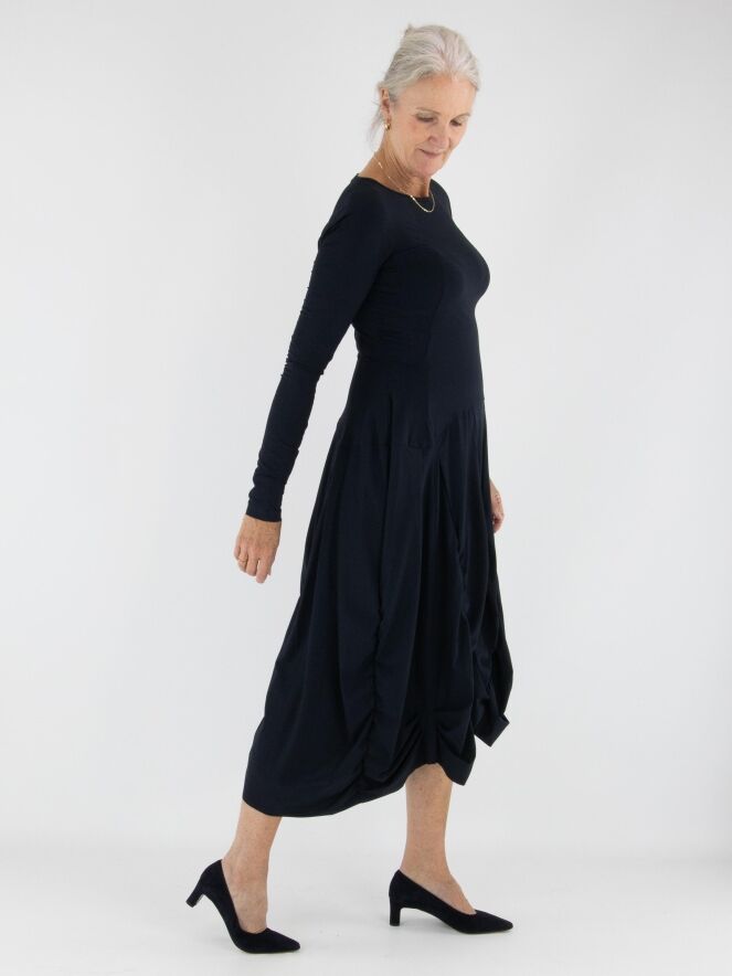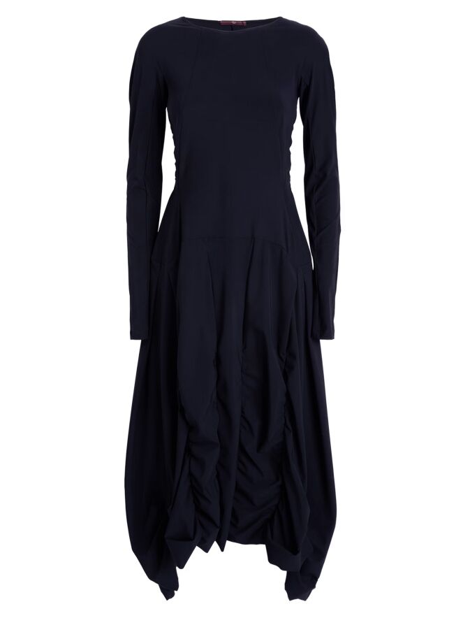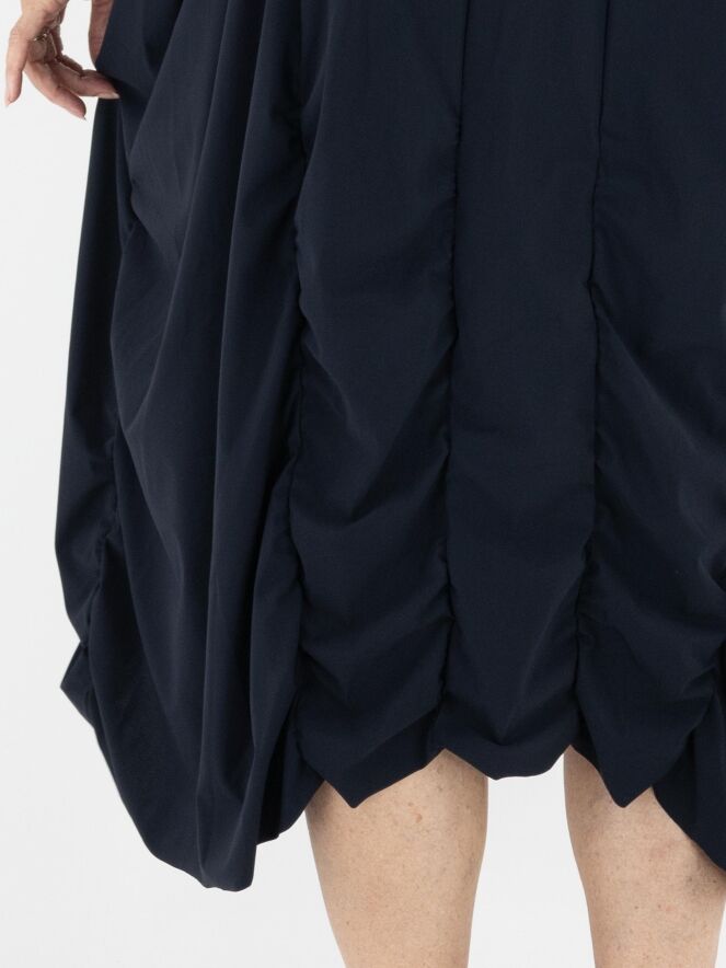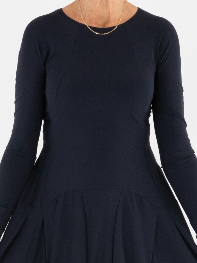Een jurk van High in de kleur marineblauw. De jurk heeft een ronde hals en lange mouwen. Vanuit de taille lopen aan de voor- en achterkant meerdere verticale stiknaden waarlangs de stof fijn is geplooid, wat een decoratief gesmokt effect creëert. Deze jurk kan op 30 graden worden gewassen.