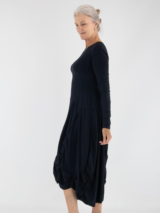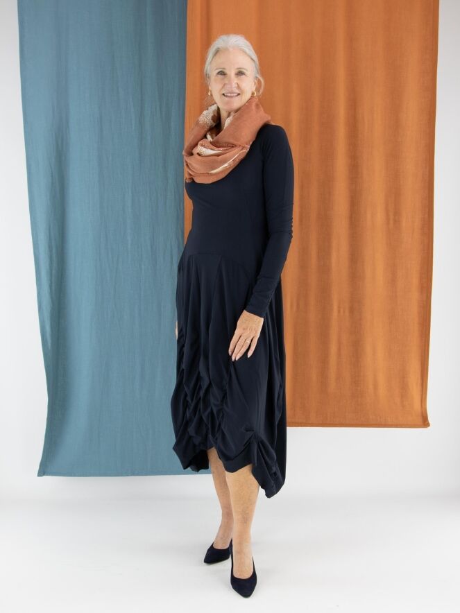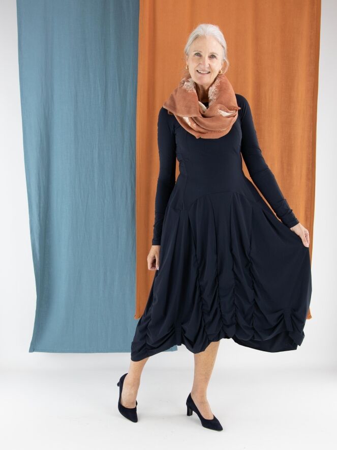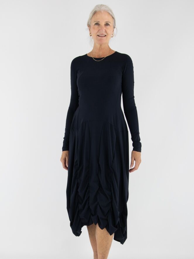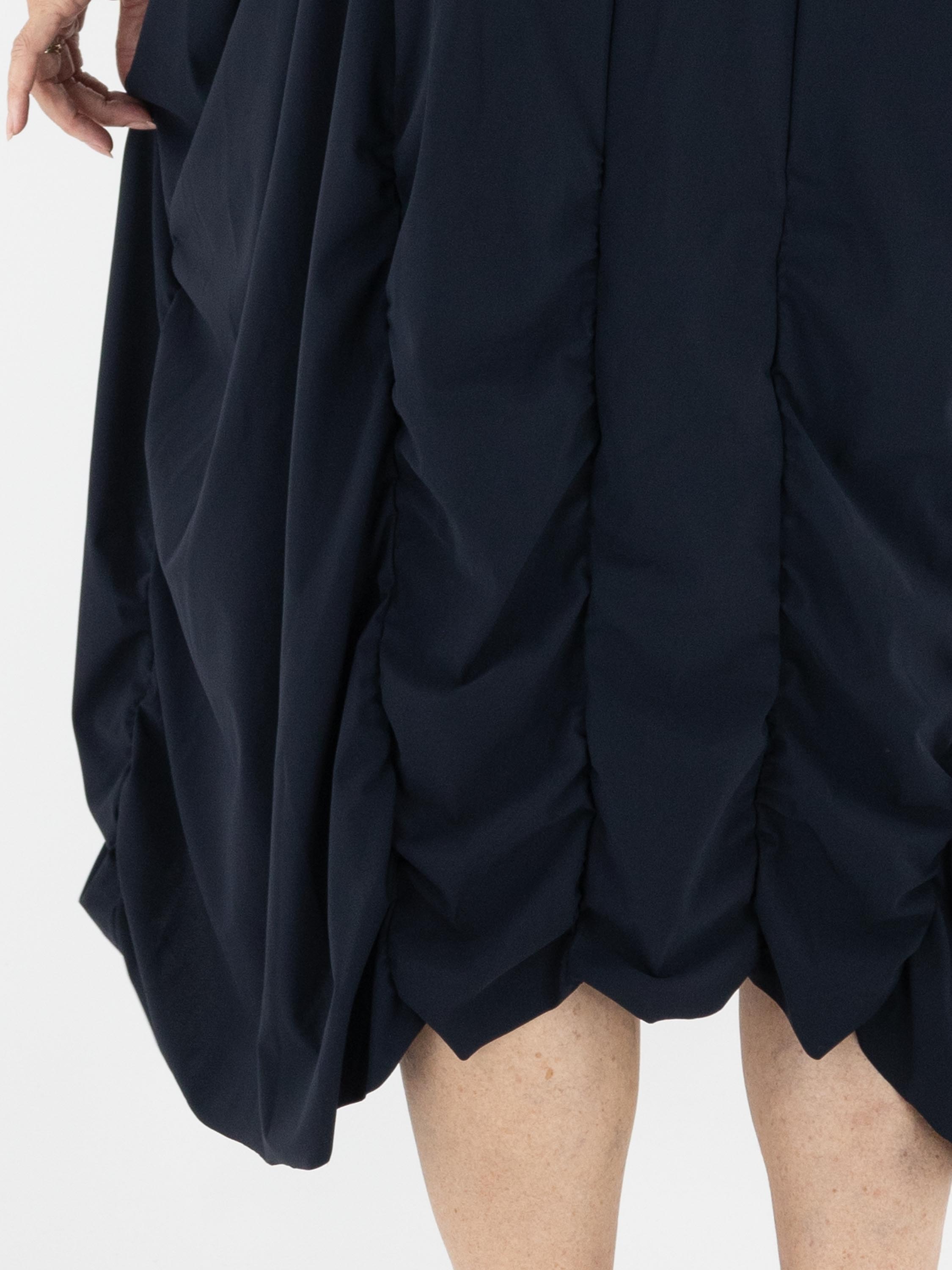 Een jurk van High in de kleur marineblauw. De jurk heeft een ronde hals en lange mouwen. Vanuit de taille lopen aan de voor- en achterkant meerdere verticale stiknaden waarlangs de stof fijn is geplooid, wat een decoratief gesmokt effect creëert. Deze jurk kan op 30 graden worden gewassen.