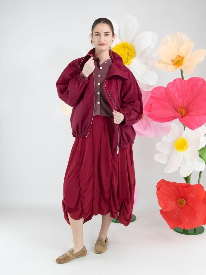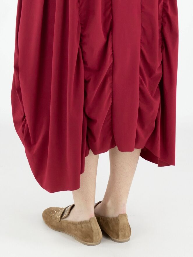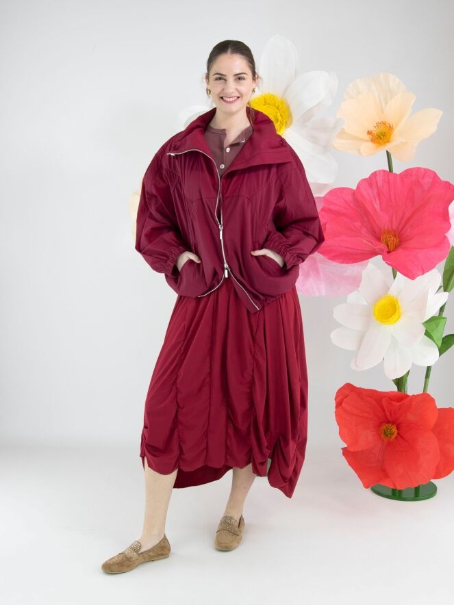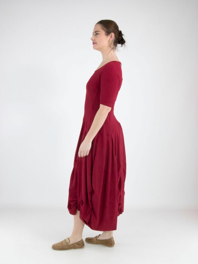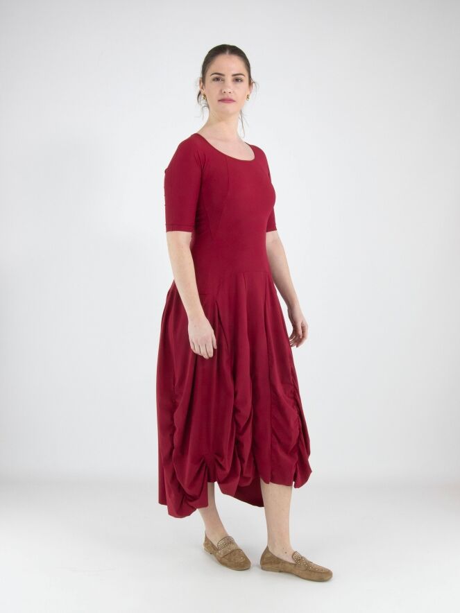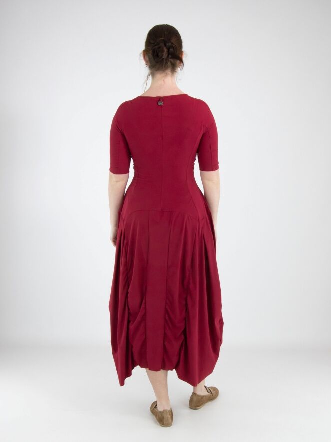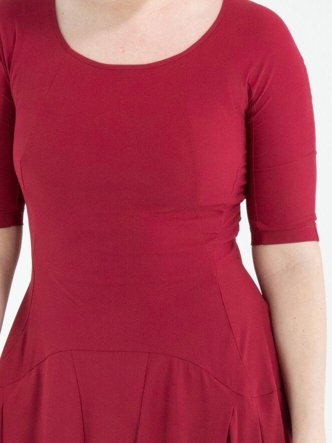 Een jurk van High Tech in de kleur framboosrood. De jurk heeft een ruime ronde hals en korte mouwen. Vanuit de taille lopen meerdere verticale stiknaden waarlangs de stof is geplooid, wat een smockeffect geeft. Deze jurk mag op 30 graden worden gewassen.