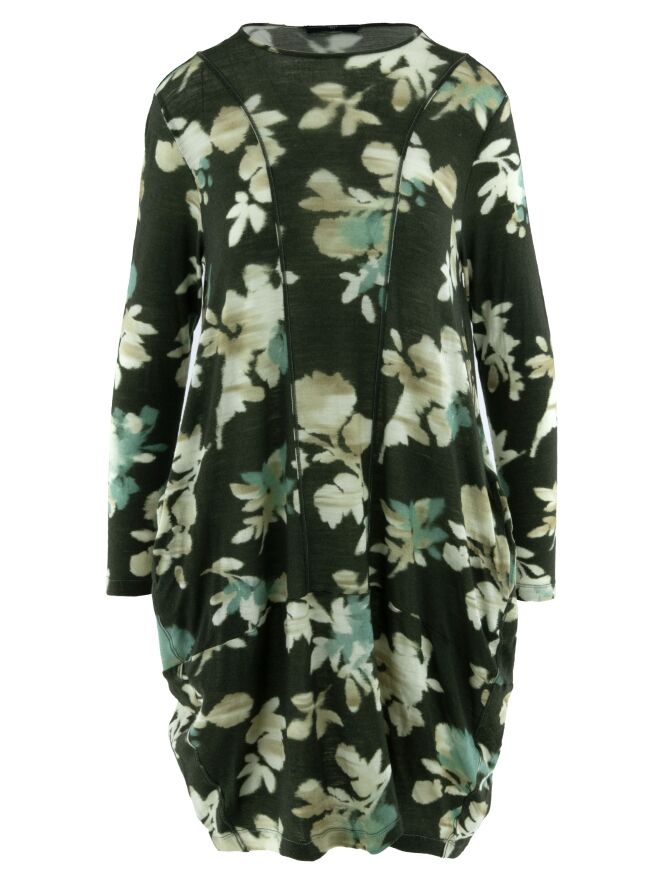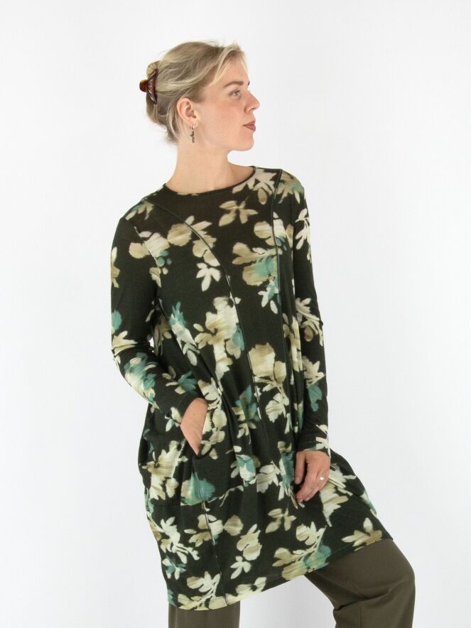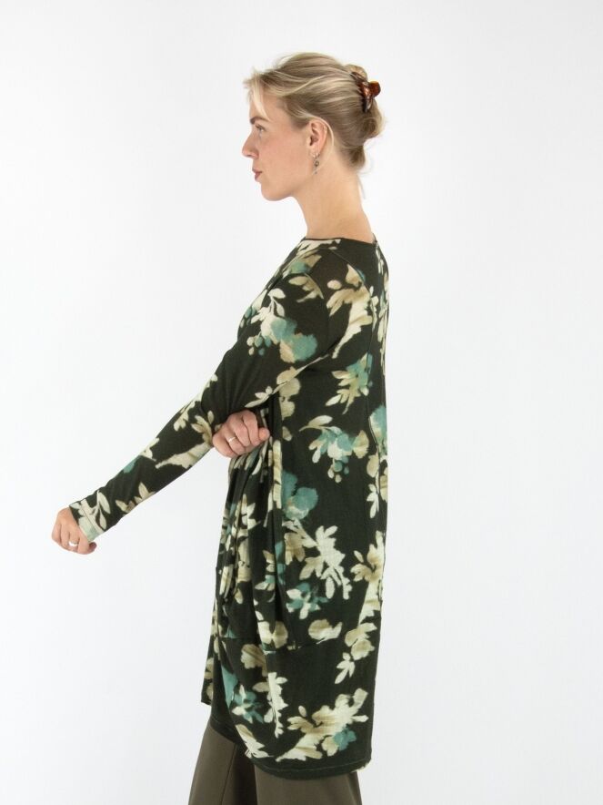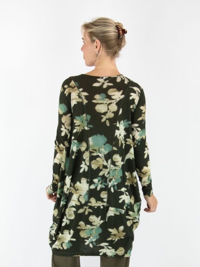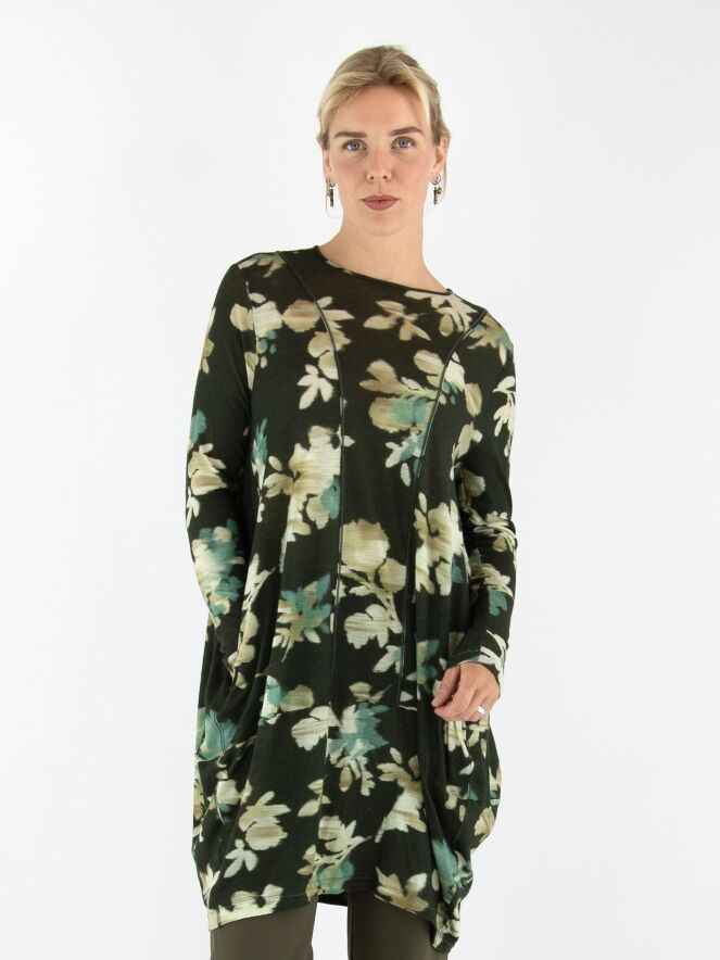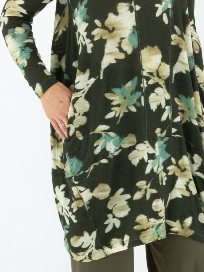 Een tuniek van High in een grafische bloemenprint met de kleuren beige, turquoise en roomwit op een olijfgroene achtergrond. De tuniek heeft een ronde hals, lange mouwen en loopt vanaf de heup taps toe. Deze tuniek mag met de hand worden gewassen.
