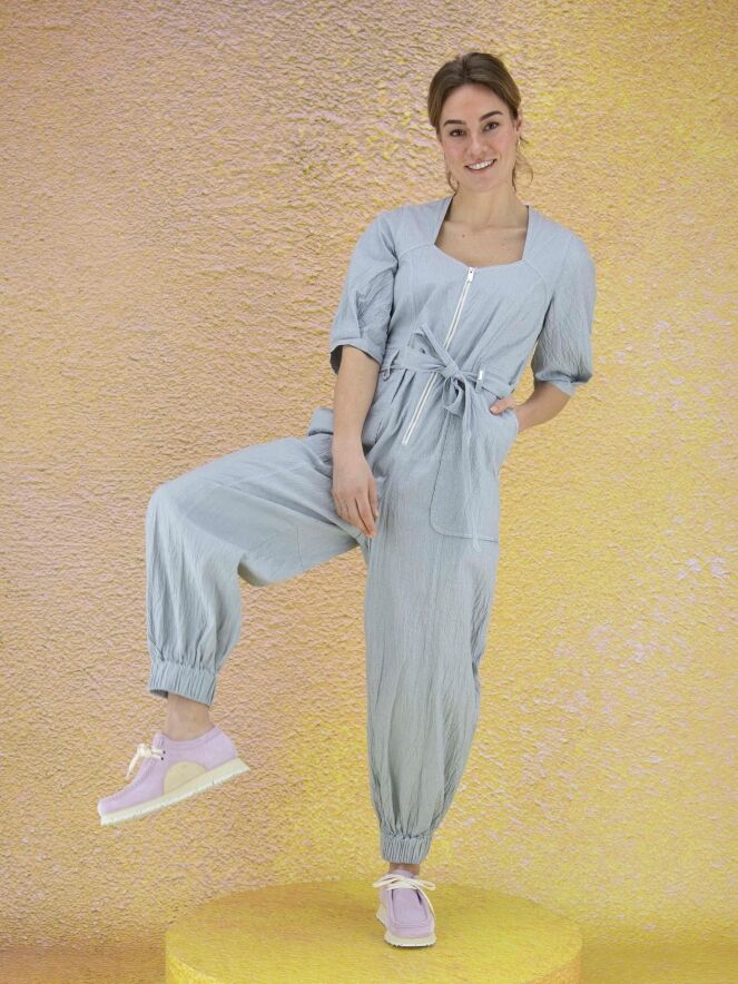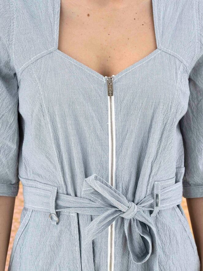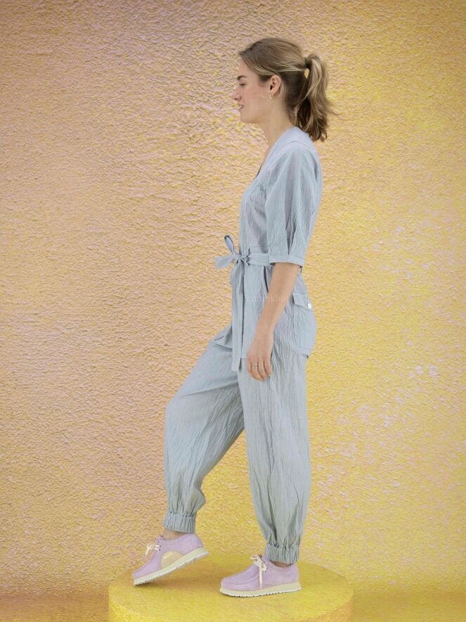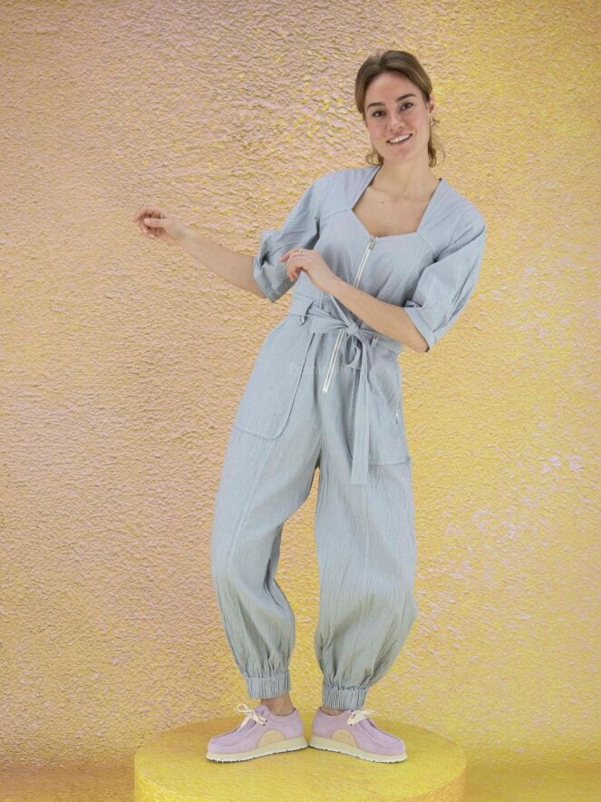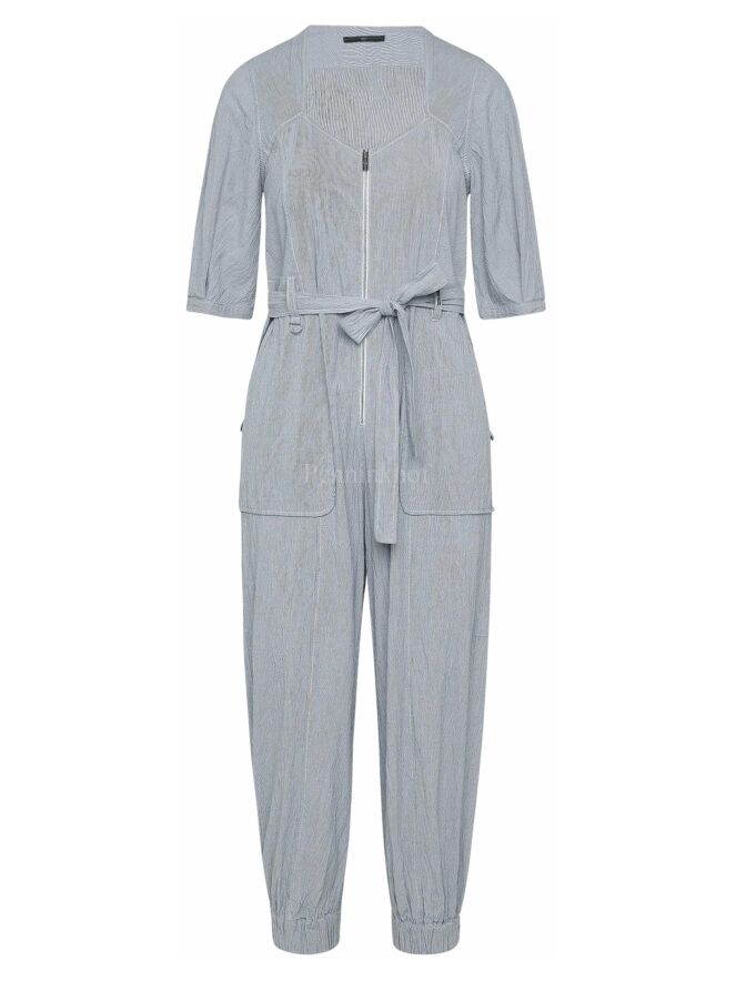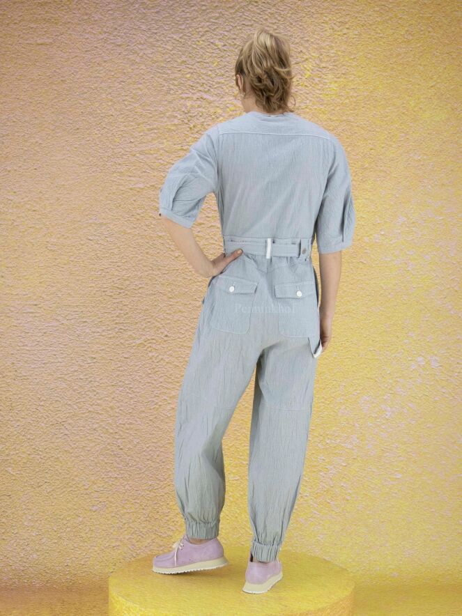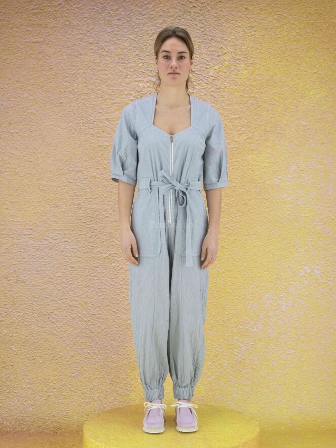 Een jumpsuit van High in een fijn gekreukte streep structuur met de kleuren blauw en wit. In de taille is een ceintuur van dezelfde stof als de jumpsuit. Onder de taille zijn steekzakken. Vanuit het midden van de gehoekte halslijn is een rits tot onder de taille. Aan de onderkant van de pijpen is een brede fijn geplooide elastieken band. Deze jumpsuit mag niet worden gewassen.