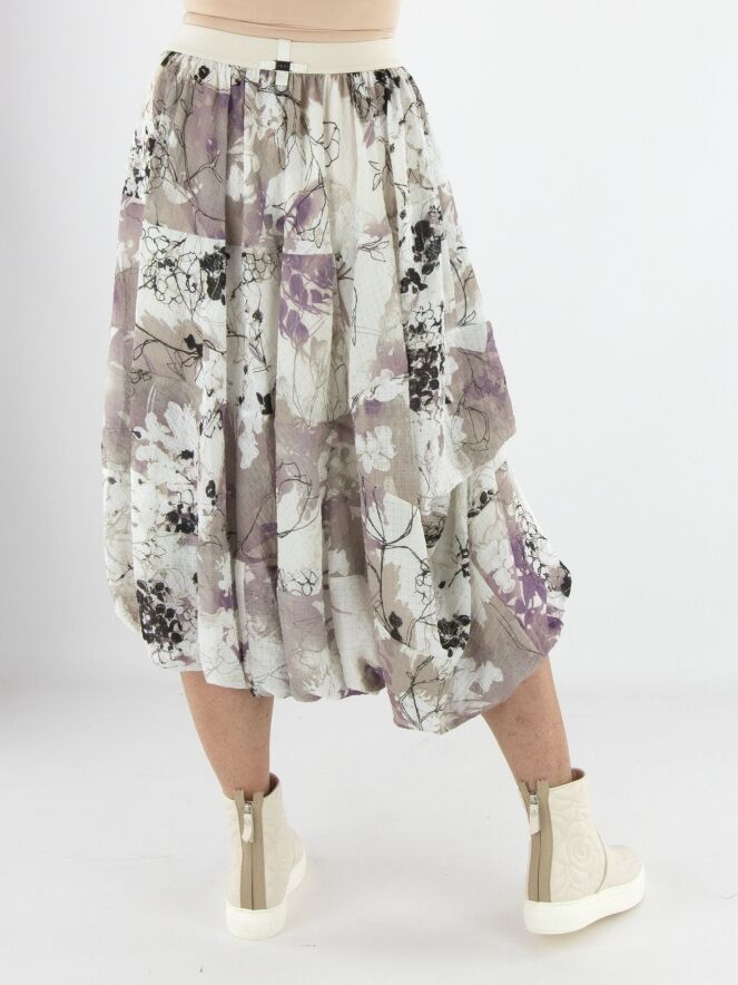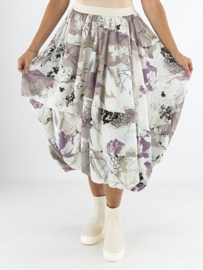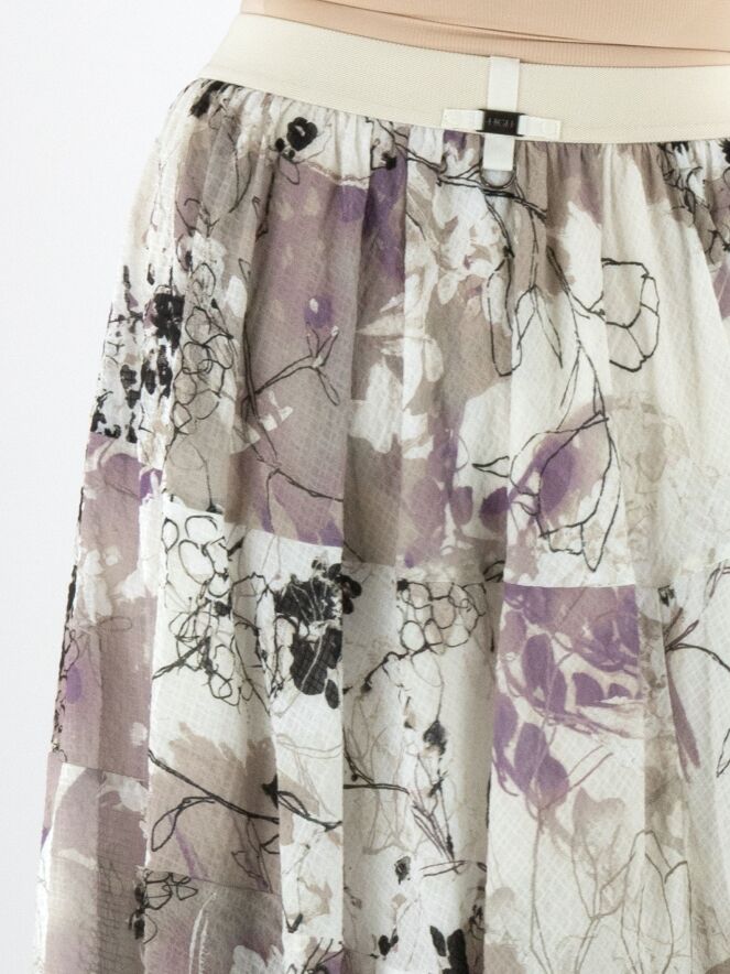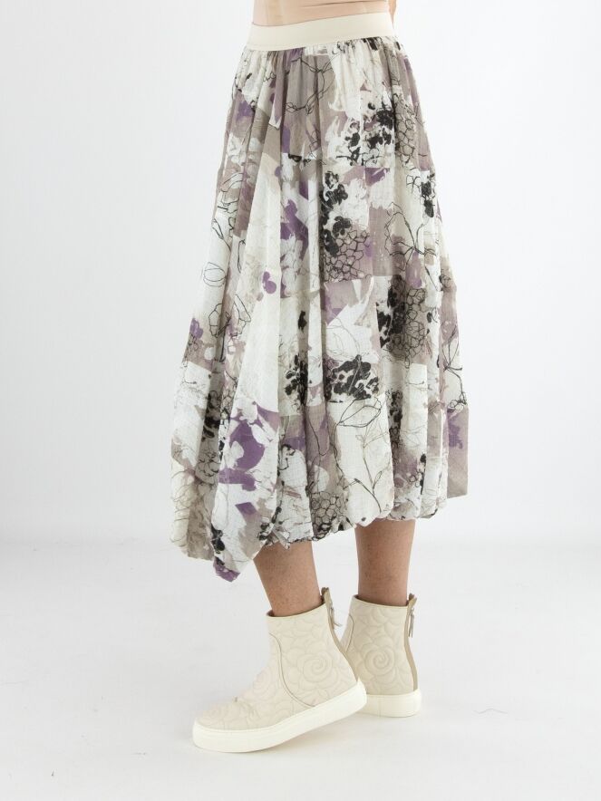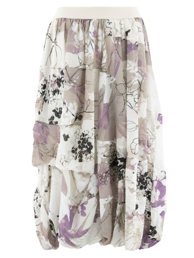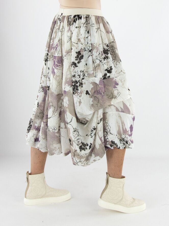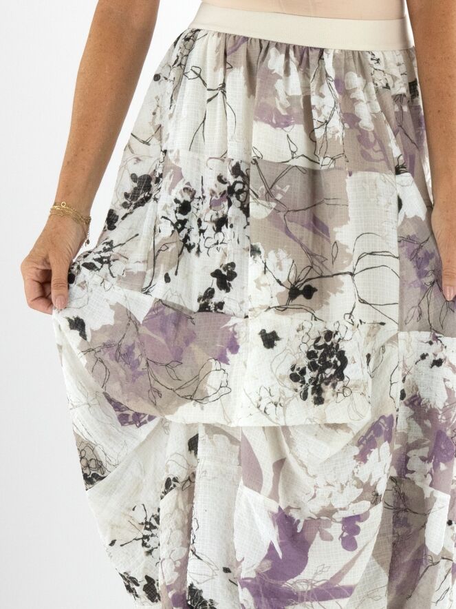 Een rok van High in een grafische aquarelprint met de kleuren beige, mauve en zwart op een roomwitte achtergrond. De rok bestaat uit meerdere stofbanen die met horizontale stiknaden zijn verbonden. In de taille zit een elastische band. De voering is aan de bovenstof bevestigd, wat aan de onderkant een rol-effect creëert. Deze rok mag met de hand worden gewassen.