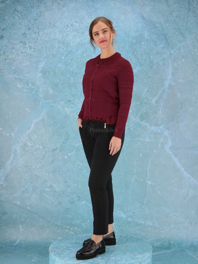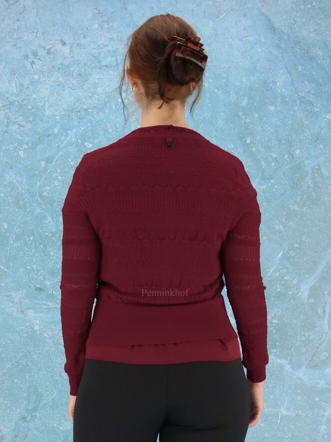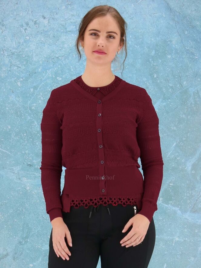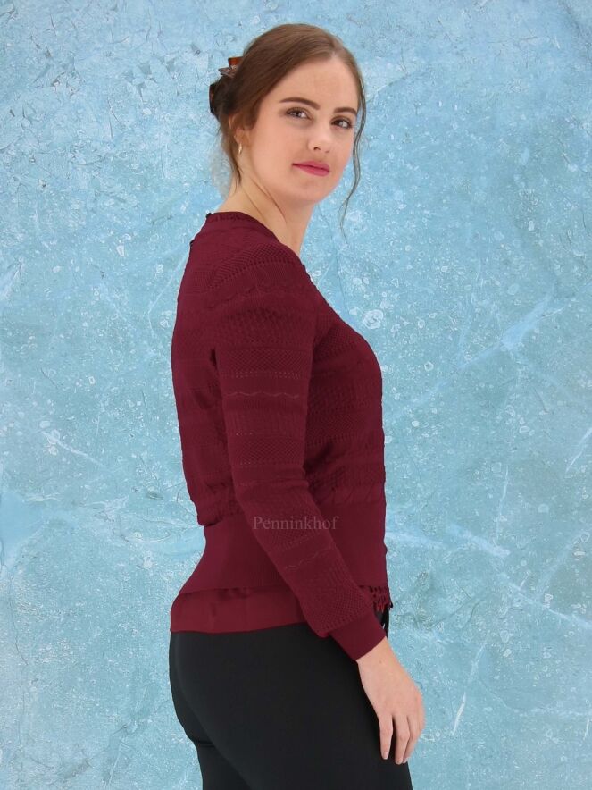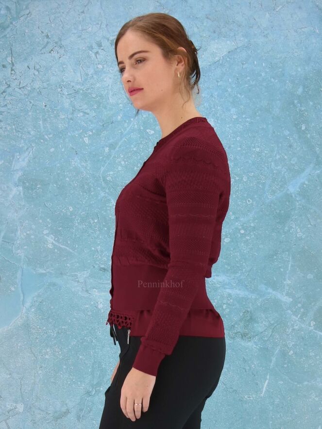 Een open gebreid vest van High in verschillende kant patronen in de kleur bordeauxrood. Het vest heeft aan de onderkant en aan het uiteinde van de mouwen een brede fijn geribbelde tricot boord. Dit vest mag op de hand worden gewassen.