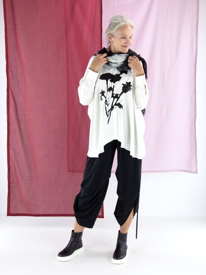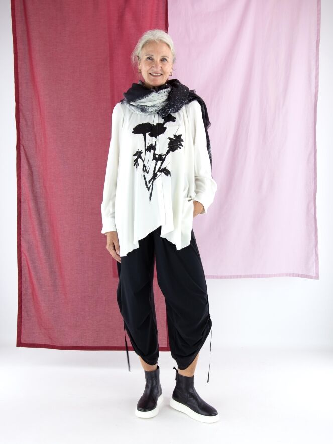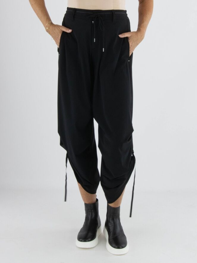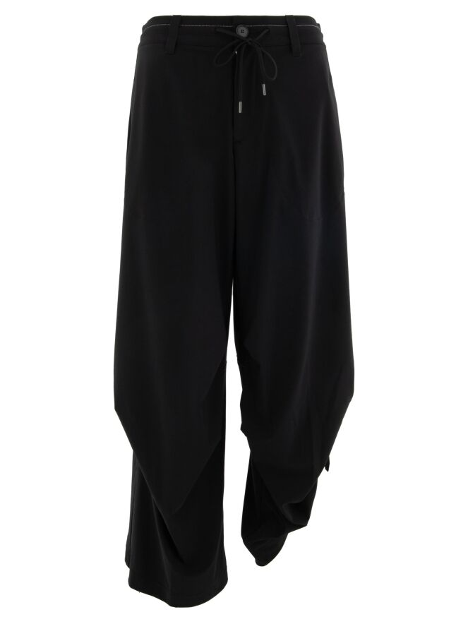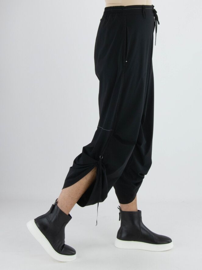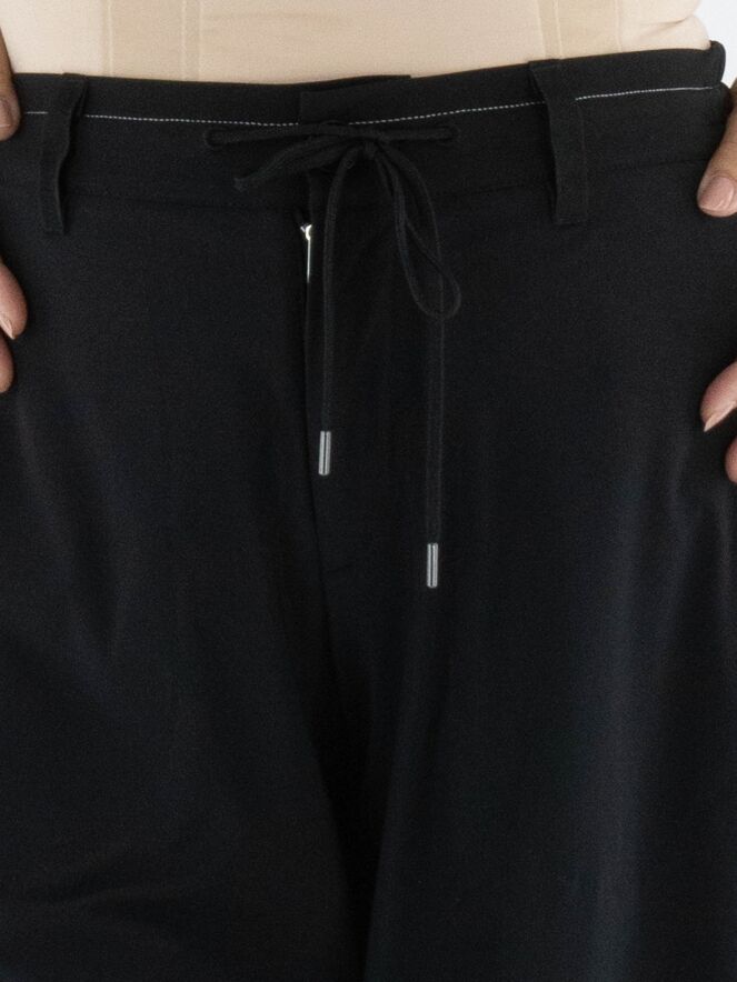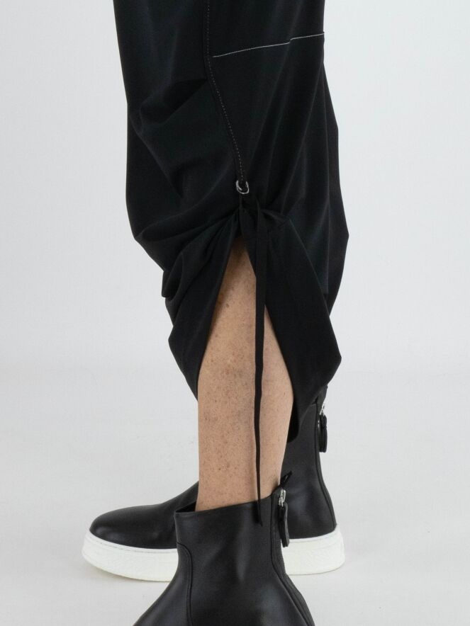 Een broek van High in de kleur zwart. Aan de achterkant van de taille zit een fijn geplooide elastische band. Daarnaast is er een koord in een tunnelverwerking verwerkt. Langs de naden is op meerdere plaatsen wit stikdraad gebruikt als decoratief detail. Aan de onderkant bevindt zich aan beide zijkanten een lint waarmee, via een ringsluiting, een ophaaleffect kan worden gecreëerd. De broek heeft steekzakken en mag met de hand worden gewassen.