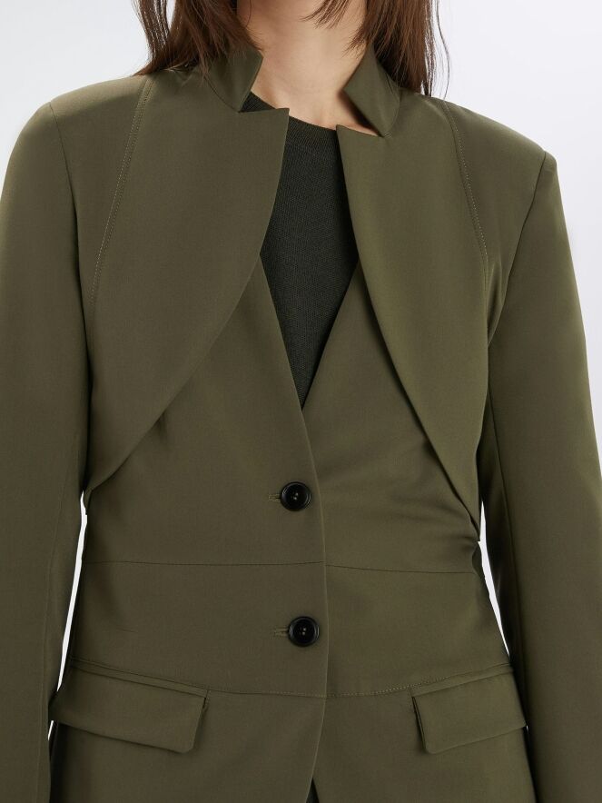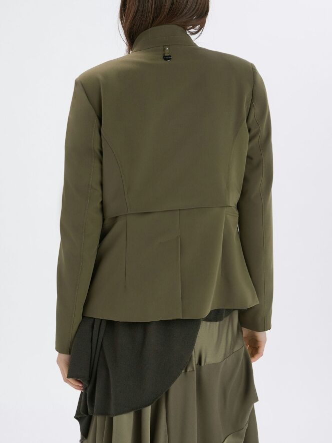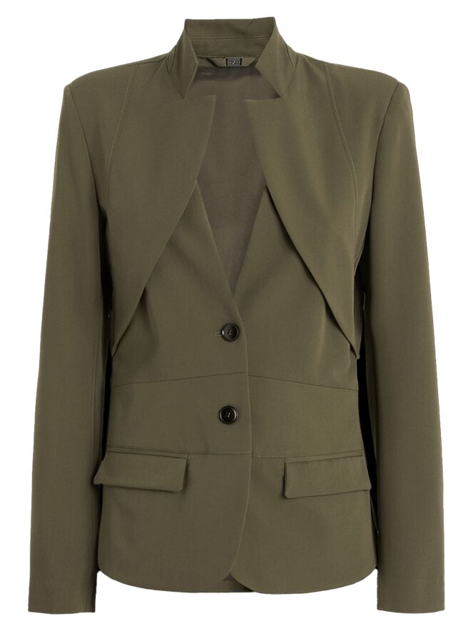 Een blazer van High in een olijfgroene kleur. Aan de voorzijde loopt vanuit de mouwinzet een tweede laag stof die deels als revers fungeert. De blazer heeft een sluiting met twee knopen en is volledig gevoerd. Deze blazer mag niet worden gewassen.