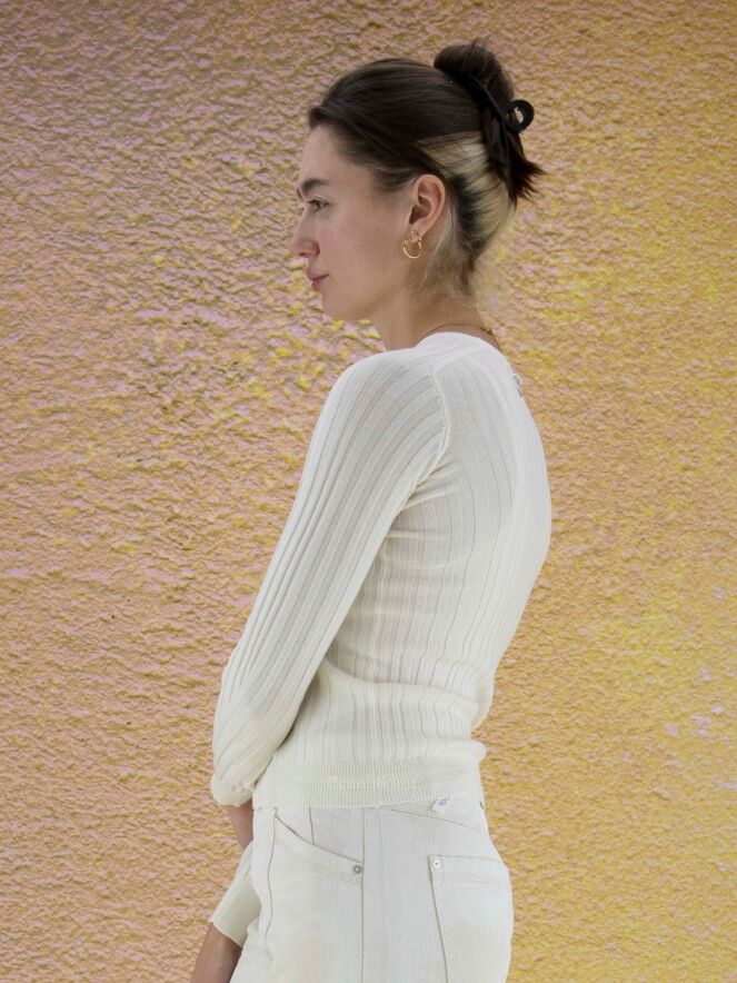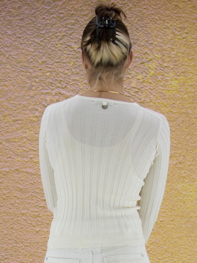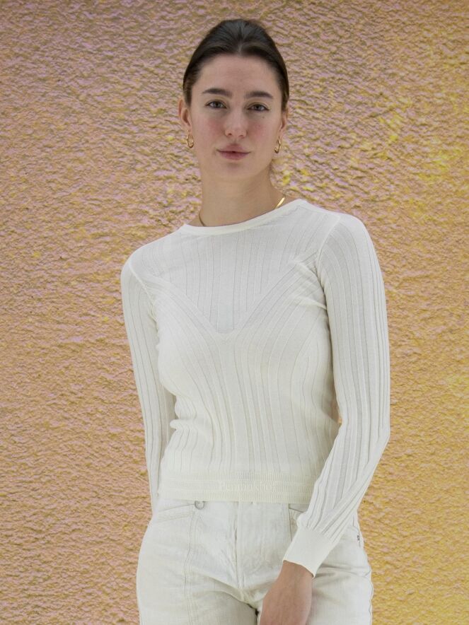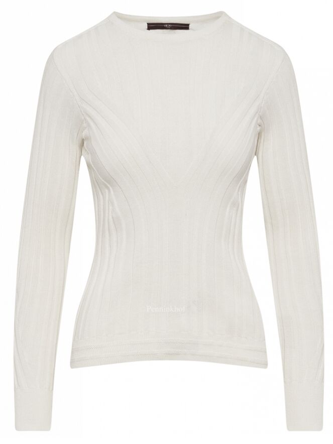Een pullover van High in een verticale strepen structuur in de kleur roomwit. De pullover heeft een ronde hals en lange mouwen. Deze pullover mag op de hand worden gewassen.