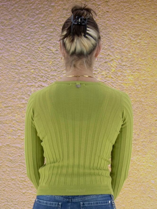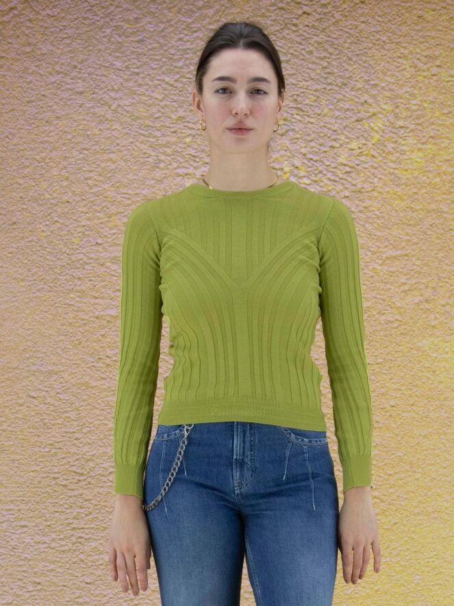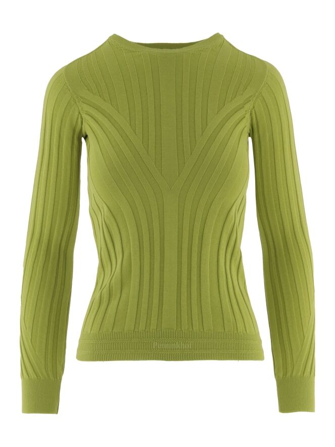 Een pullover van High in een brede ribbel structuur in de kleur groen. Aan het uiteinde van de lange mouwen is een brede fijn geribbelde tricot boord. De pullover heeft een hoge ronde hals en mag op de hand worden gewassen.