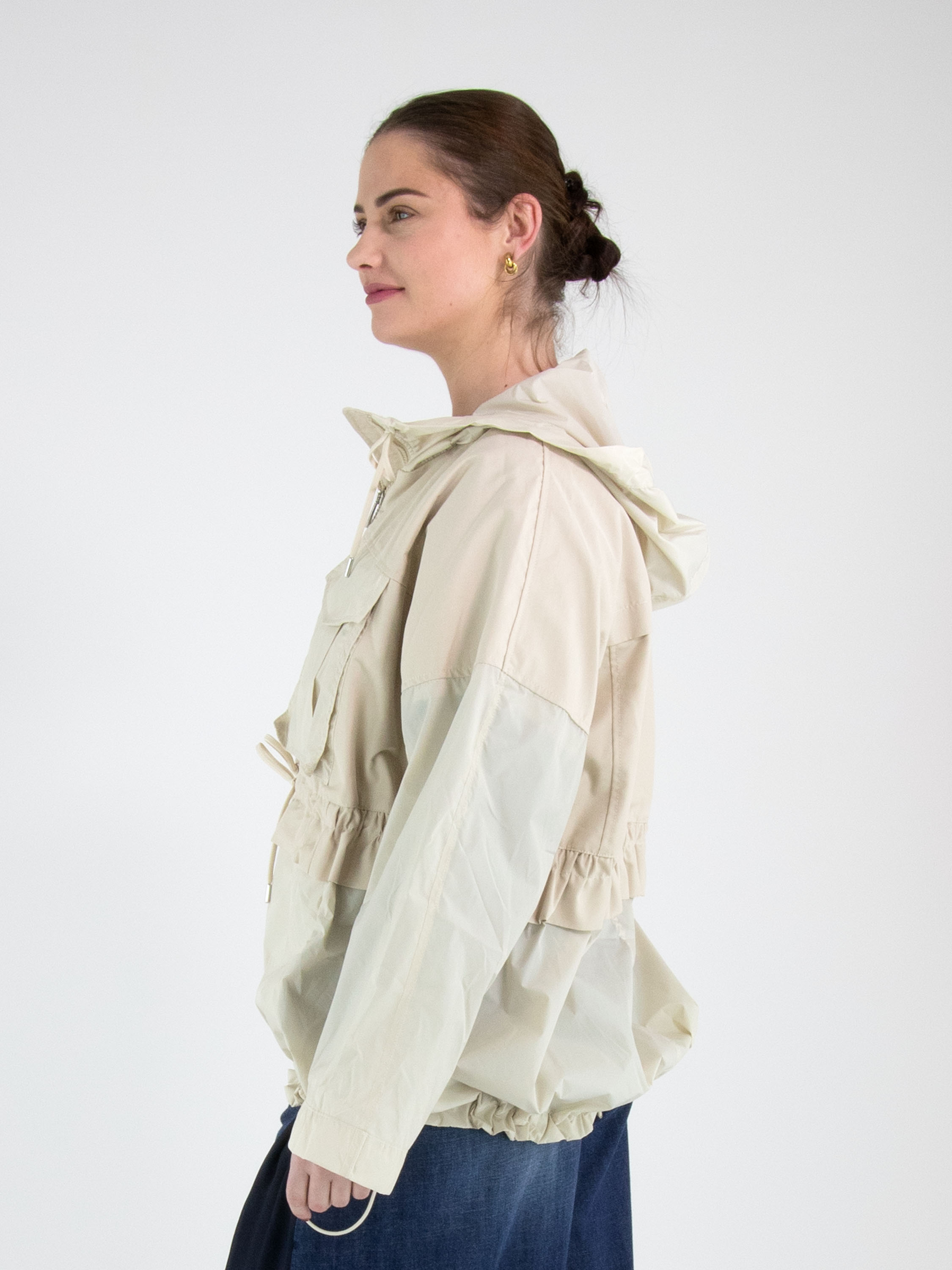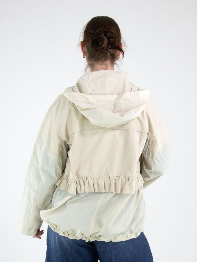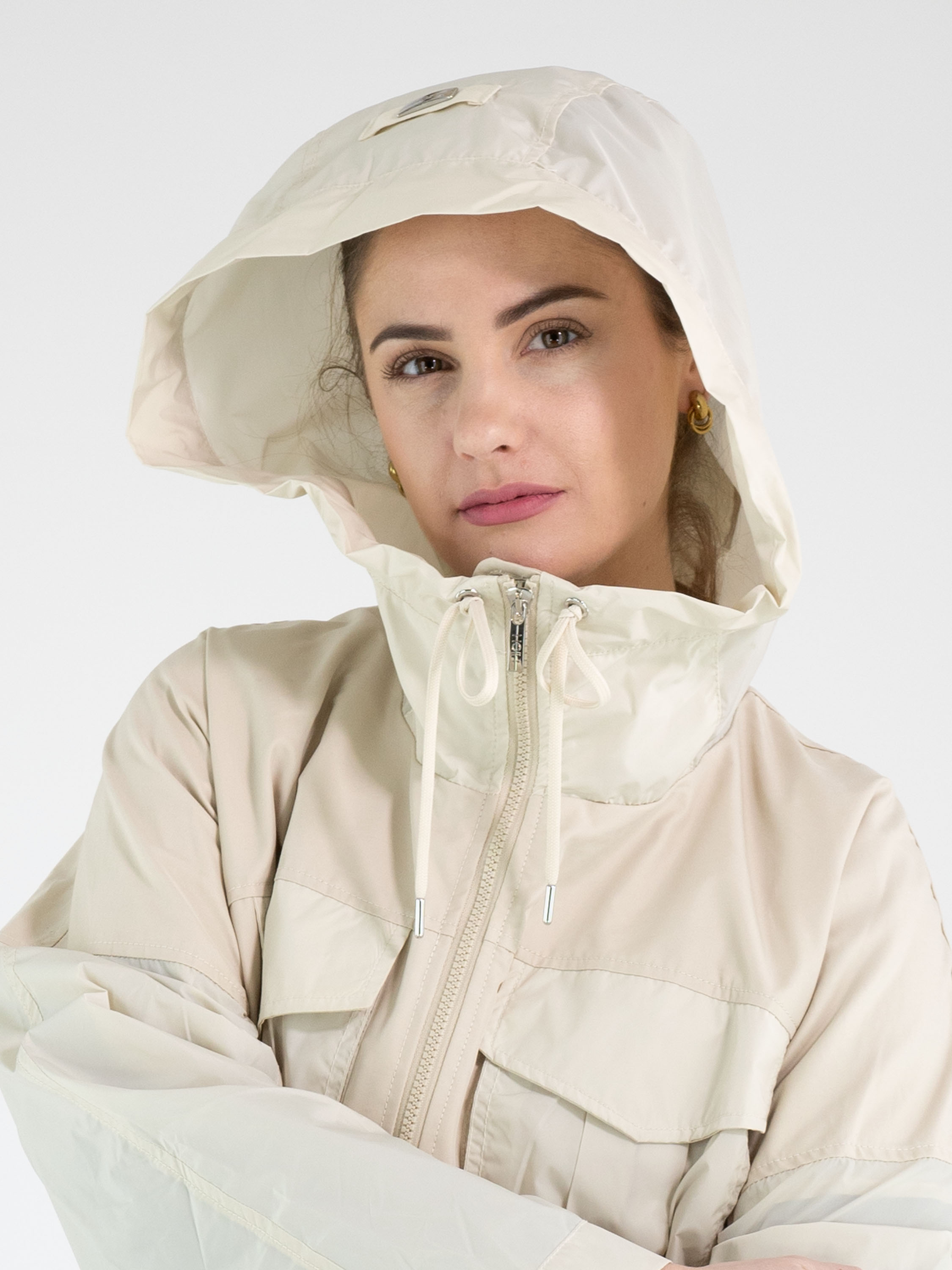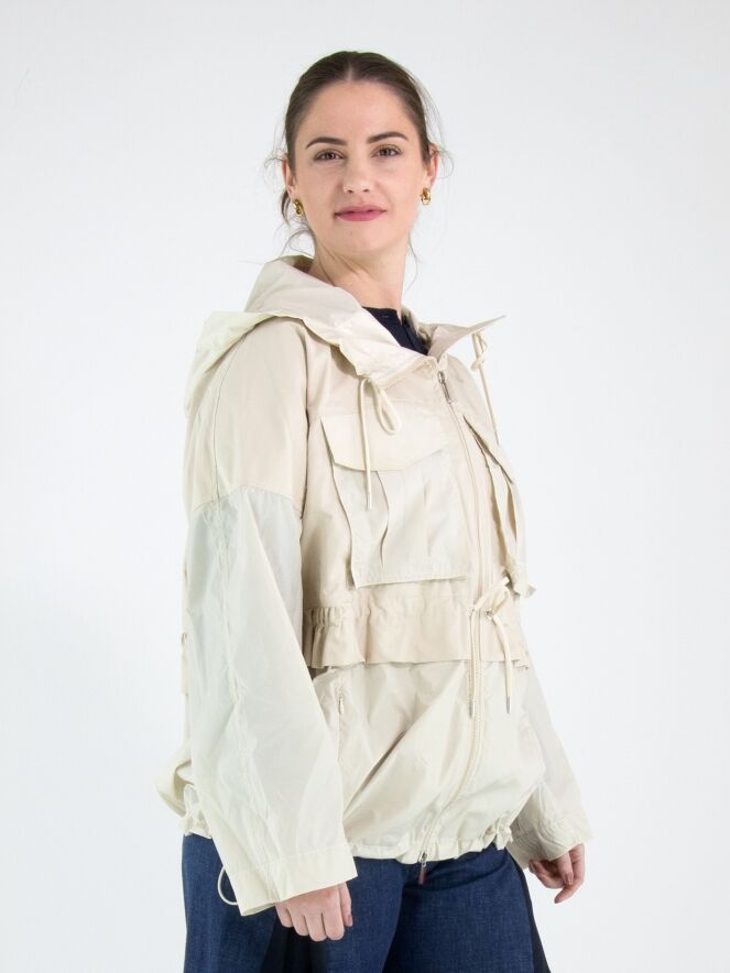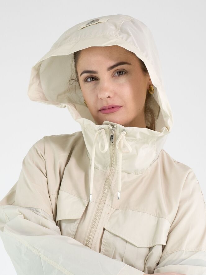Een coat van High in een beige kleur. In de rand van de capuchon is een koord in tunnelverwerking verwerkt, waarmee de capuchon kan worden aangetrokken. De coat heeft een ritssluiting en de steekzakken zijn eveneens voorzien van een ritssluiting. Ter hoogte van de taille en aan de onderkant loopt een stiknaad met een koord in tunnelverwerking, waarmee een plooieffect kan worden gecreëerd. De coat heeft borstzakken en mag niet worden gewassen.