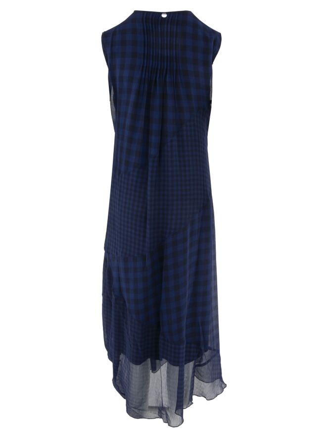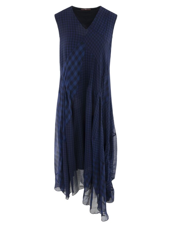Een jurk van High in een matte satijnen stof, met daarover een transparante geblokte stof in meerdere tinten blauw. De geblokte stof is op enkele punten geplisseerd en geplooid en opgedeeld door meerdere diagonale naden. Vanuit de taille loopt de jurk uit in een A-lijn. Deze jurk kan met de hand worden gewassen.