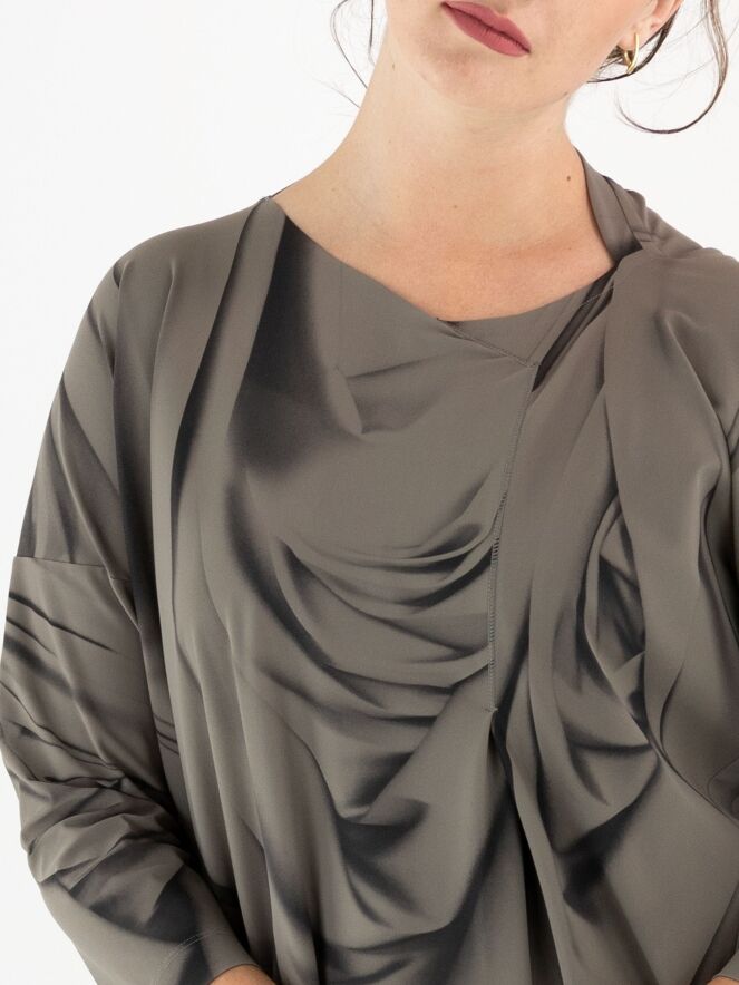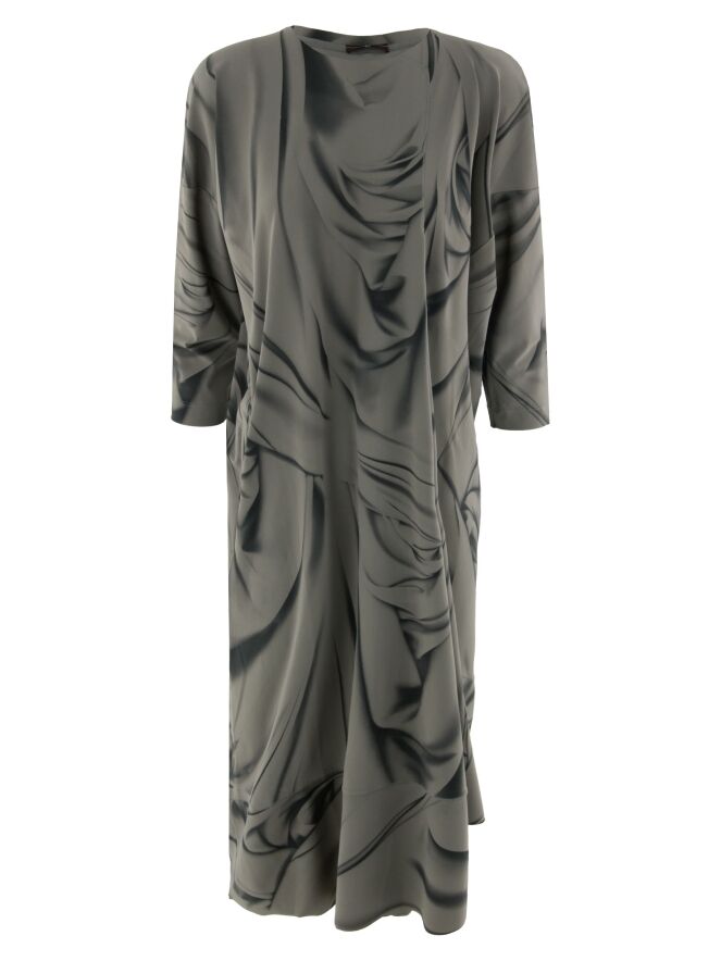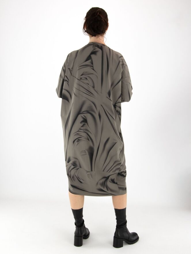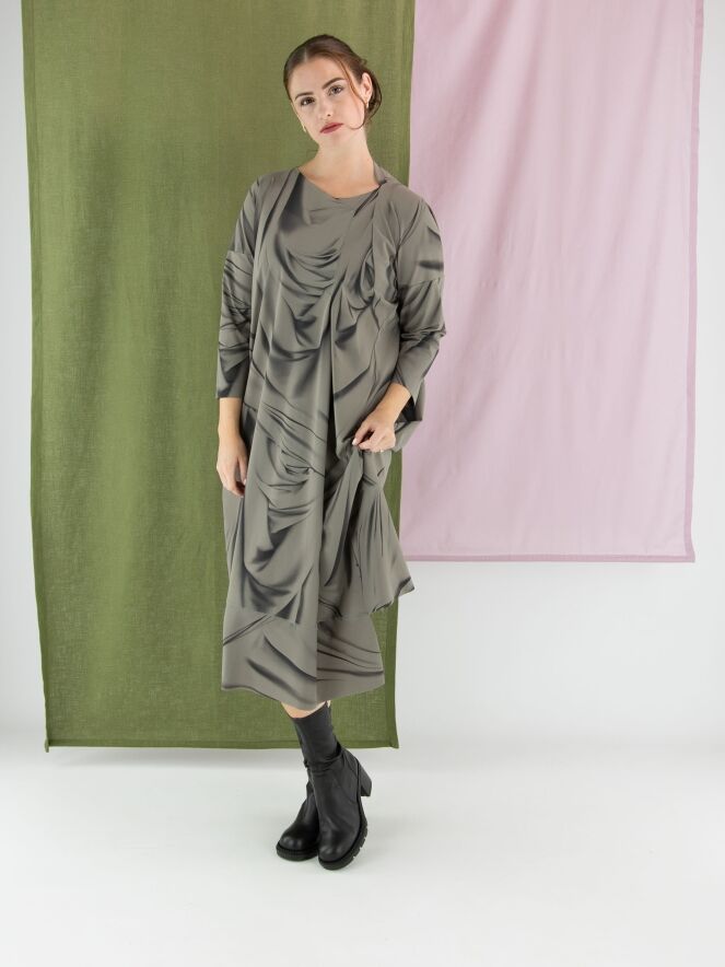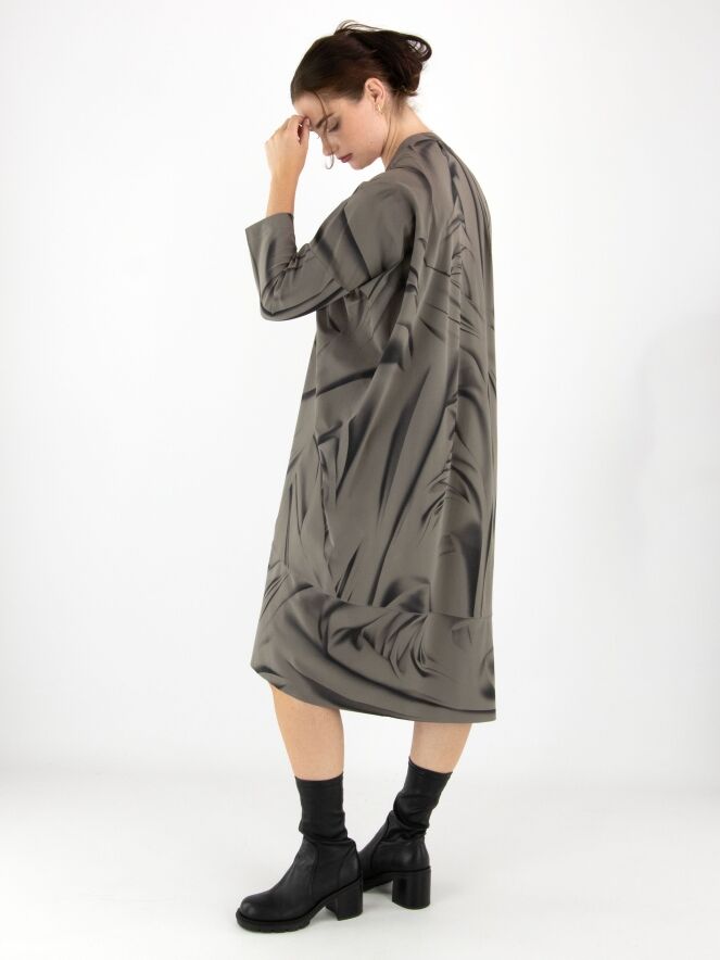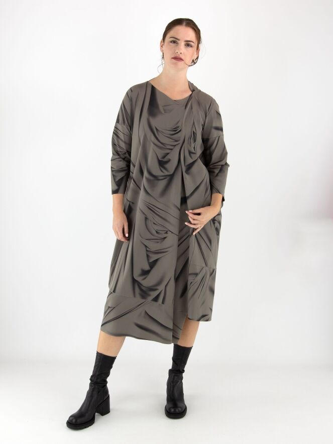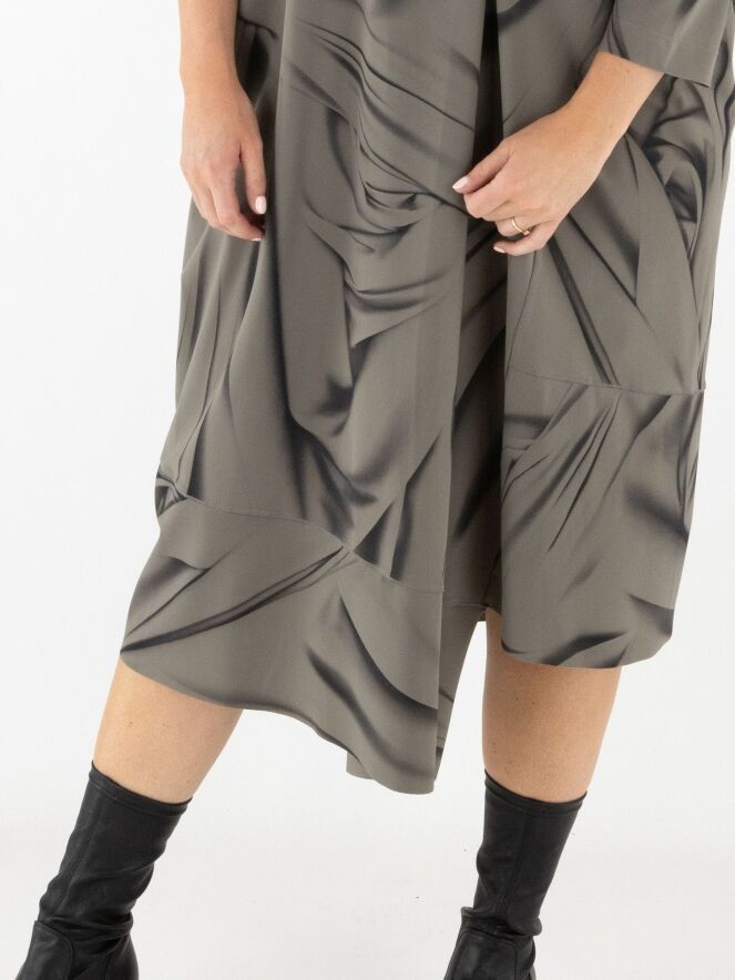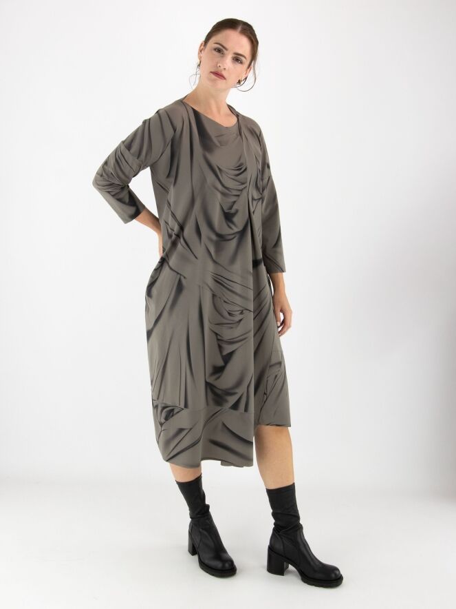 Een jurk van High in een grafische geveegde print met de kleuren zwart en taupe. De rand van de asymmetrische hals heeft een decoratieve overslag. Aan de rechterzijde, ter hoogte van de taille, bevindt zich een steekzak. De jurk heeft halflange mouwen en mag op 30 graden worden gewassen.
