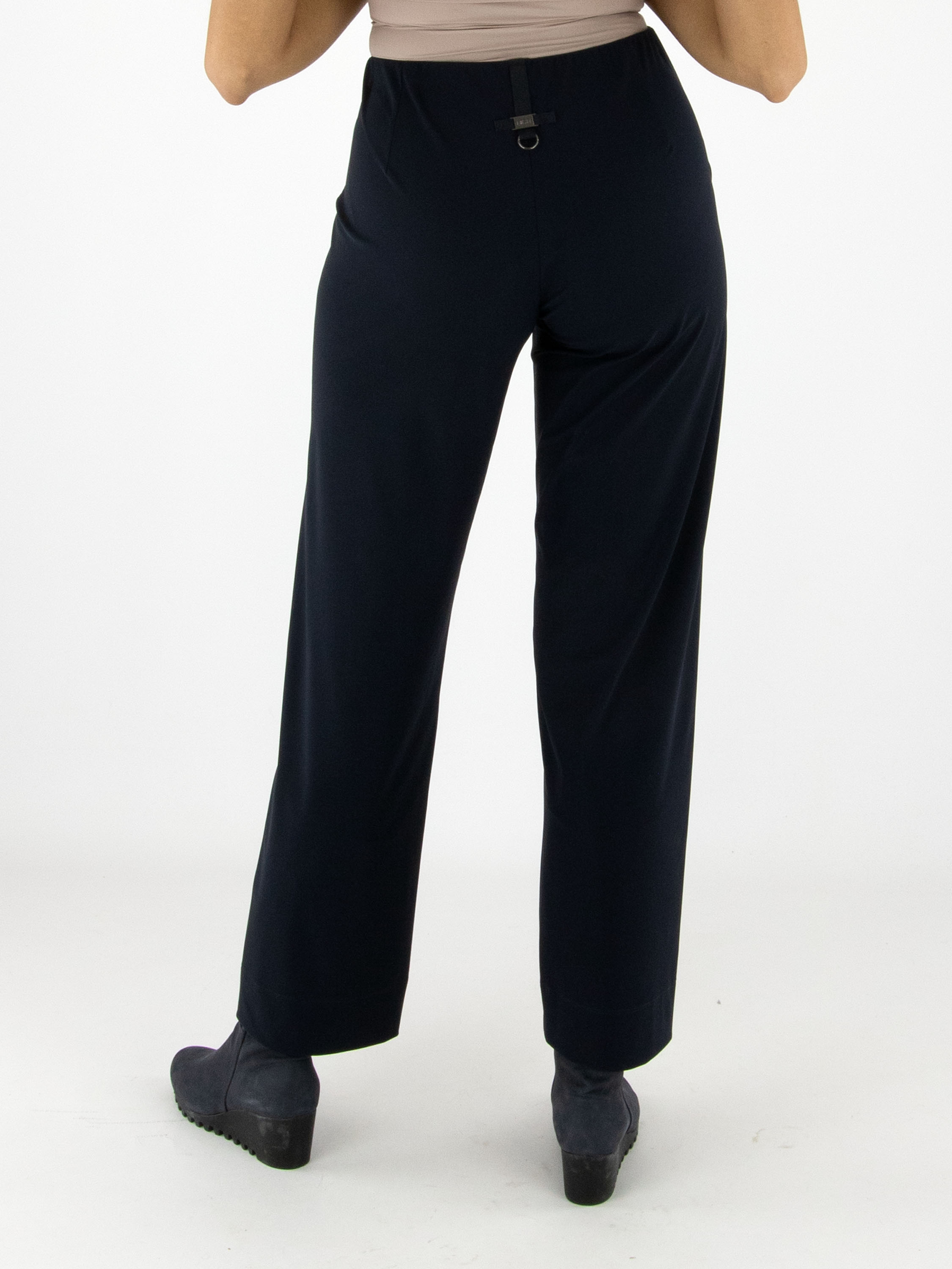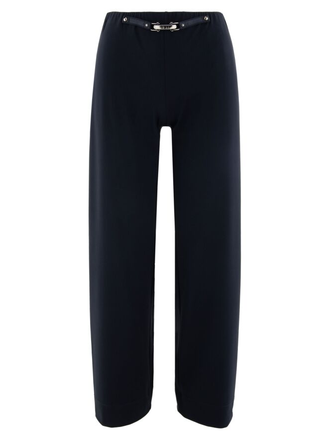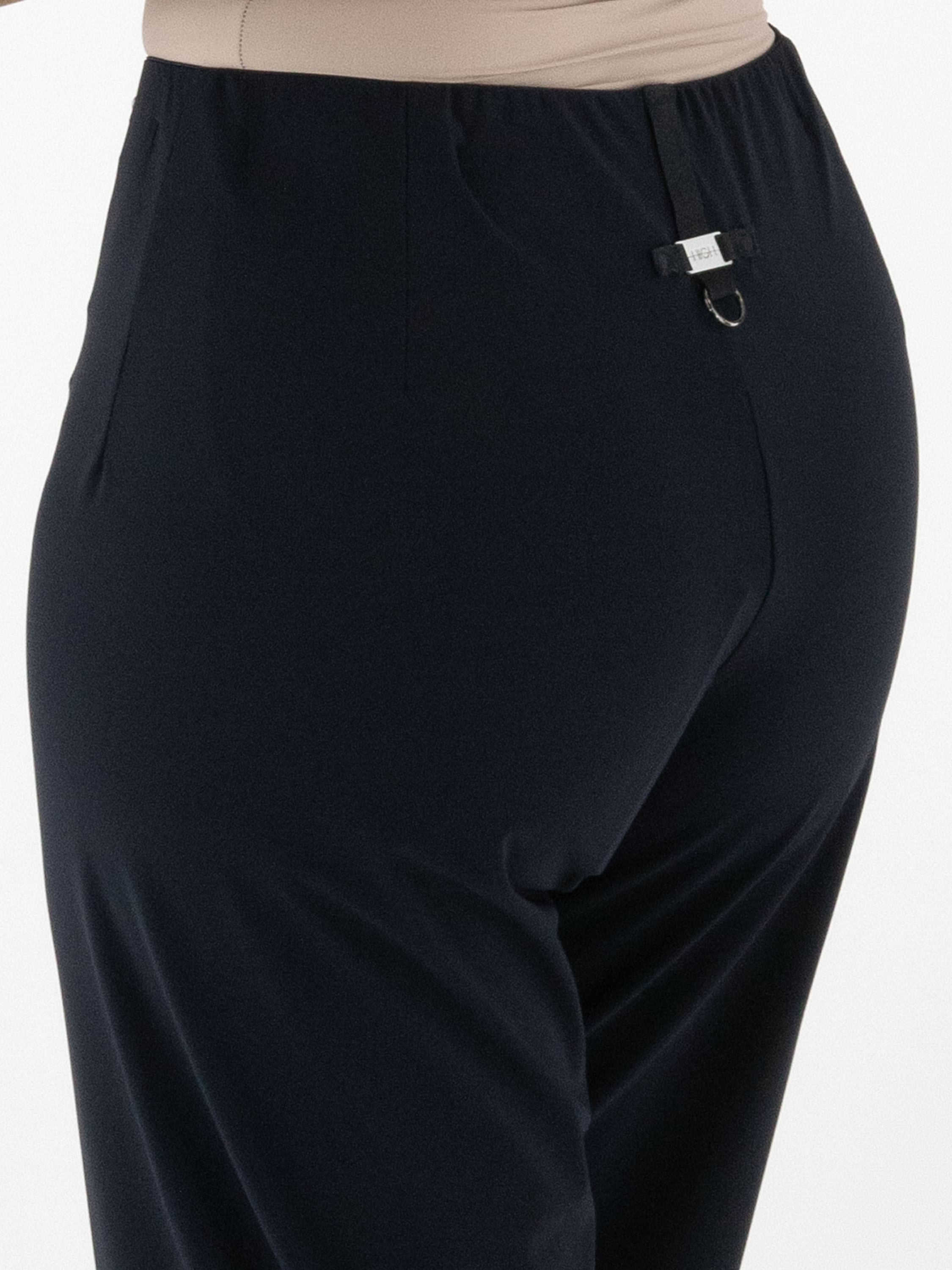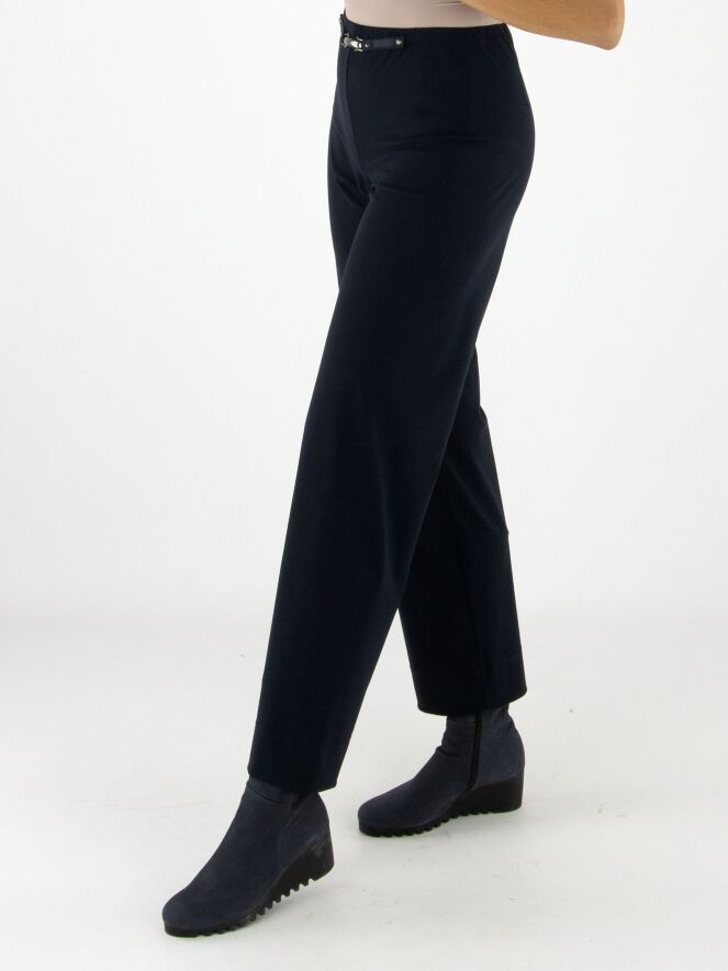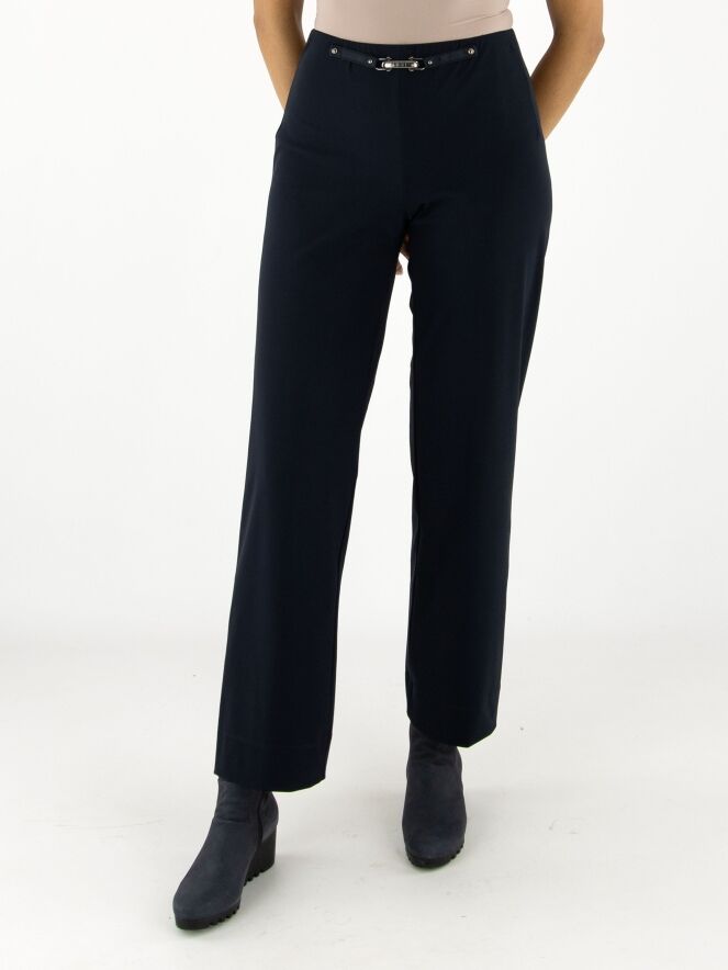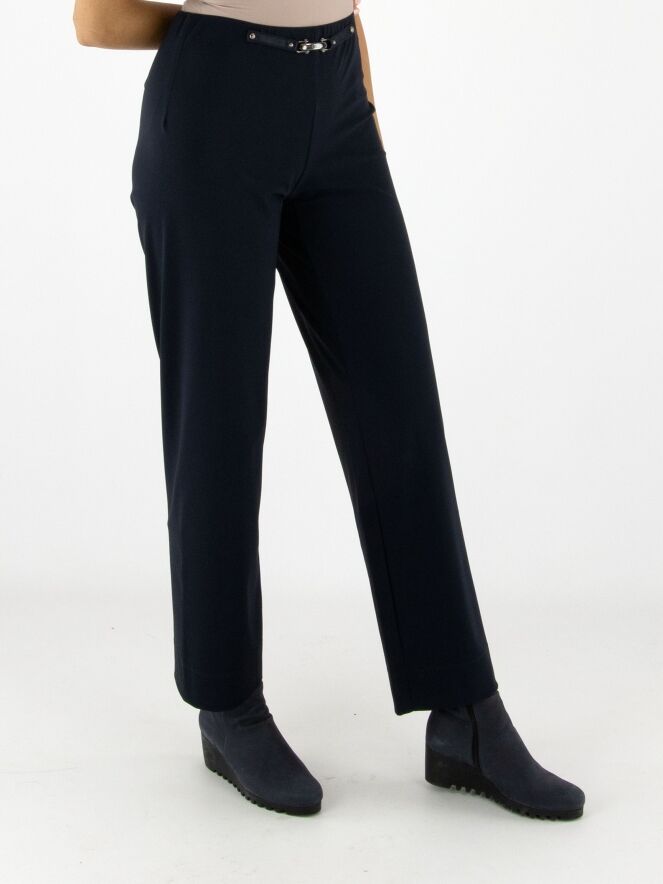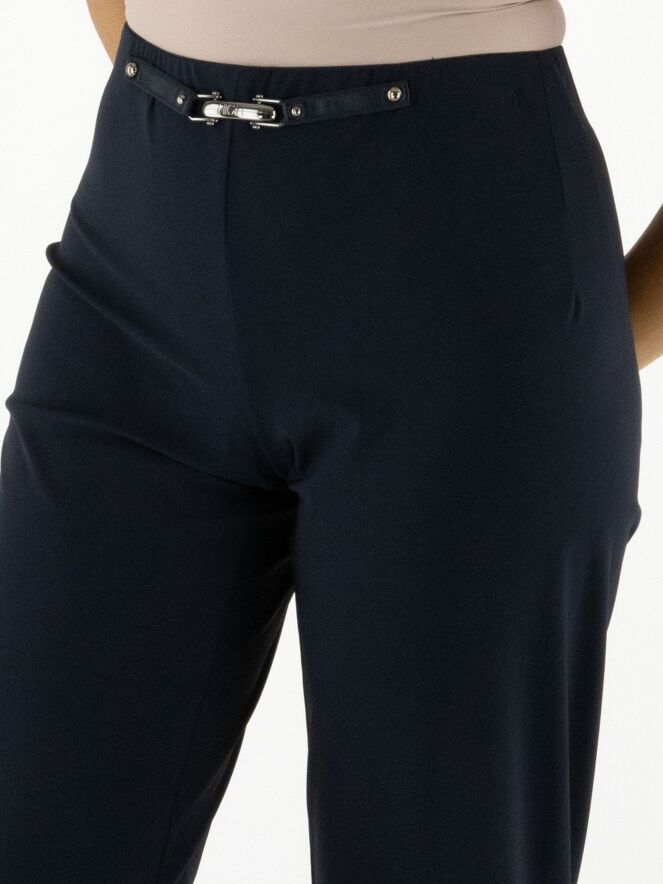 Een broek van High in de kleur marineblauw. In de taille zit een elastische band. Aan de voorzijde, ter hoogte van de taille, bevindt zich een decoratieve nikkelkleurige gesp met twee studs. Deze broek mag op 30 graden worden gewassen.