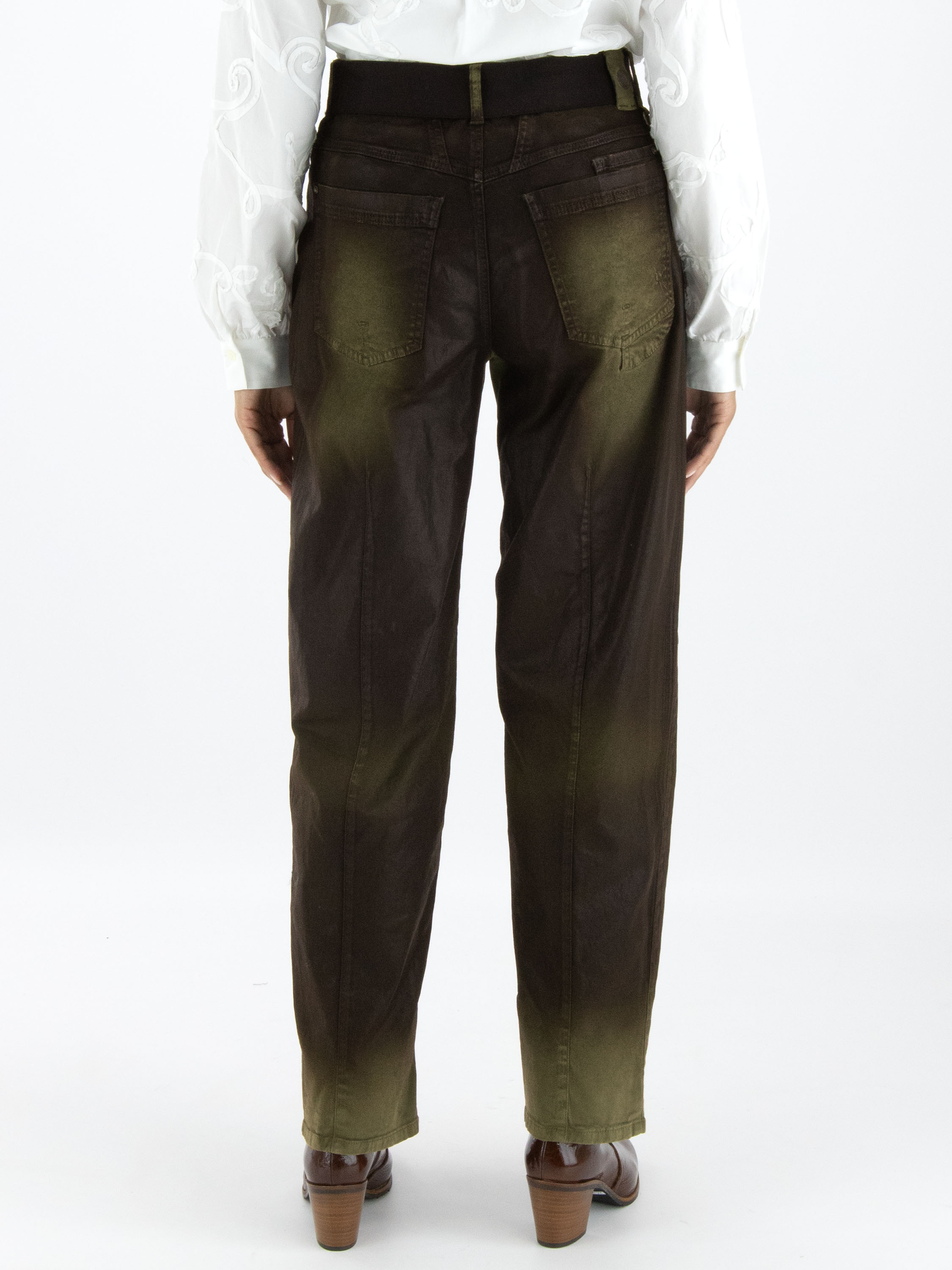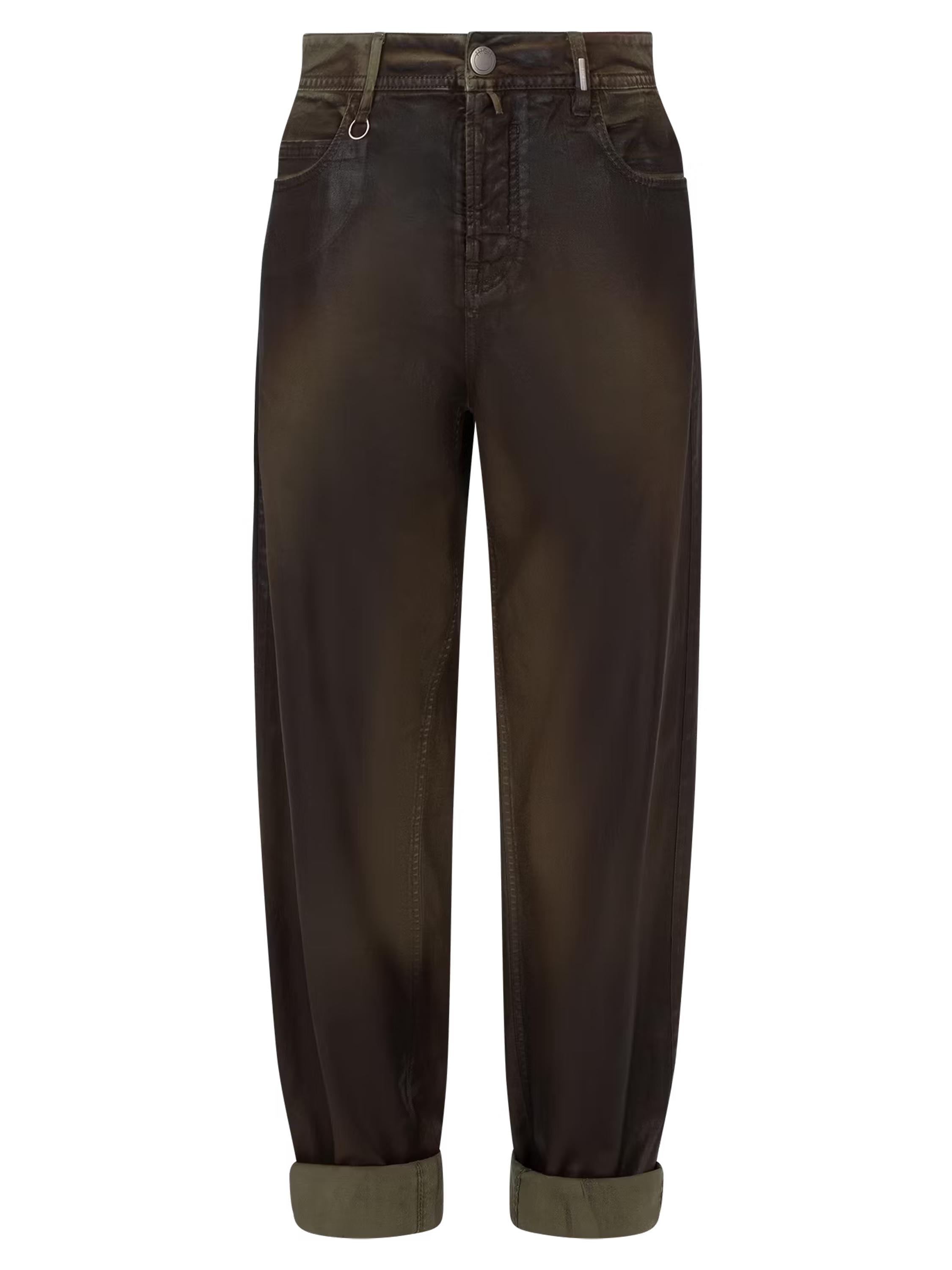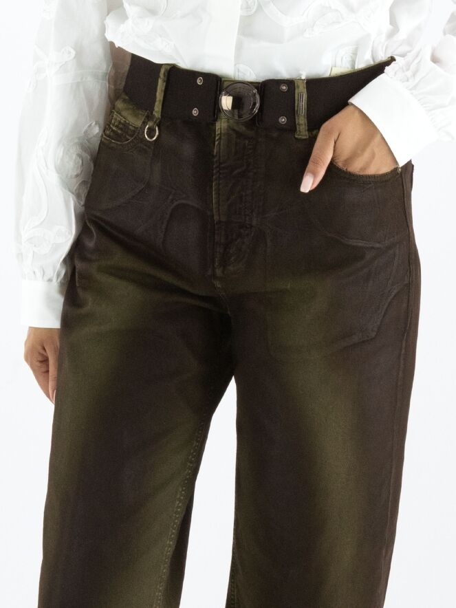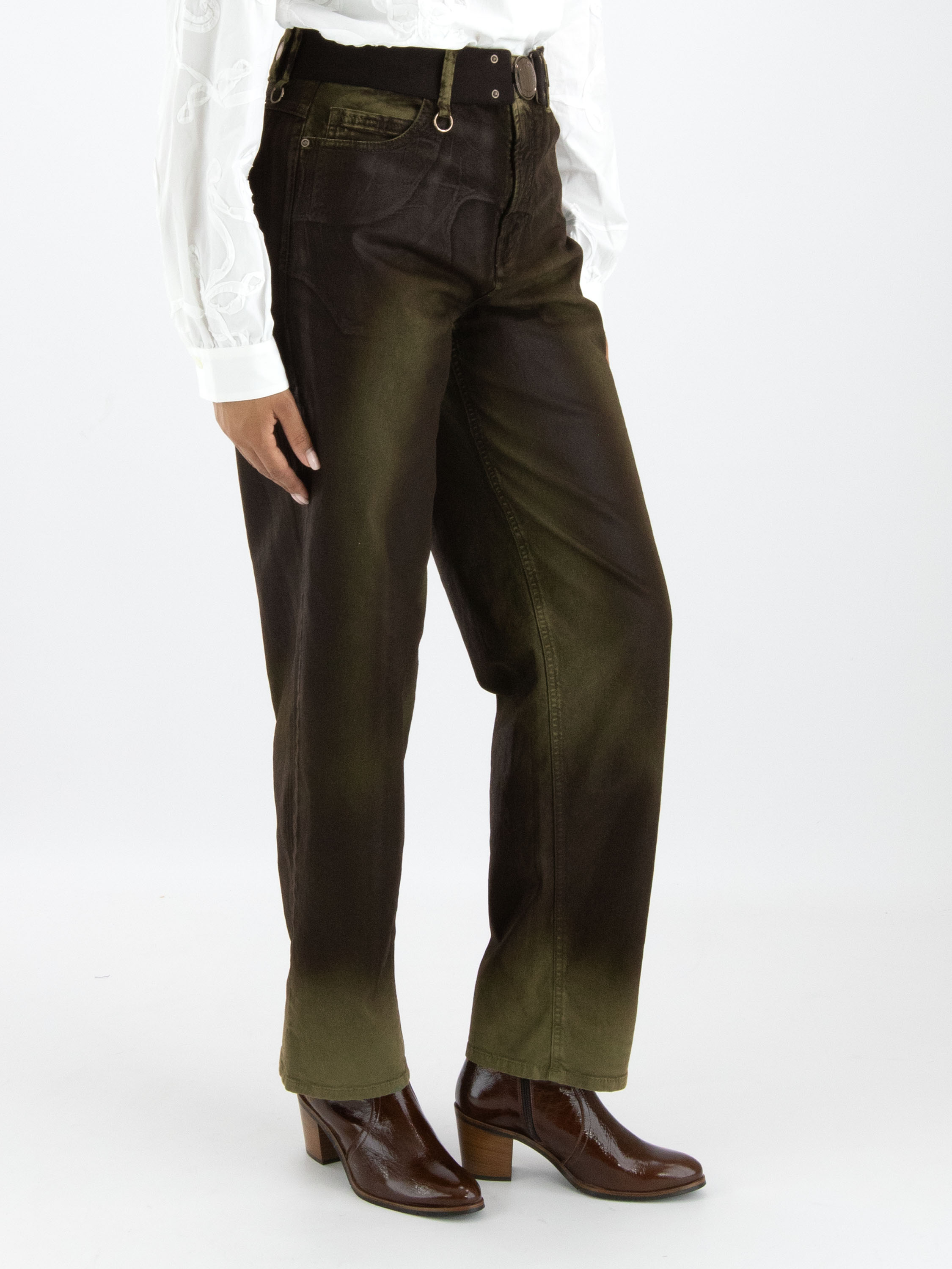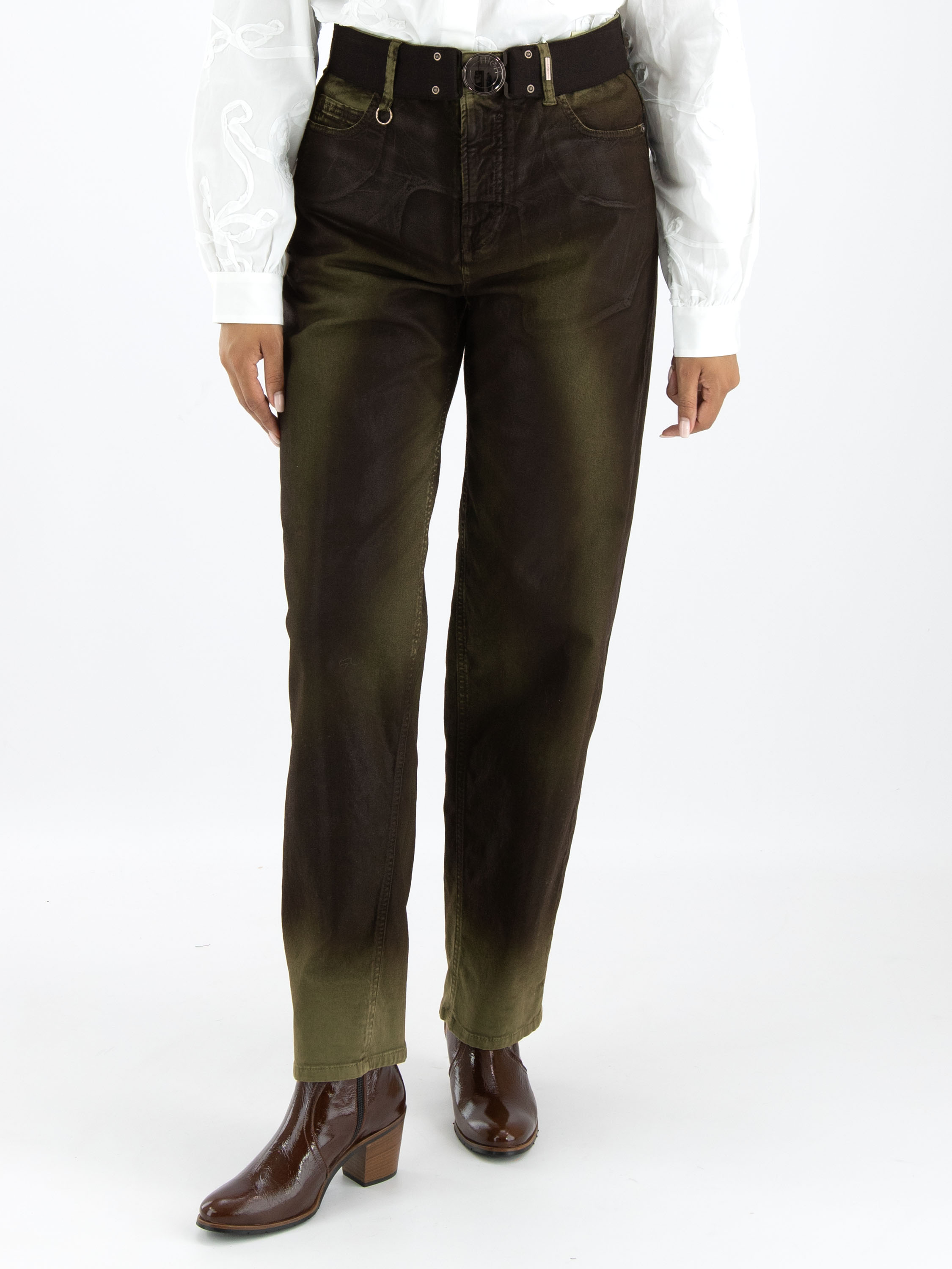 Een luxe gewaxte jeans in een dégradé look door de wassing met meerdere tinten khaki. In de taille is een zwarte elastieken ceintuur met een nikkelkleurige ronde gesp. De jeans is in een 5-pocketmodel en mag met de hand worden gewassen.