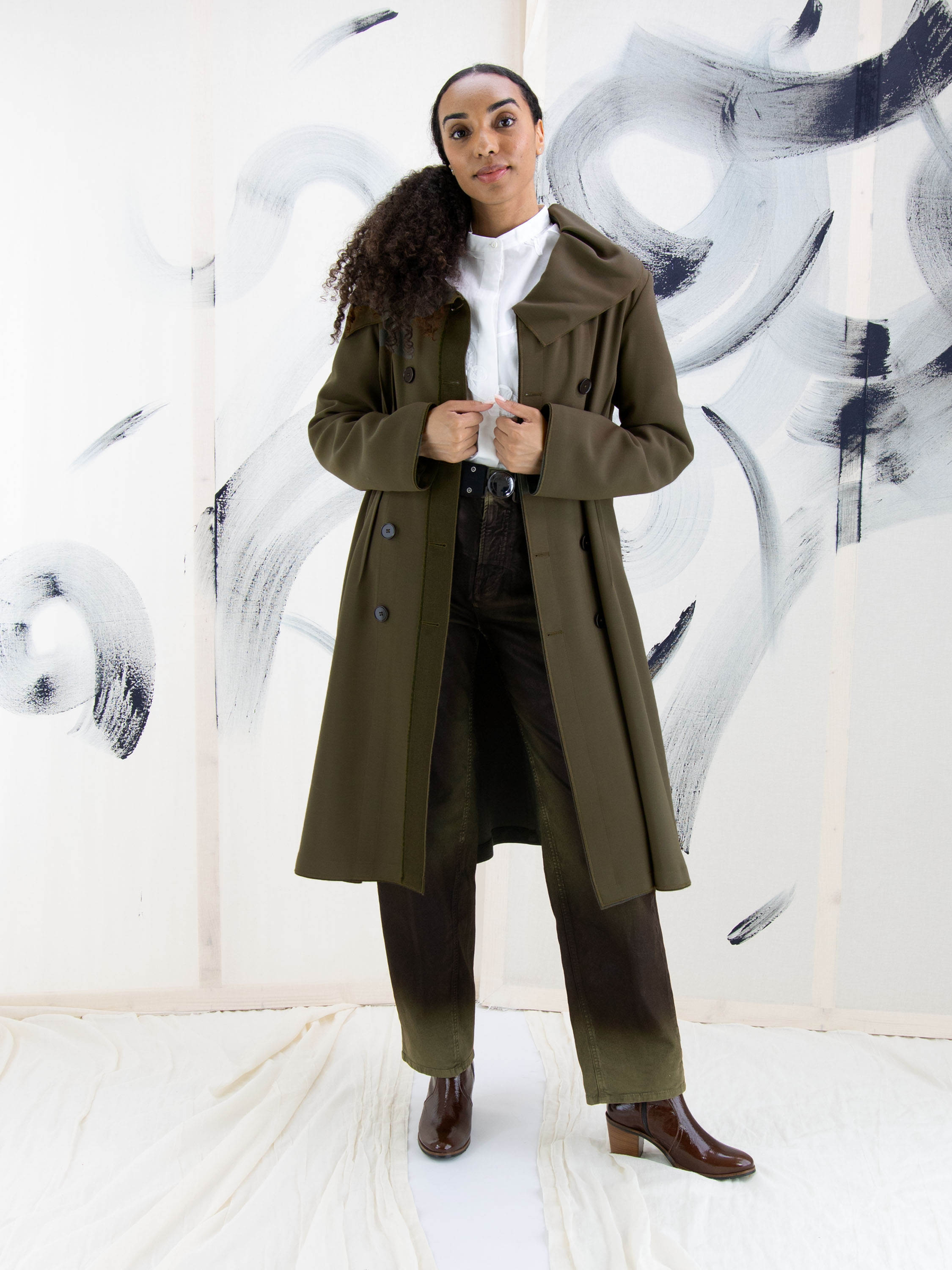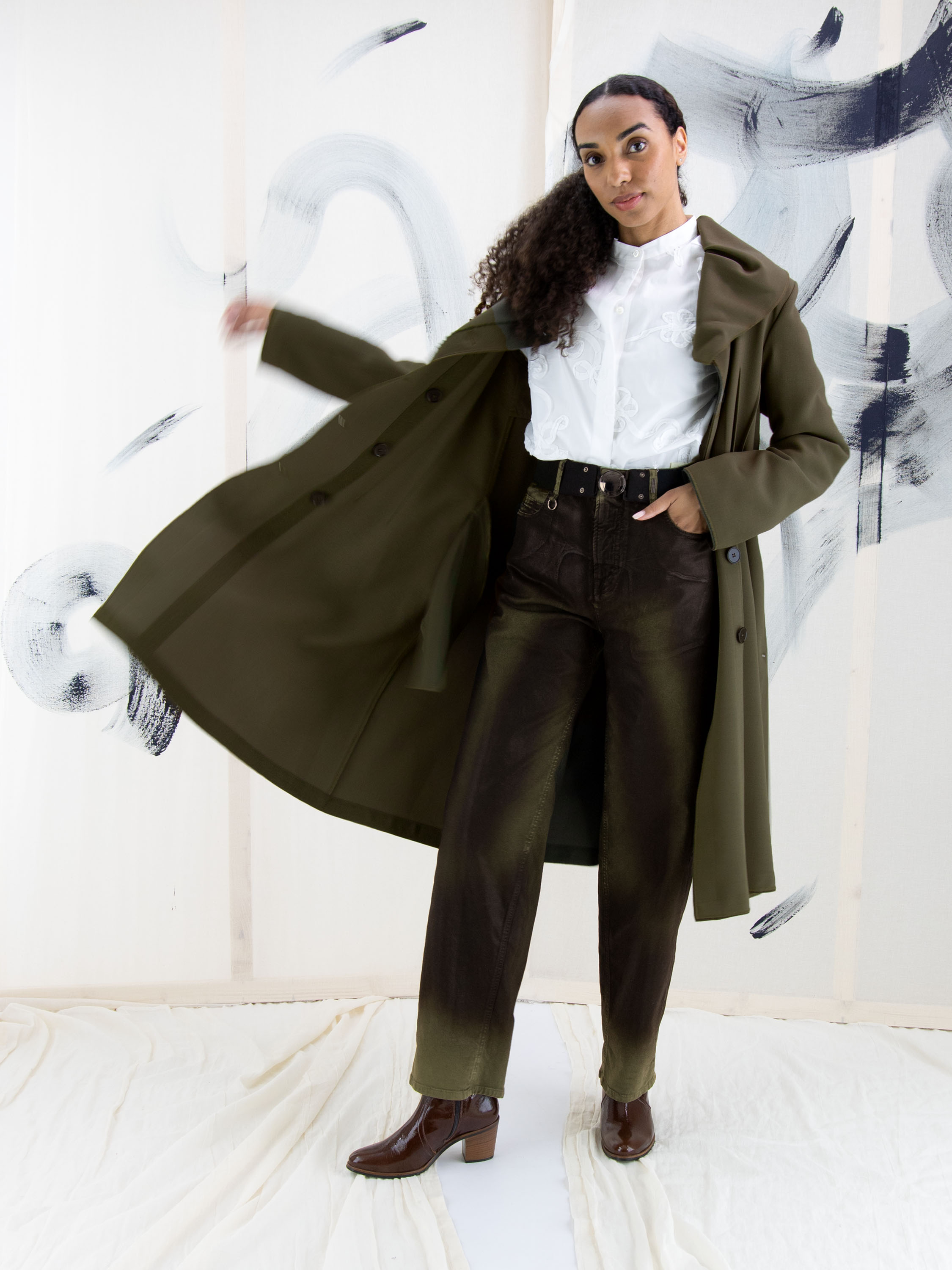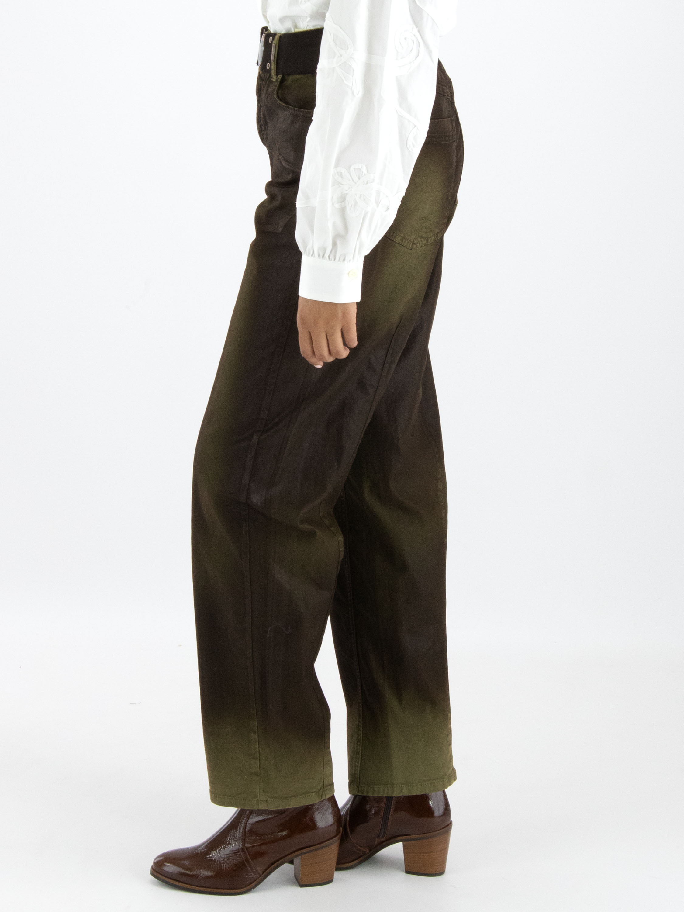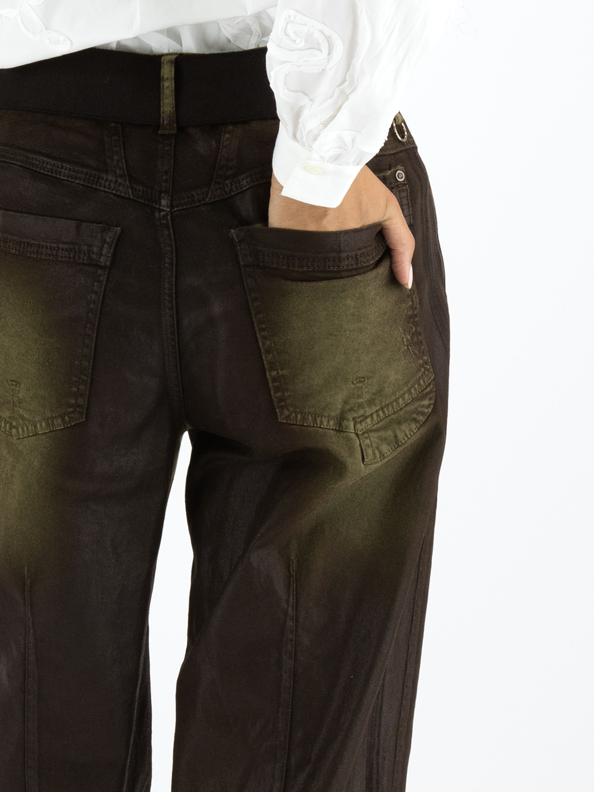 Een luxe gewaxte jeans in een dégradé look door de wassing met meerdere tinten khaki. In de taille is een zwarte elastieken ceintuur met een nikkelkleurige ronde gesp. De jeans is in een 5-pocketmodel en mag met de hand worden gewassen.