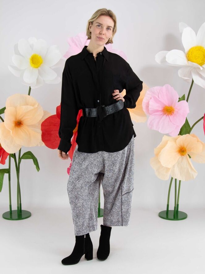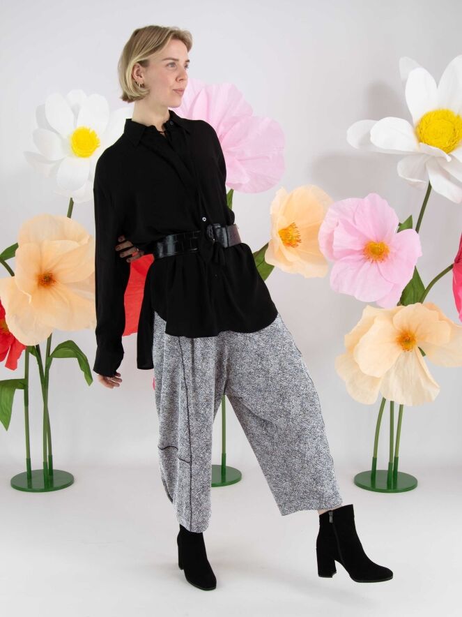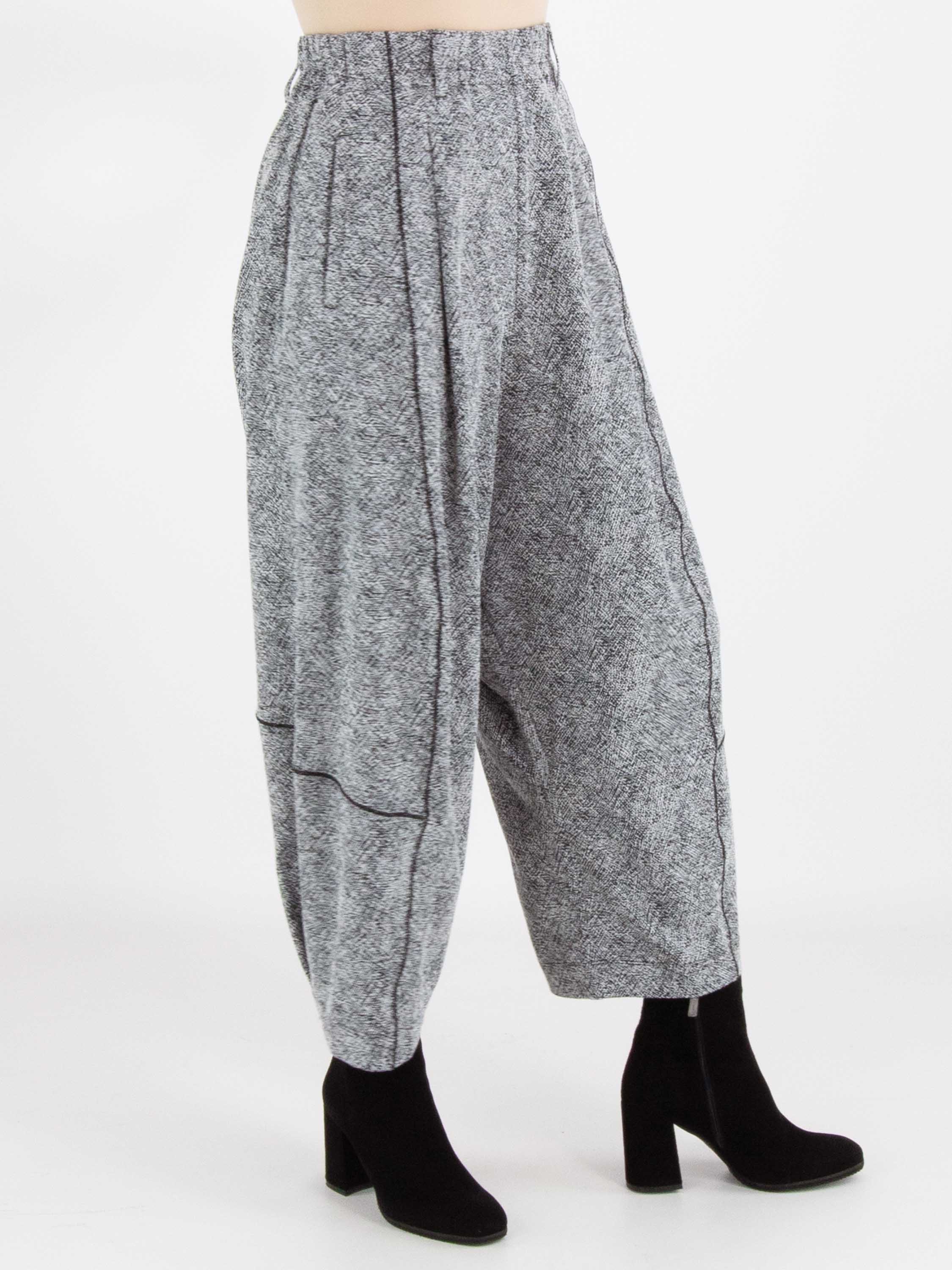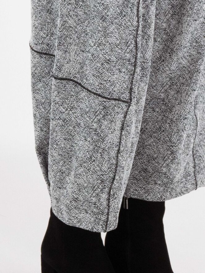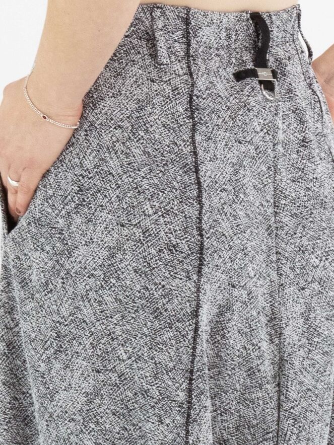 Een gemêleerde broek van High Tech met de kleuren zwart en wit. In de taille is een elastieken band. De broek heeft enkele decoratieve zwarte stiknaden. De broek heeft steekzakken en mag op de hand worden gewassen.