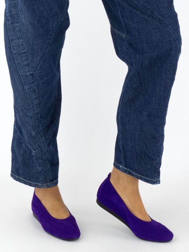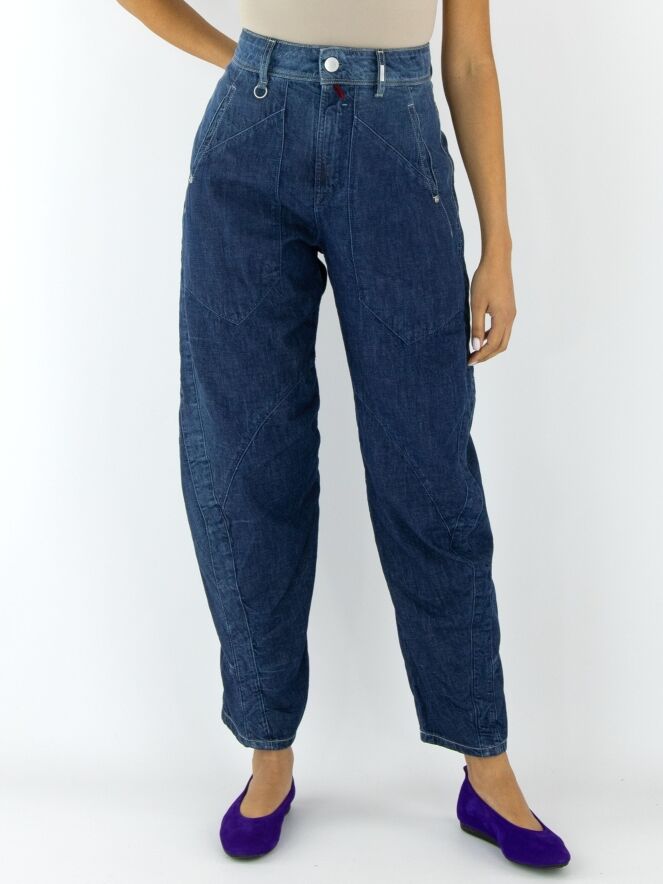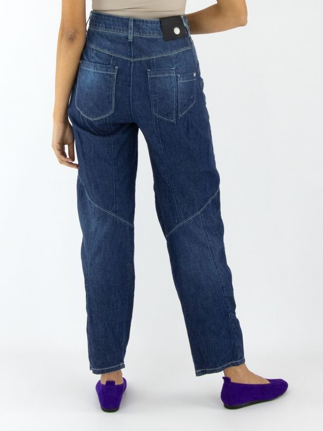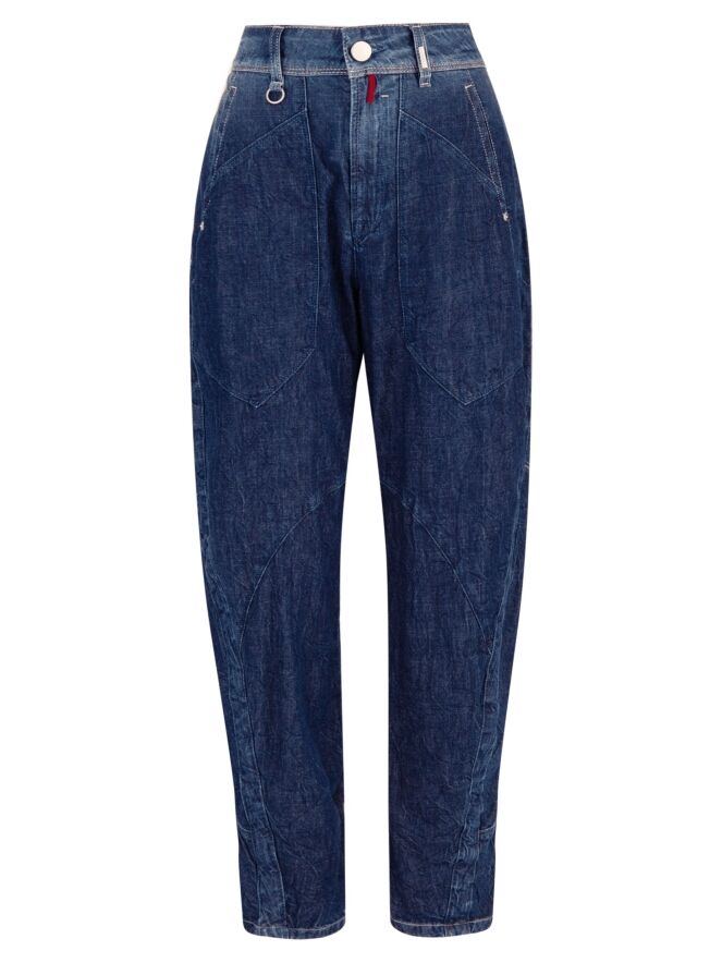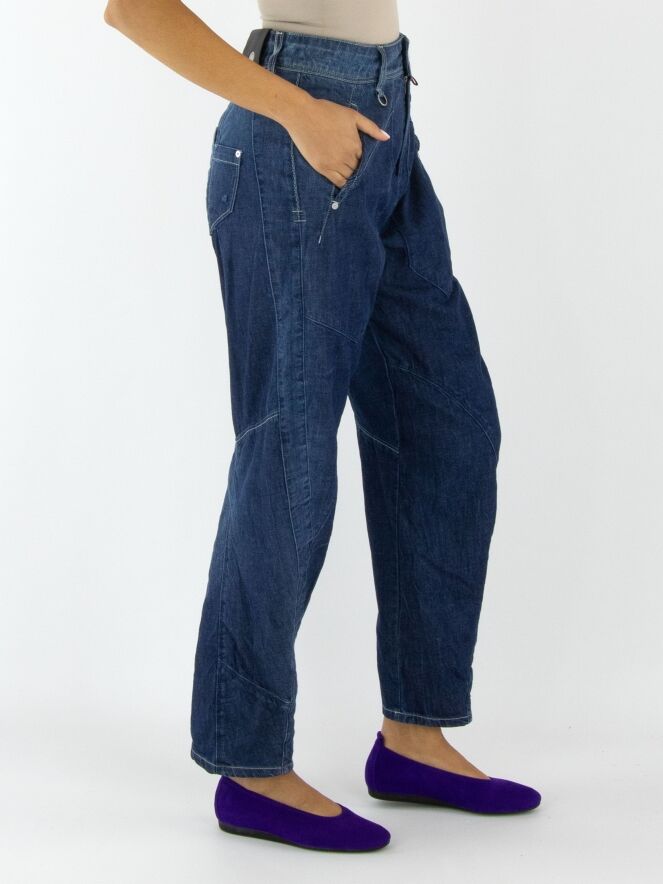 Een jeans van High in een zachte kwaliteit in een dark denim kleur. De jeans heeft een gekreukte look en meerdere diagonale stiknaden. Aan de achterkant is één van de zakken op een decoratieve wijze in tweeën gesplitst. De zakken aan de voorzijde zijn zeer groot. Deze jeans mag op 30 graden worden gewassen.