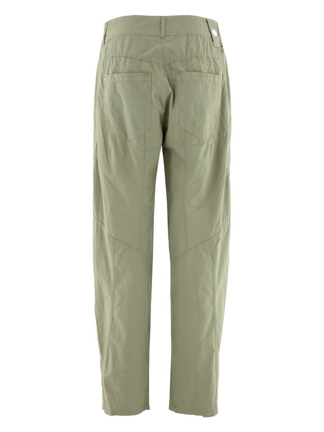 Een broek van High in een zomerse katoenkwaliteit in de kleur olijfgroen. Op de linker voorzak is een klein decoratief zakje aangebracht dat diagonaal is gestikt. De broek heeft steekzakken en kan op 30 graden worden gewassen.
