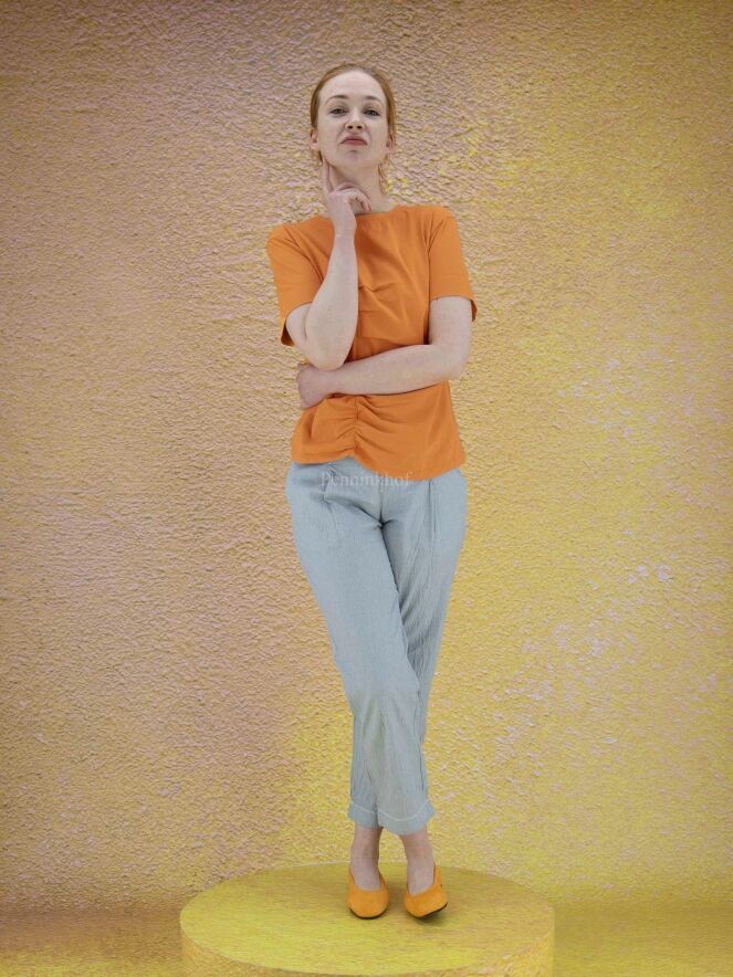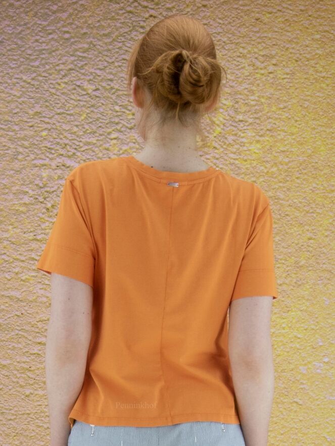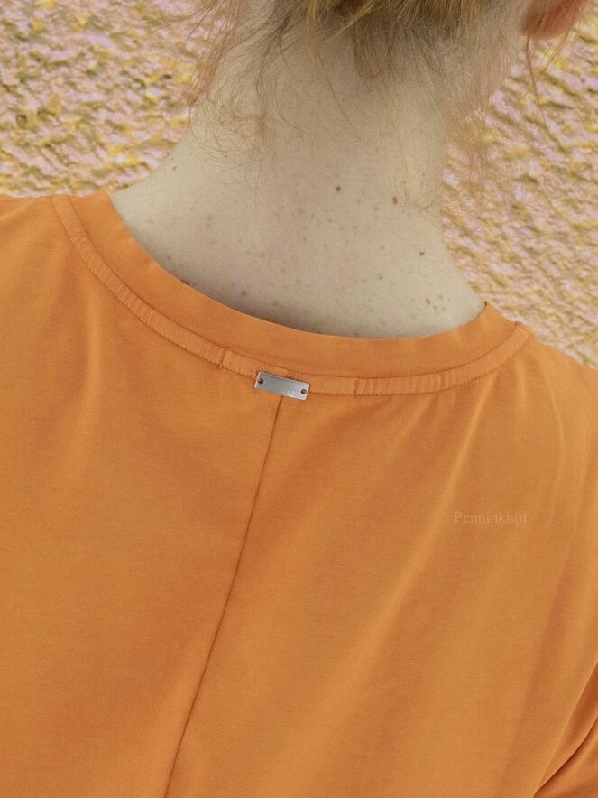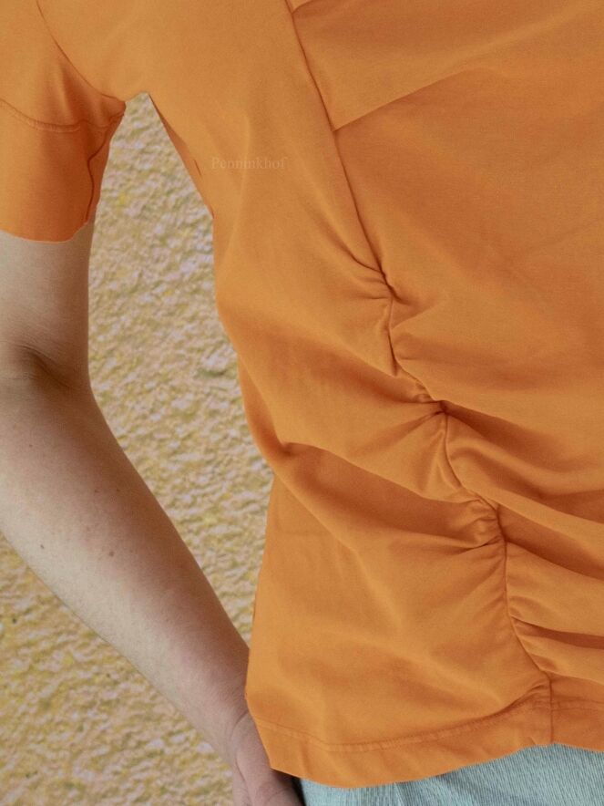 Een shirt van High in de kleur oranje. Het shirt heeft korte mouwen en een ronde hals. Aan de voorzijde van het shirt is links van het midden een stiknaad over de gehele lengte met meerdere decoratieve plooien. Dit shirt mag op de hand worden gewassen.