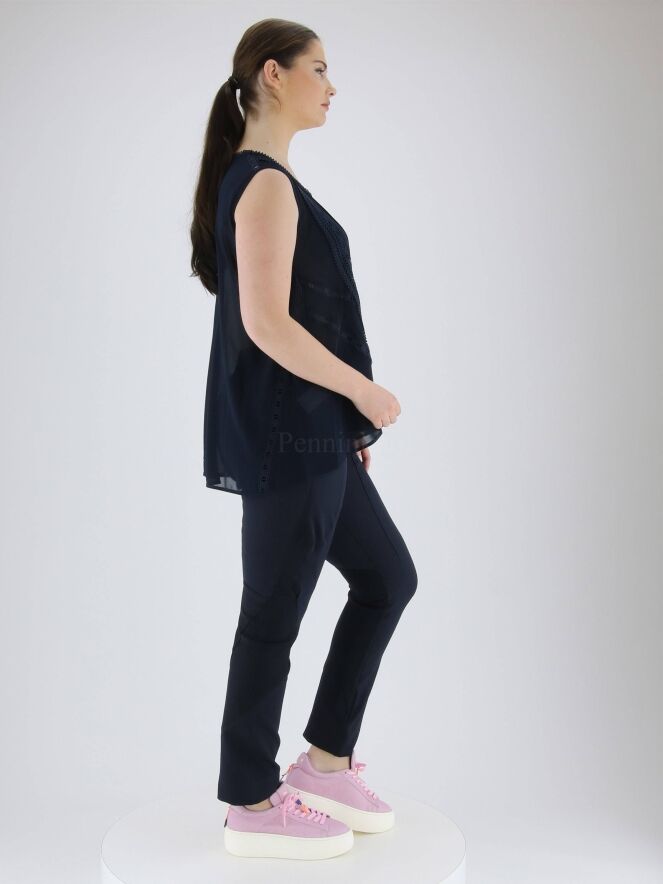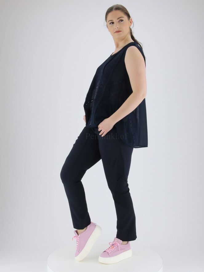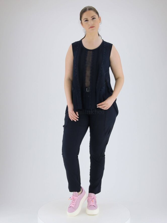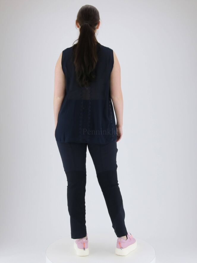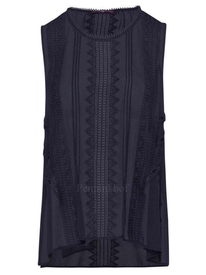 Een licht transparante top van High in de kleur marineblauw. Aan de voorzijde zijn er meerdere plissé banen en kanten biezen in een verticale lijn. Aan de achterzijde is in het midden een brede kanten bies. Langs de rand van de ronde hals is een ajourbies. Deze top mag op de hand worden gewassen.