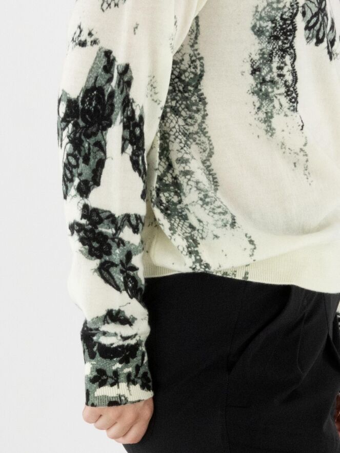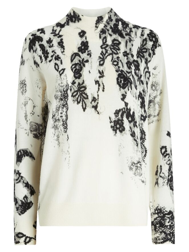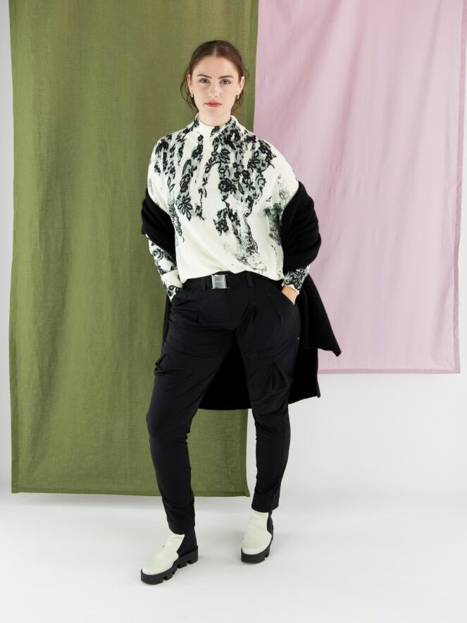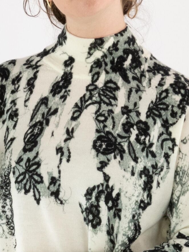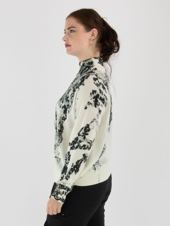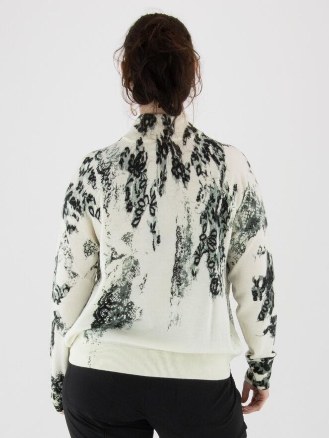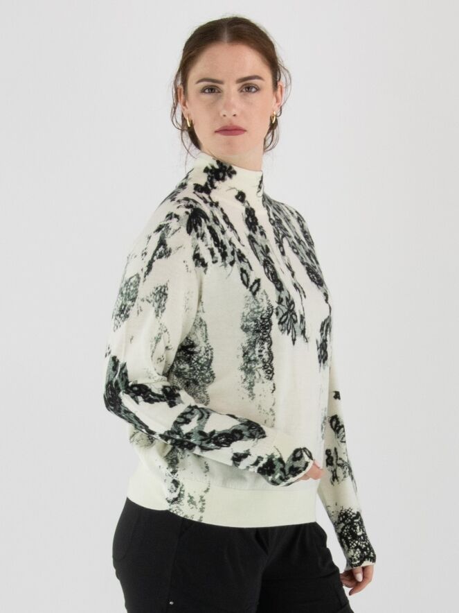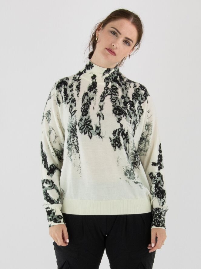 Een pullover van High in een grafische print met meerdere tinten zwart en grijs op een roomwitte achtergrond. De pullover heeft een turtle hals. De rand van de hals, de uiteinden van de mouwen en de onderkant zijn afgewerkt met een fijn geribbelde tricot boord. Deze pullover mag niet worden gewassen.