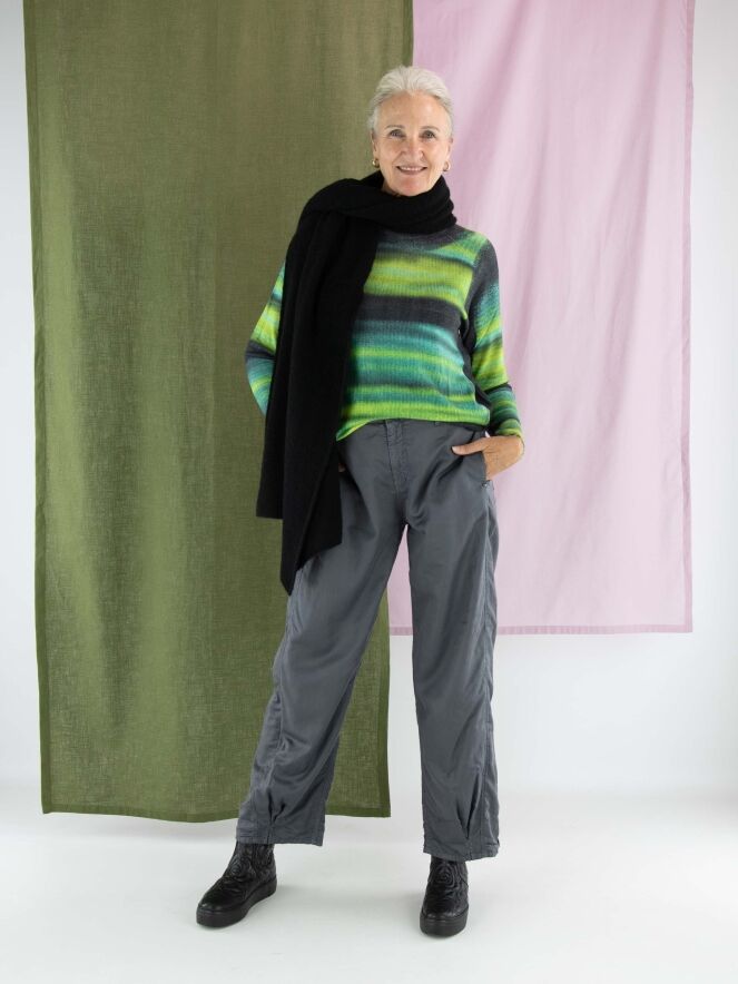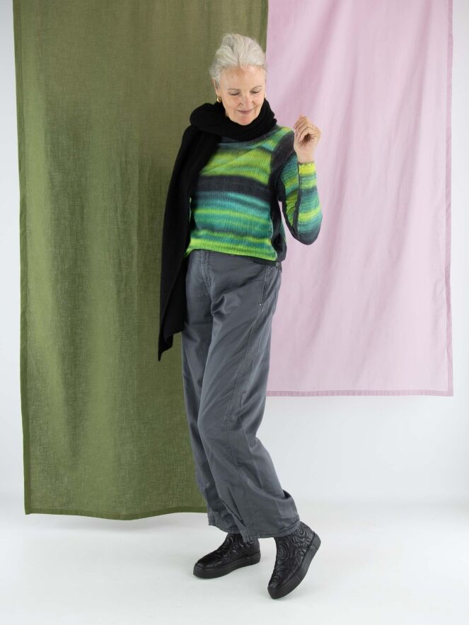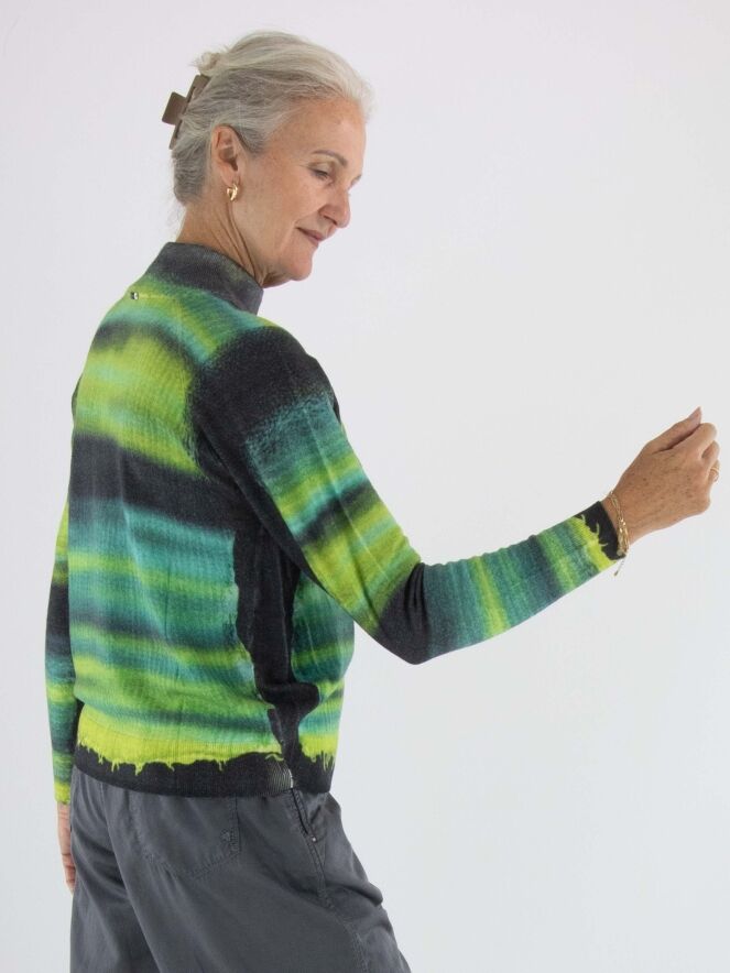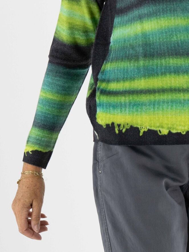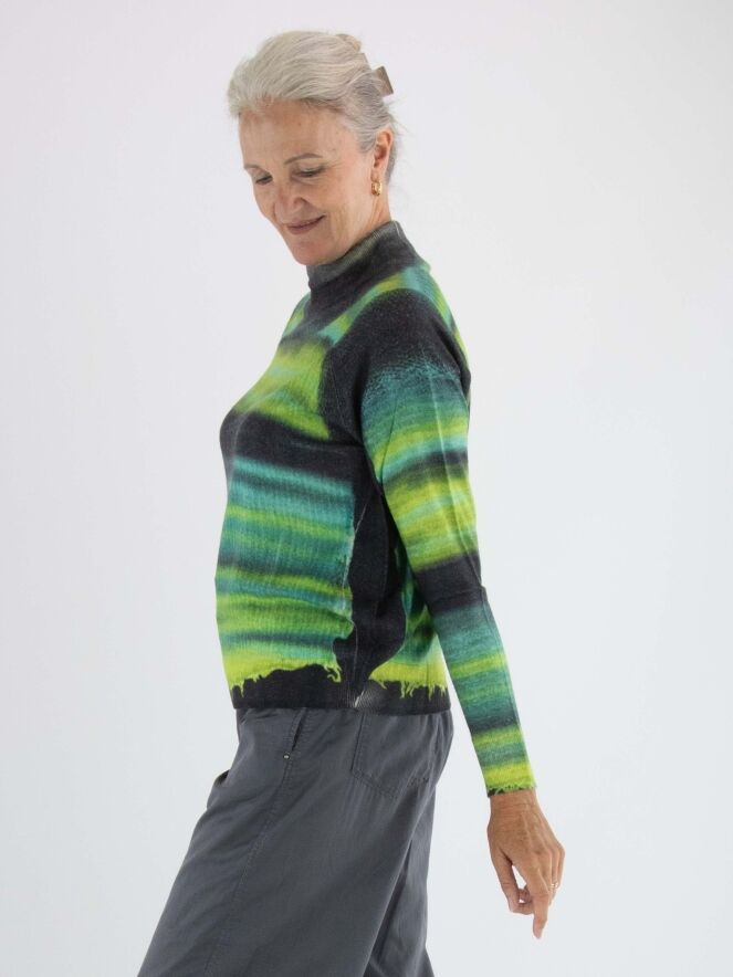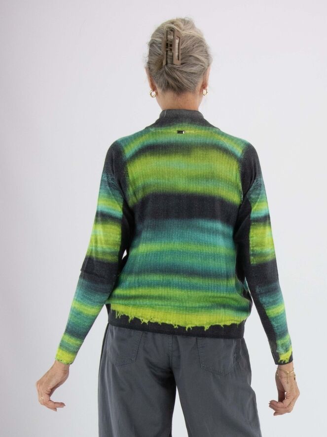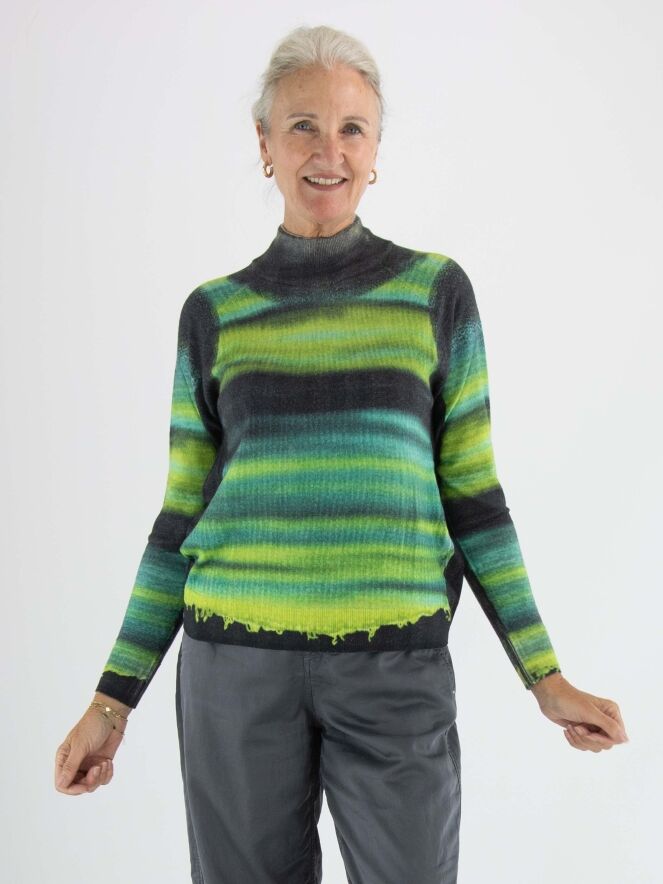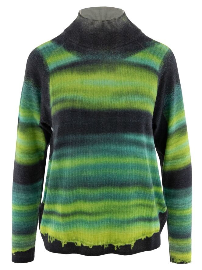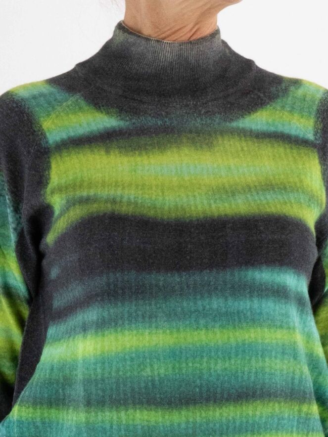 Een pullover van High in een geprinte dégradé met meerdere tinten groen, turquoise en antraciet. Langs de rand van de hals is een fijn geribbelde tricot turtle col. Aan het uiteinde van de lange mouwen en aan de onderkant van de pullover bevindt zich een fijn geribbelde tricot boord. Deze pullover mag niet worden gewassen.