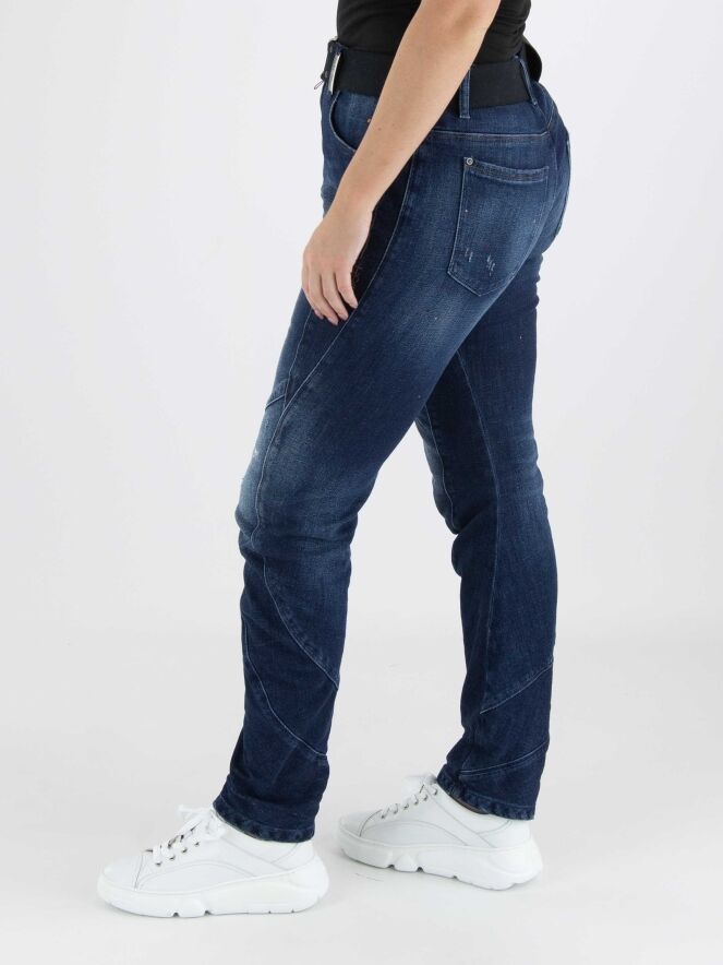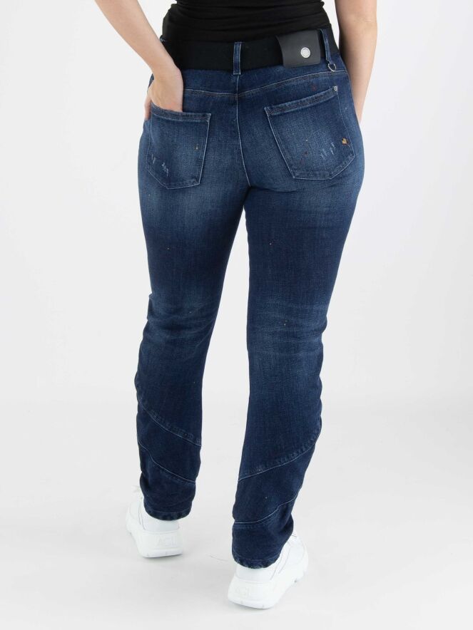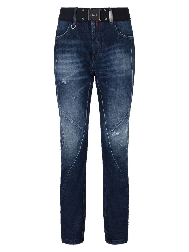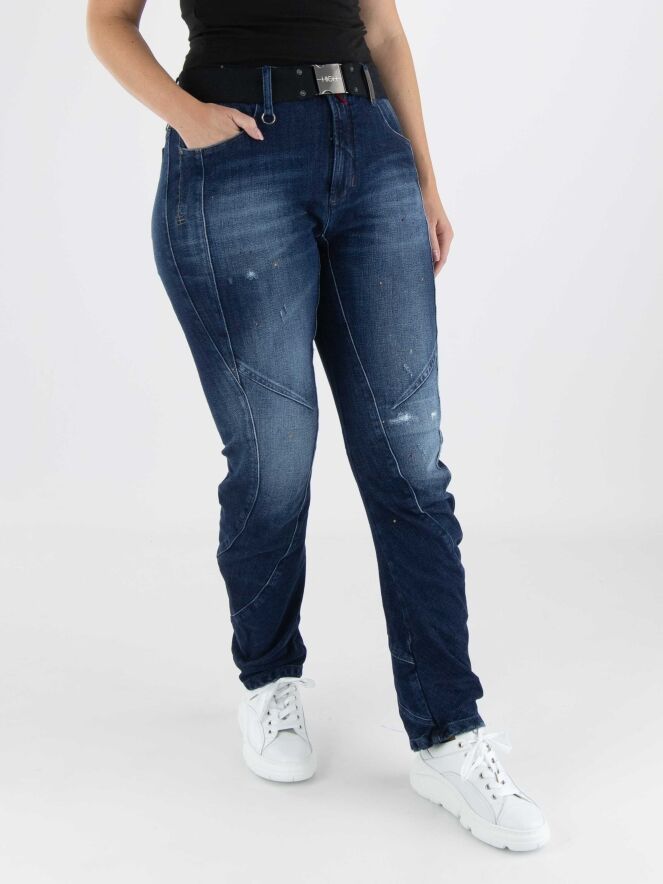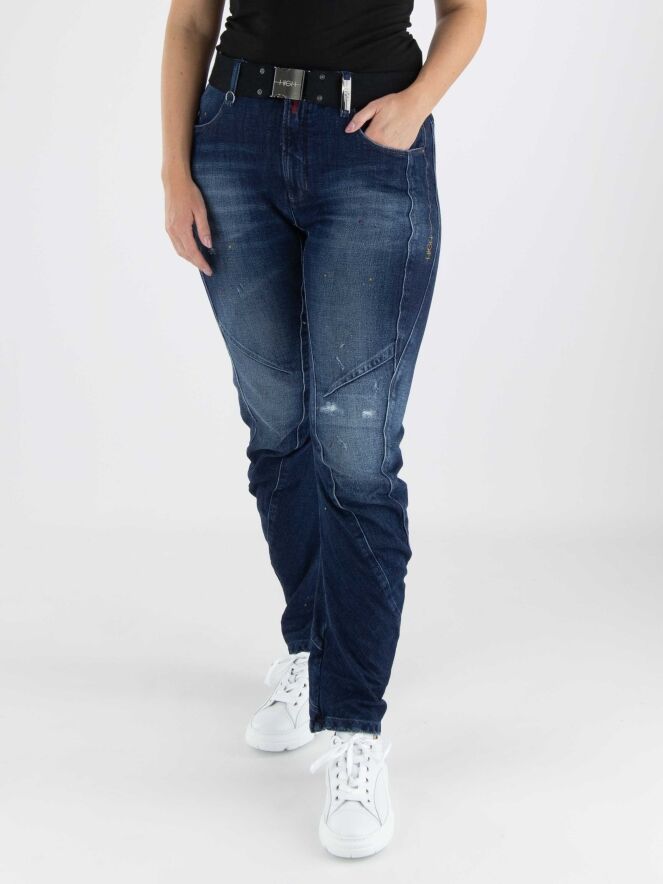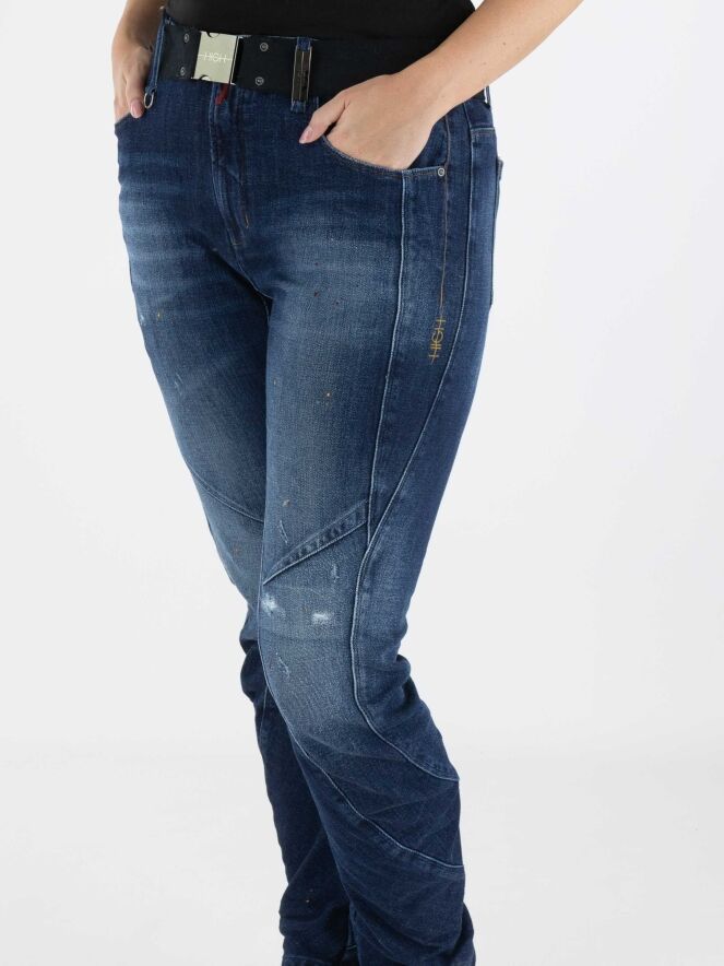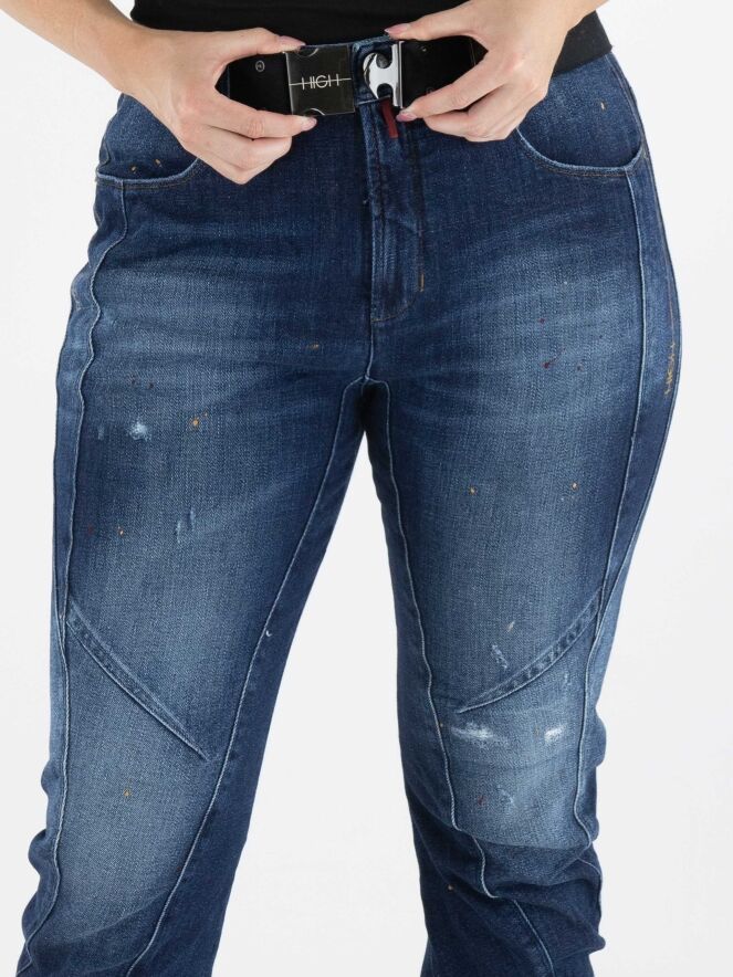 Een gewassen jeans van High in een basic jeans kleur. De jeans heeft decoratieve oranje en rode verfspatten en is used op het bovenbeen en ter hoogte van de knieën. Aan de onderkant is een brede omslag. In de taille is een elastieken ceintuur met een vierkante nikkel kleurige gesp. Deze jeans mag op 30 graden worden gewassen.