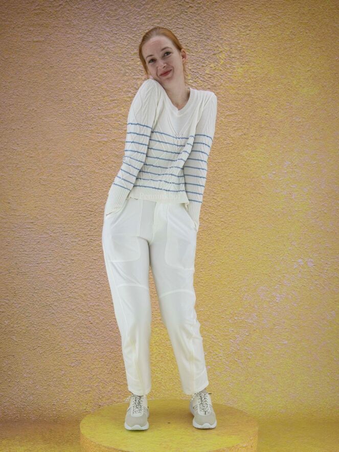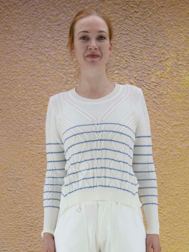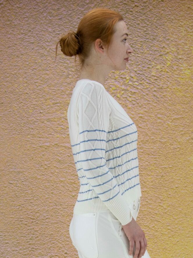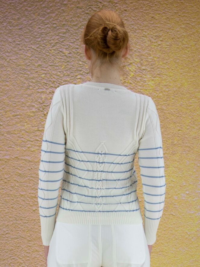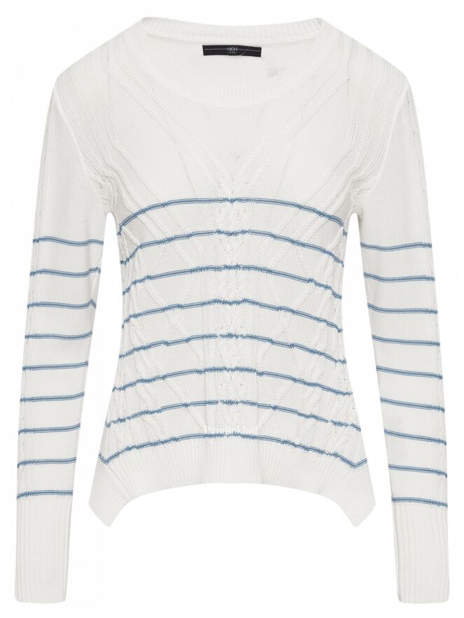 en pullover van High in de kleur roomwit met helder blauwe horizontale strepen. De pullover heeft een kabel patroon en langs de ronde hals is een fijn geribbelde tricot bies. Deze pullover mag niet worden gewassen.