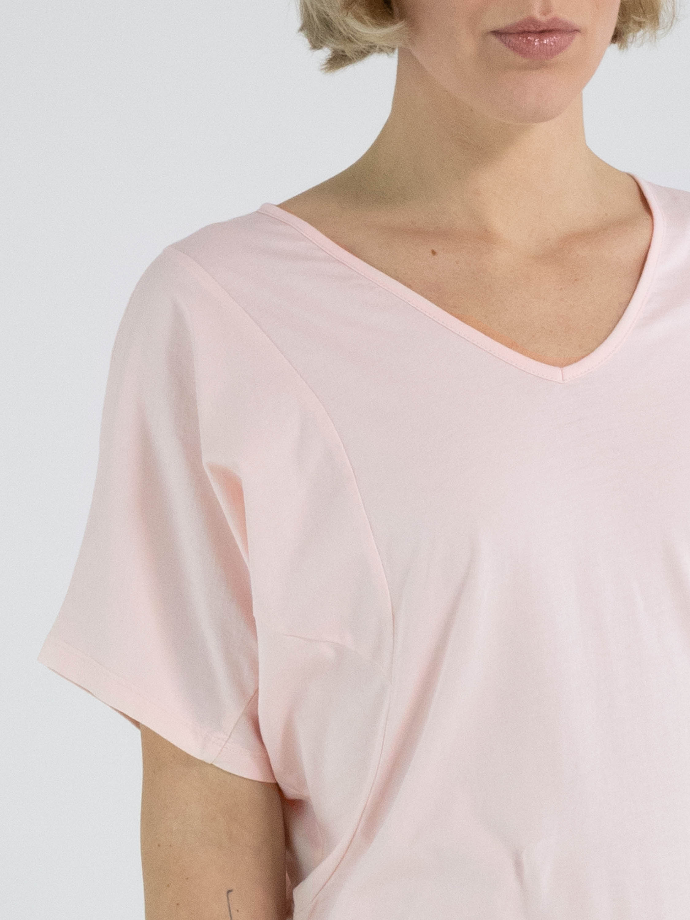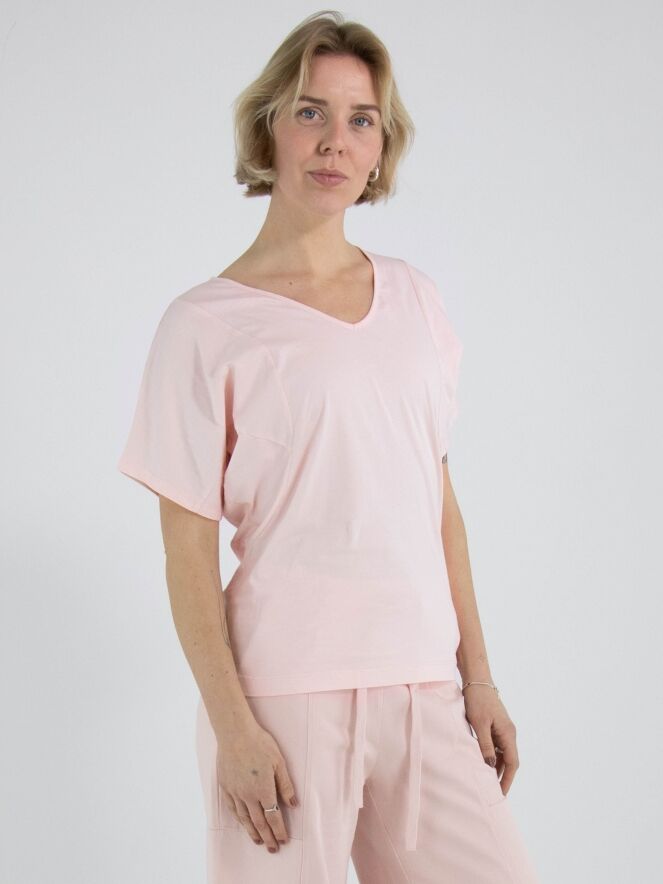 Een shirt van High Lab in een pastelroze kleur. Het shirt heeft korte mouwen en een V-hals. Dit shirt mag op de hand worden gewassen.