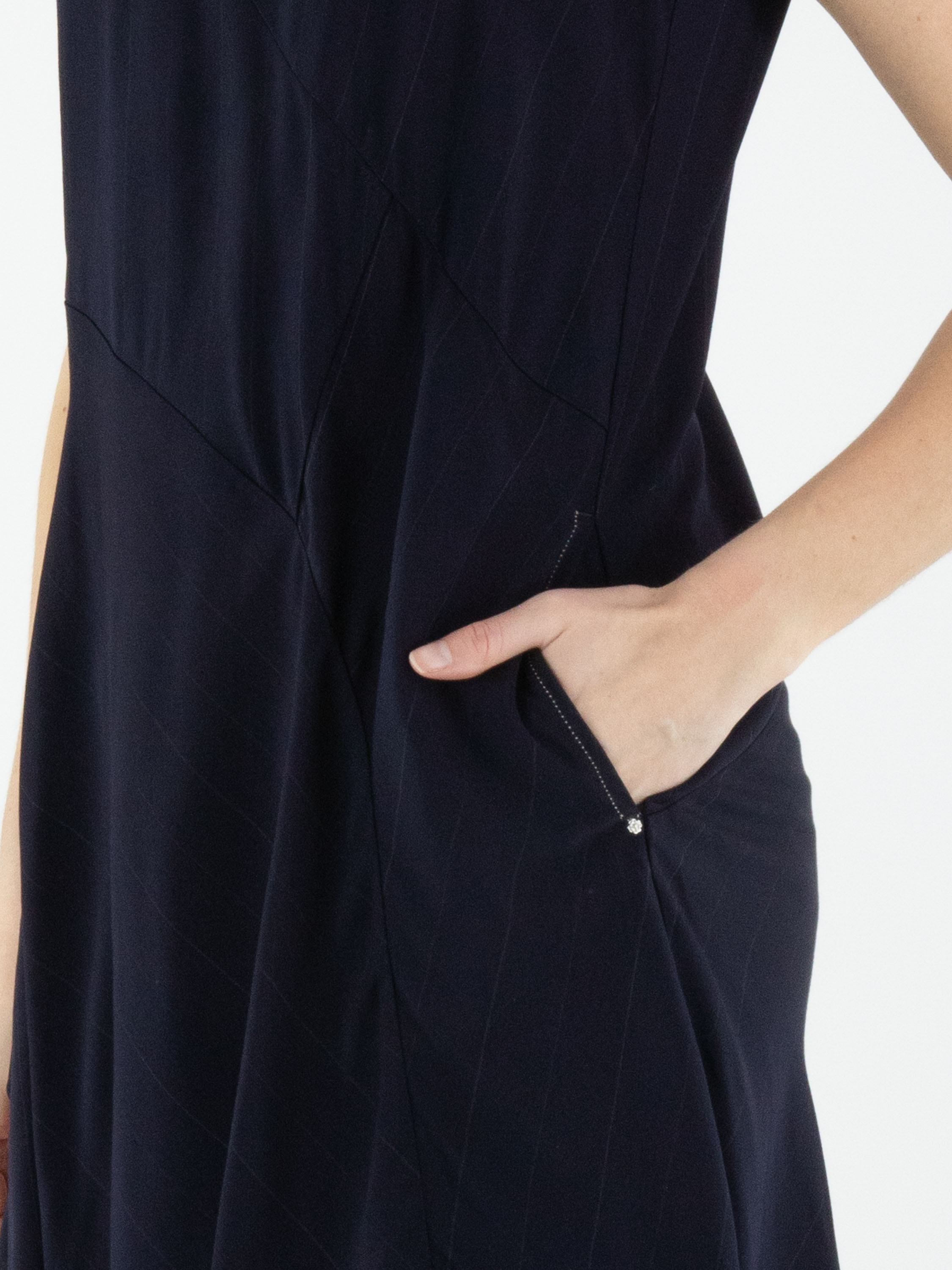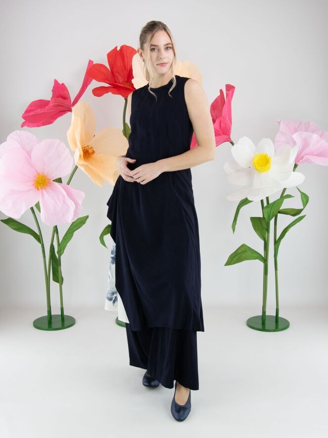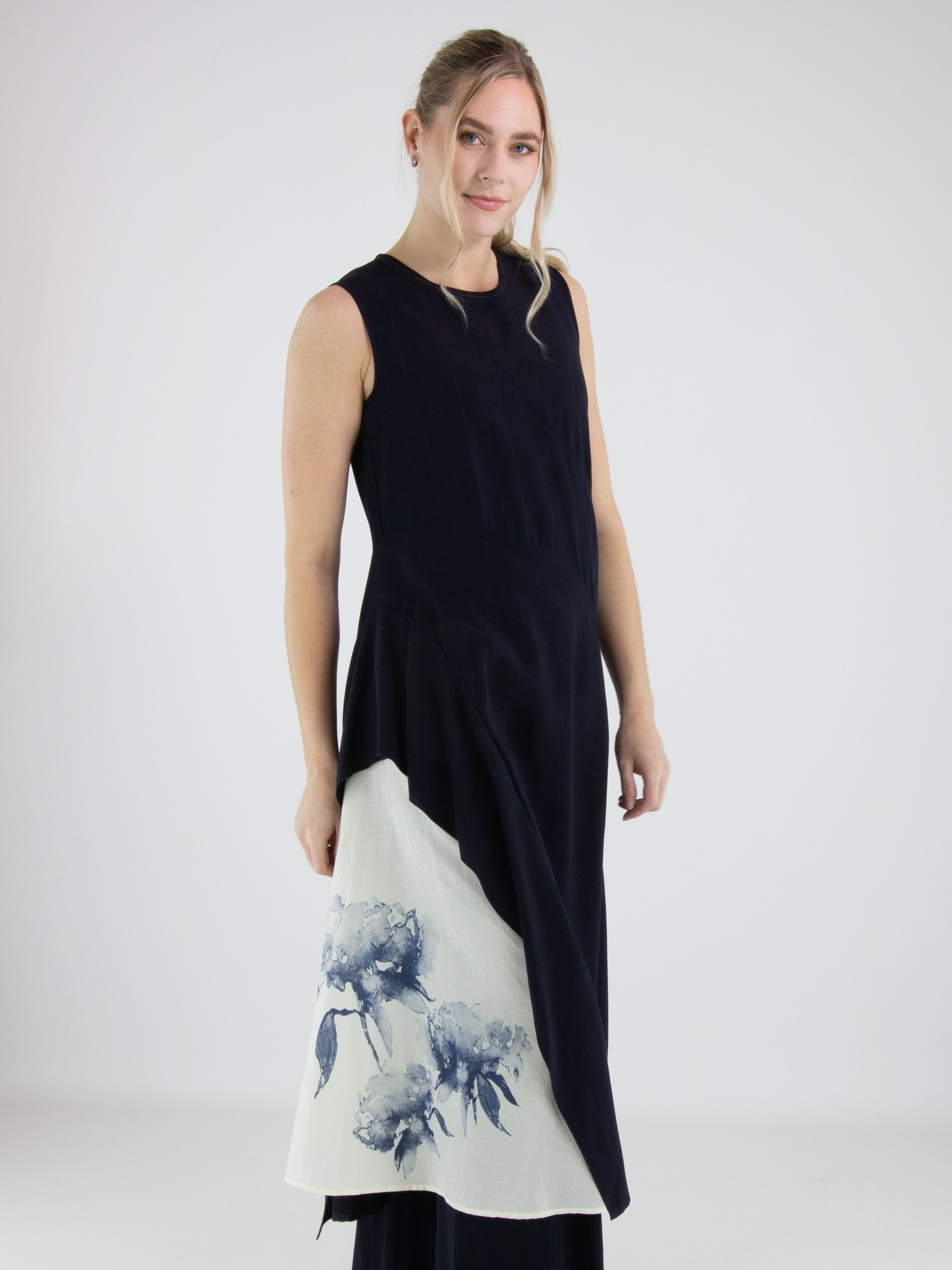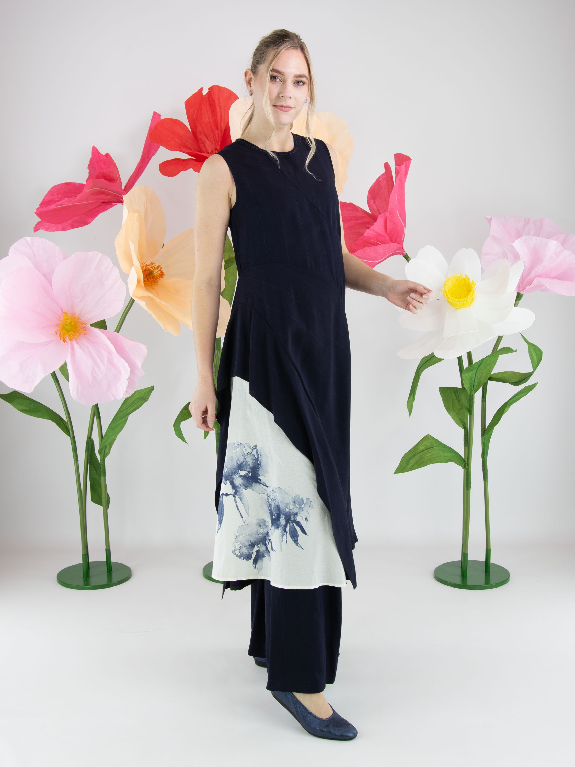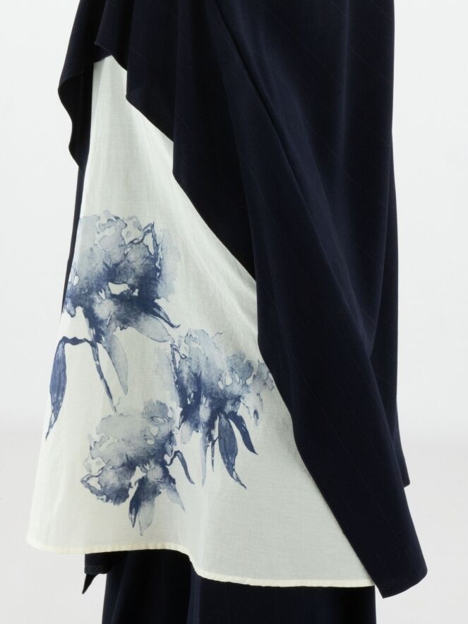 Jurk van High in een ton-sur-ton krijtstreeppatroon in twee tinten marineblauw. De jurk heeft een ronde hals en aan de achterzijde een korte ritssluiting tot onder de schouderbladen. Vanuit de hals en de taille lopen diagonale stiknaden die het silhouet subtiel vormgeven. Vanaf de heup is aan de rechterzijde een roomwitte stof ingezet met een grafische orchideeënprint in meerdere marineblauwe tinten, wat zorgt voor een uitgesproken en artistiek contrast. Ter hoogte van de taille bevindt zich aan de linkerzijde een steekzak. Deze exclusieve designerjurk mag niet worden gewassen.