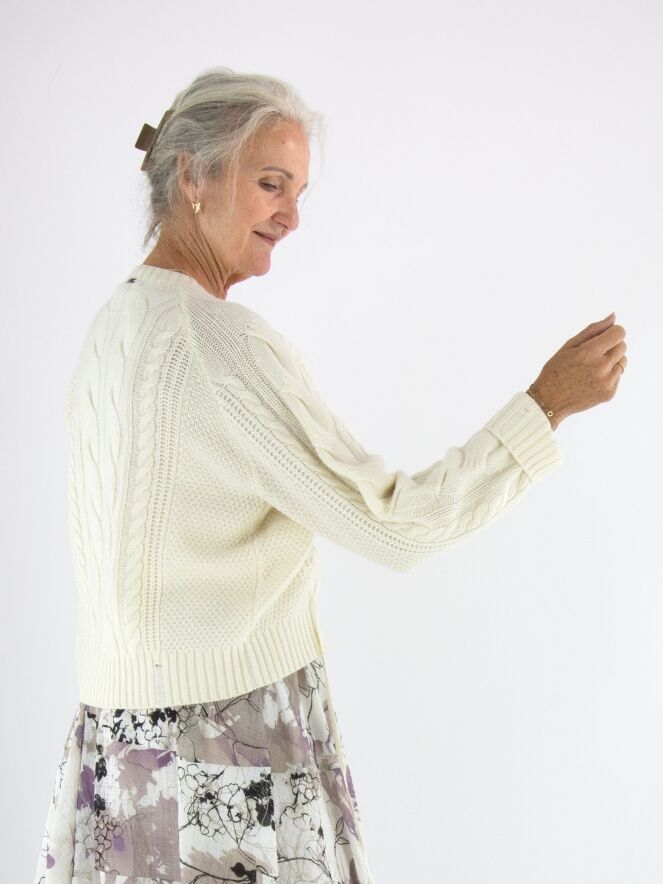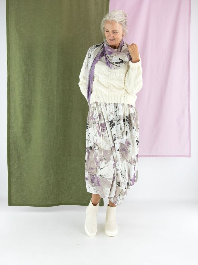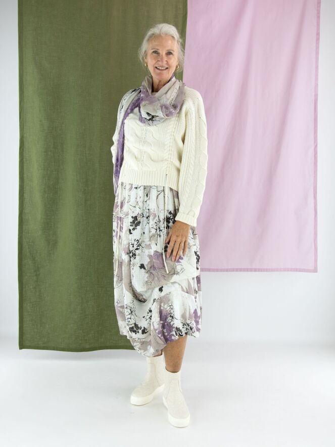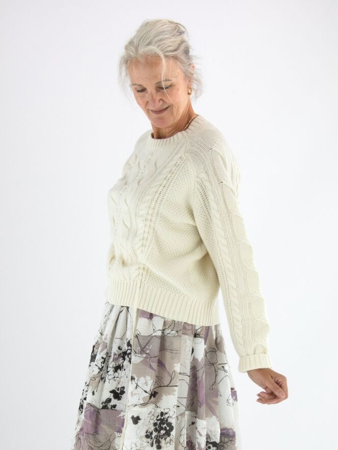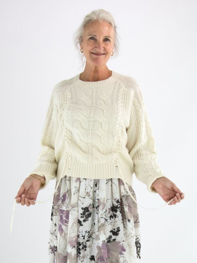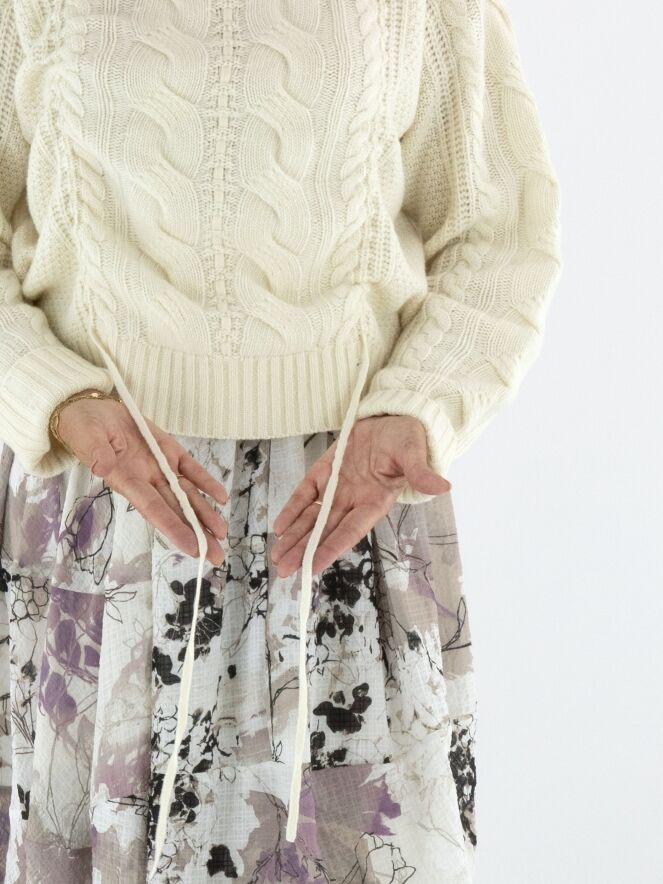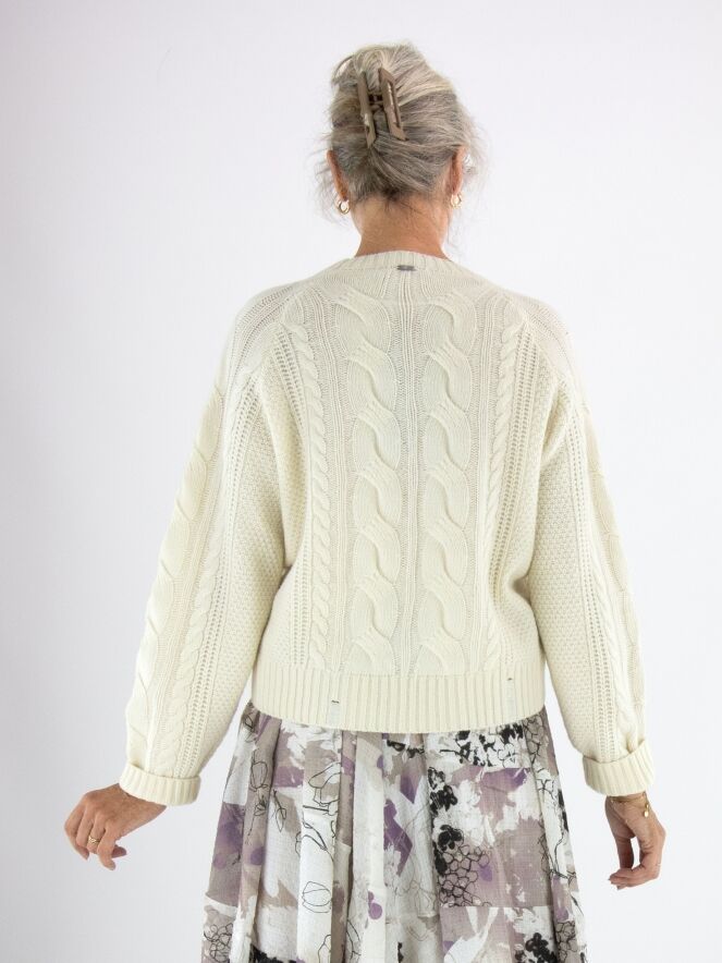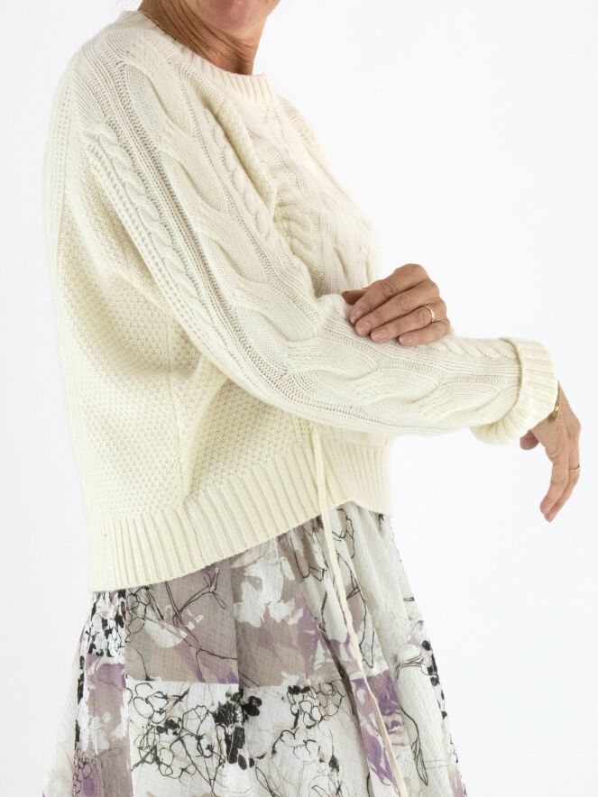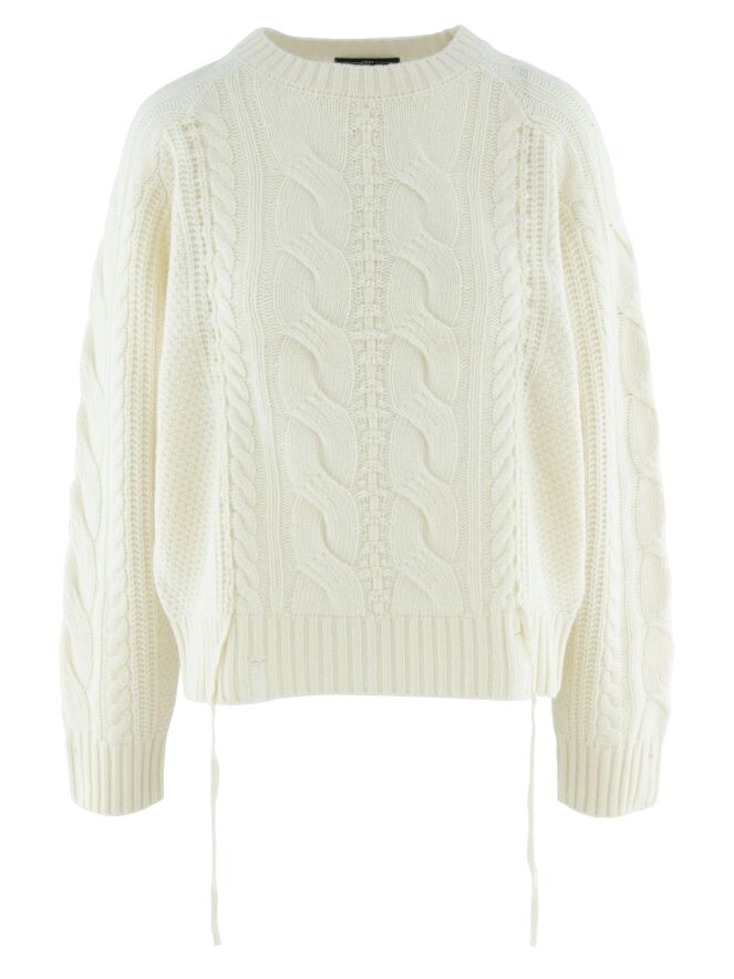 Een luxe kabelpullover van High in de kleur roomwit. De pullover heeft een ronde hals en aan de voorkant lopen vanuit het patroon twee linten naar de onderkant. Deze pullover mag met de hand worden gewassen.