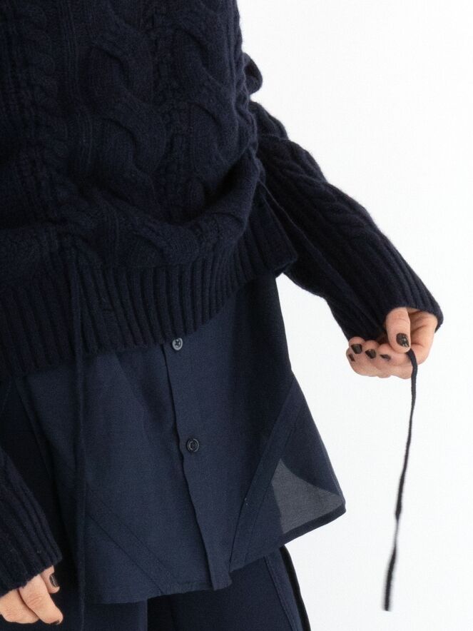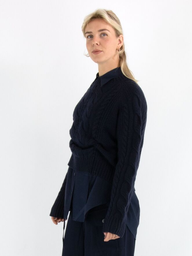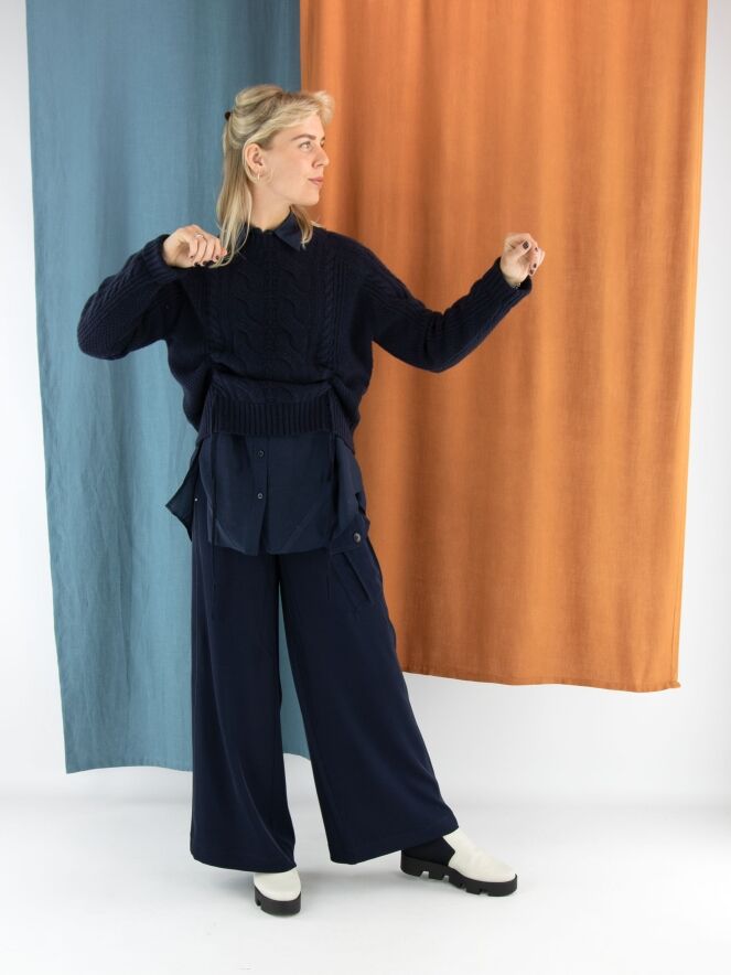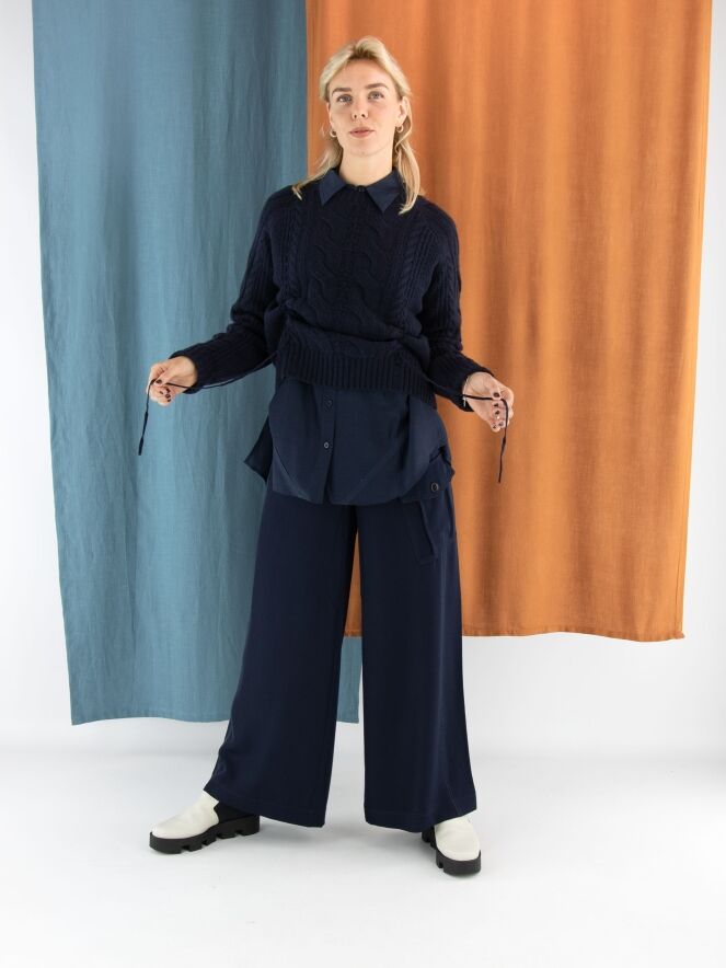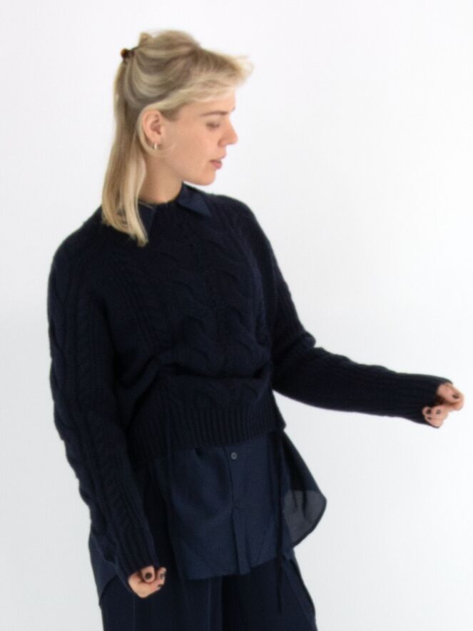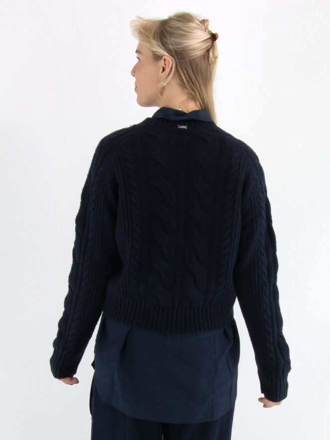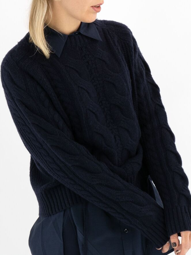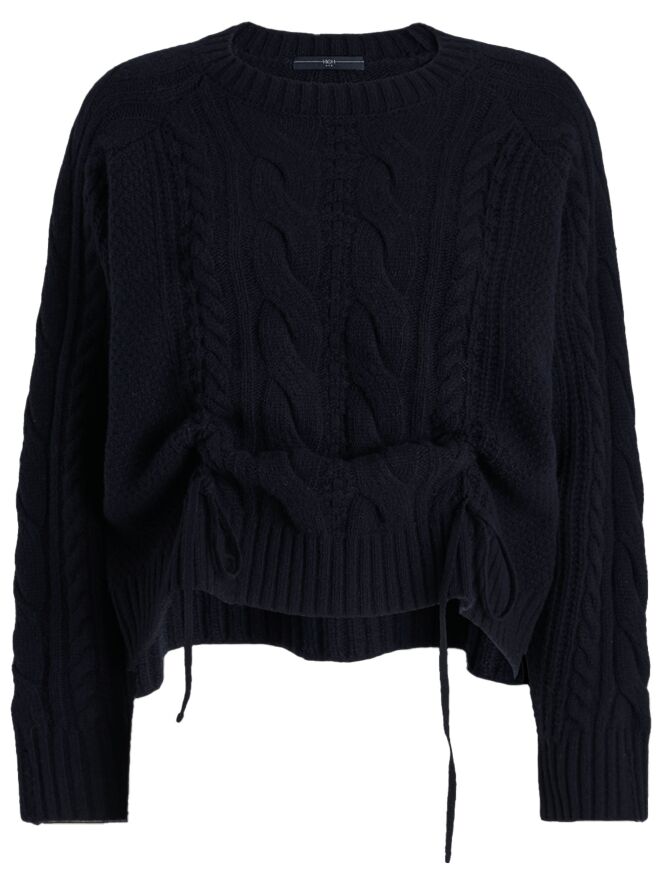 Een luxe kabelpullover van High in de kleur marineblauw. De pullover heeft een ronde hals en aan de voorkant lopen vanuit het patroon twee linten naar de onderkant. Deze pullover mag met de hand worden gewassen.