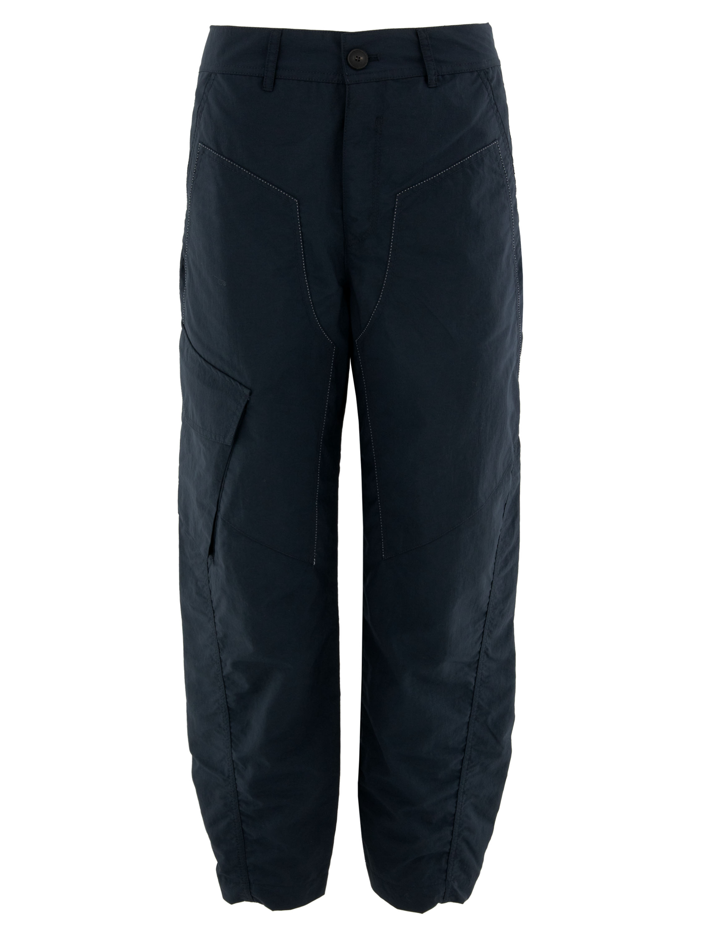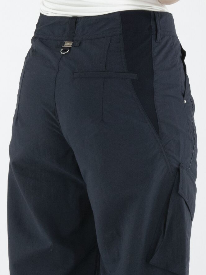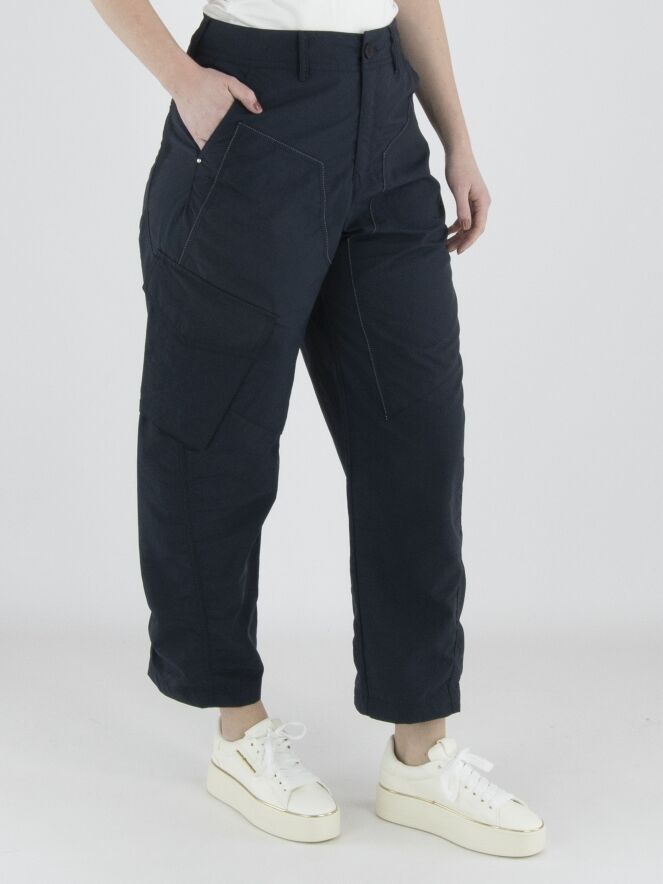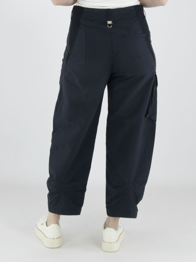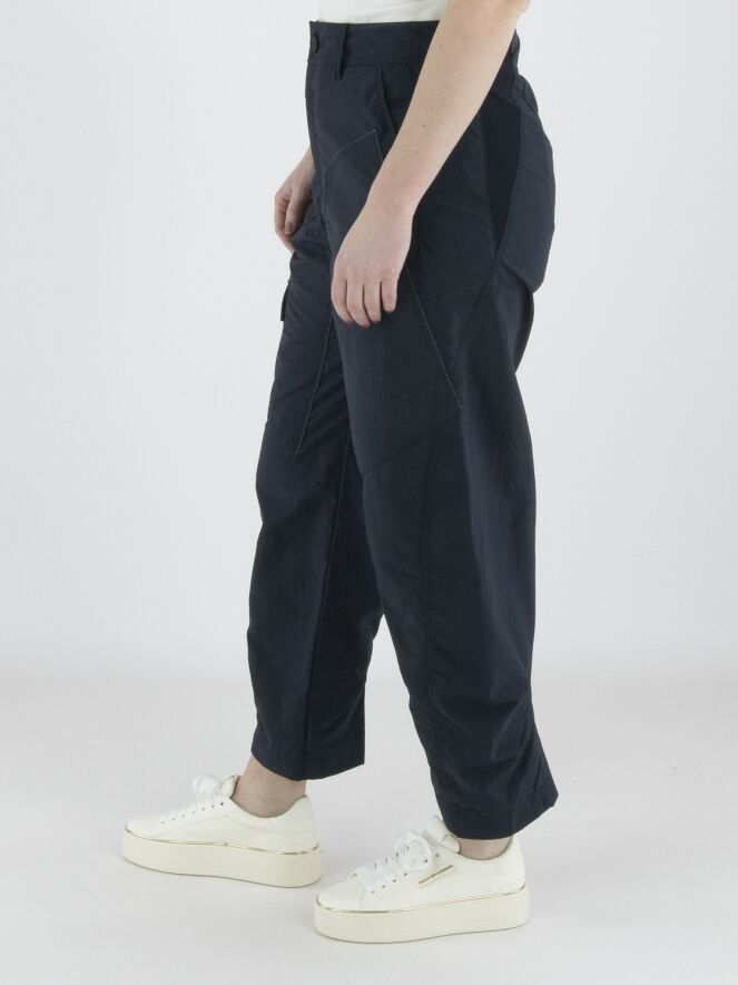 Een broek van High in een marineblauwe kleur. De broek heeft steekzakken en ter hoogte van het bovenbeen is op de rechter pijp een grote diagonale zak verwerkt. Aan de voorzijde heeft de broek enkele witte decoratieve stiknaden. Aan de achterzijde is vanuit de taille, met een split, een elastische stof tot aan de heup verwerkt. Deze broek mag op 30 graden worden gewassen.