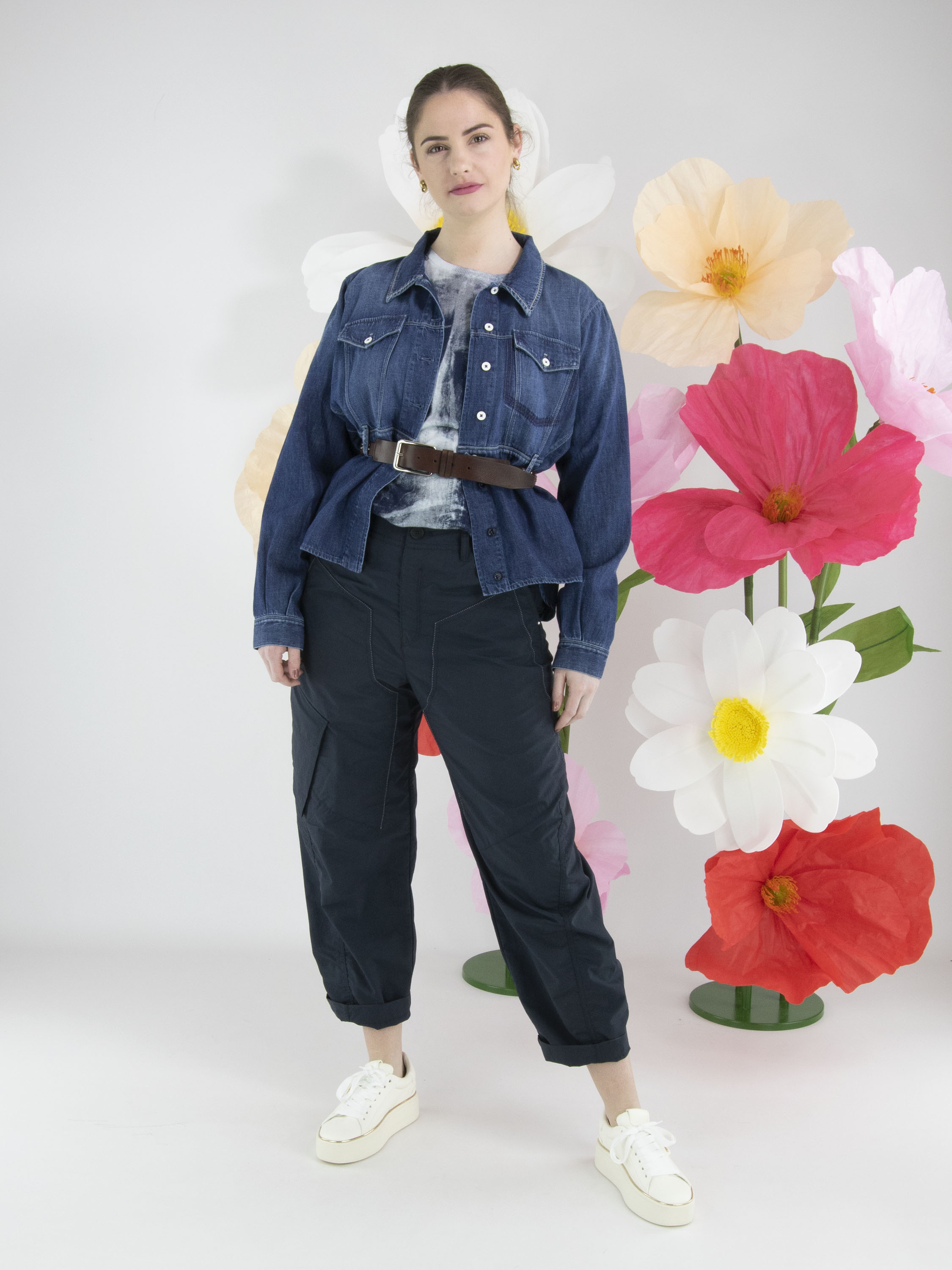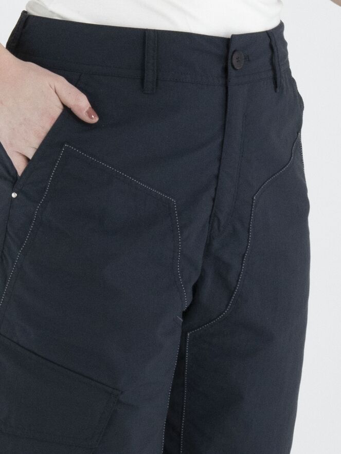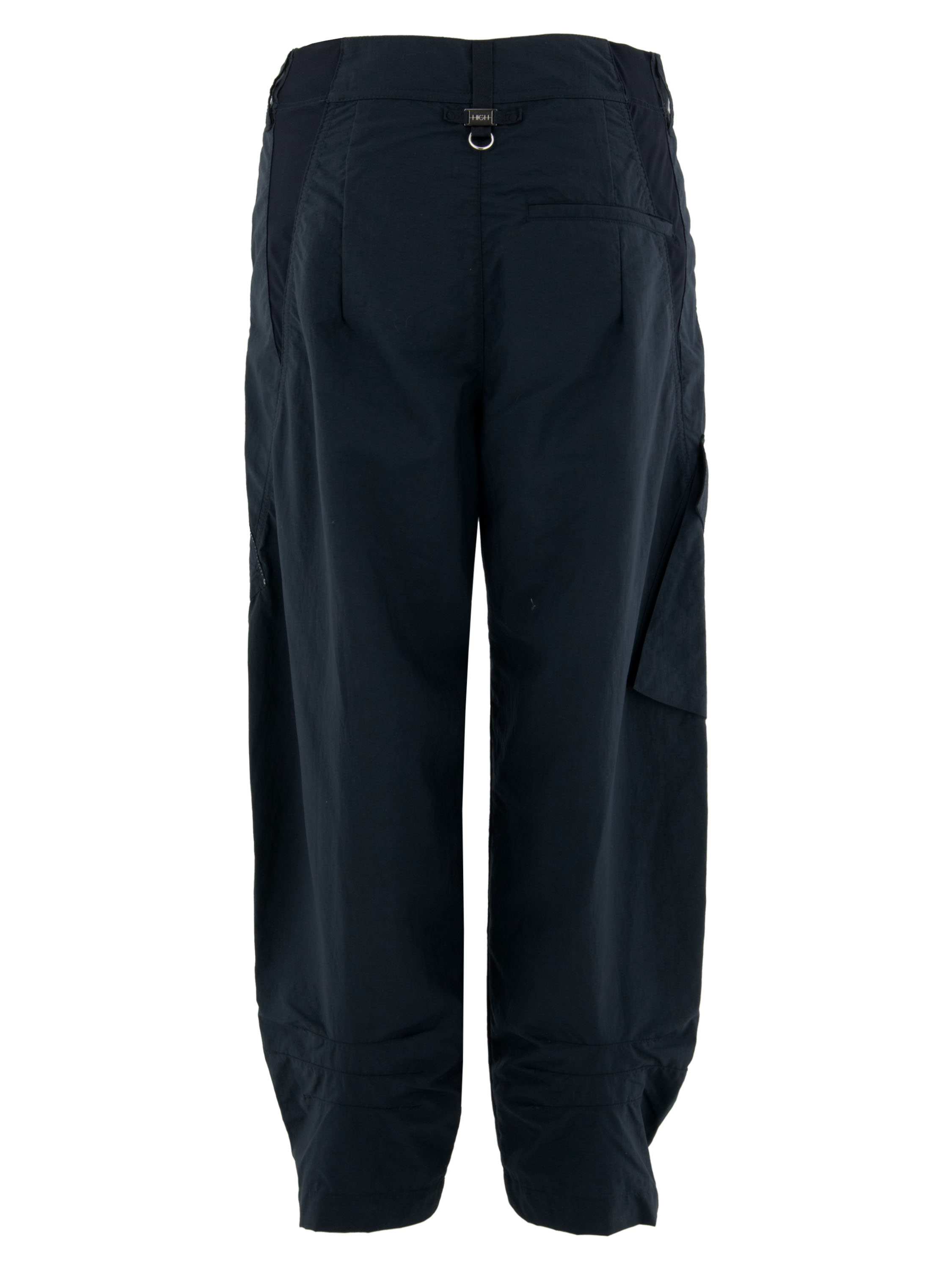 Een broek van High in een marineblauwe kleur. De broek heeft steekzakken en ter hoogte van het bovenbeen is op de rechter pijp een grote diagonale zak verwerkt. Aan de voorzijde heeft de broek enkele witte decoratieve stiknaden. Aan de achterzijde is vanuit de taille, met een split, een elastische stof tot aan de heup verwerkt. Deze broek mag op 30 graden worden gewassen.