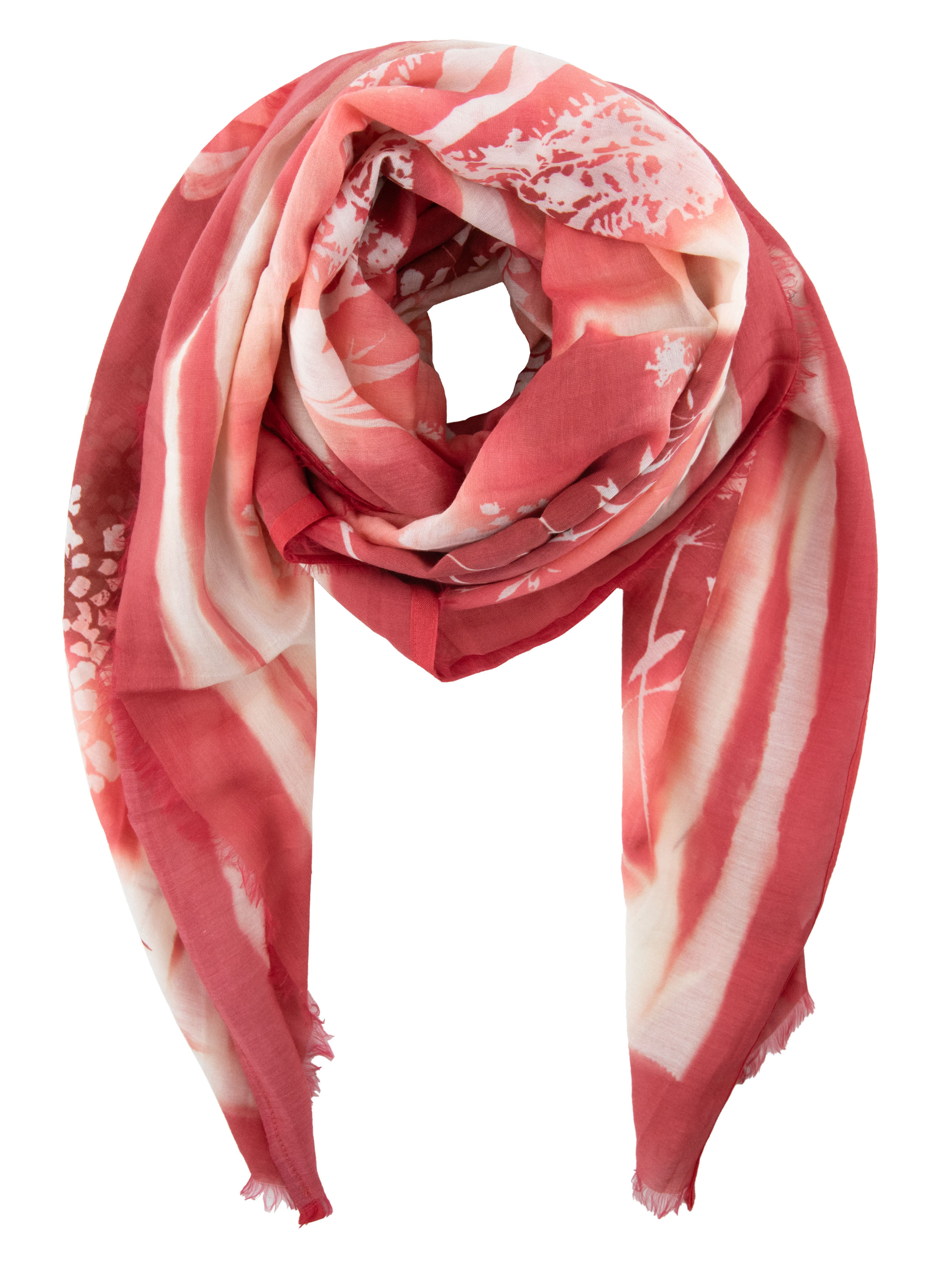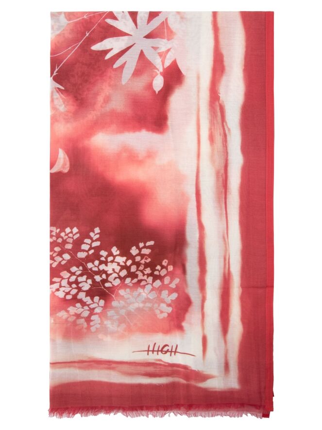 Een luxe, licht transparante shawl van High met een batikachtige bloemenprint in meerdere tinten rood. De randen van de shawl zijn fijn gerafeld. Deze shawl mag niet worden gewassen.