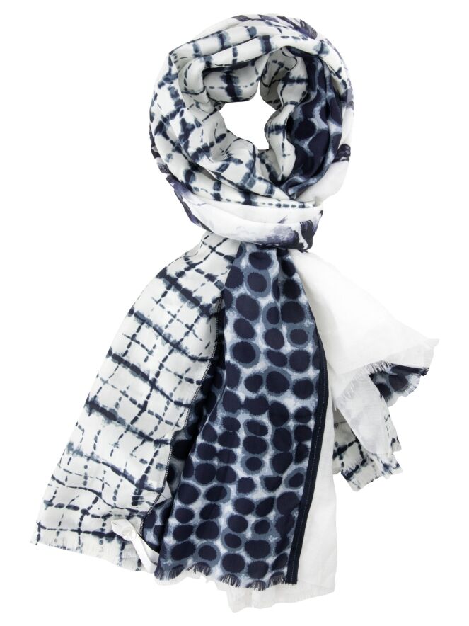 Een luxe, licht transparante shawl van High met een dubbele print. Het middelste deel is uitgevoerd in een grafische aquarelprint van bloemen, terwijl beide uiteinden zijn voorzien van een blokprint met cirkels. De shawl is uitgevoerd in meerdere tinten blauw met roomwit. Deze shawl mag niet worden gewassen.
