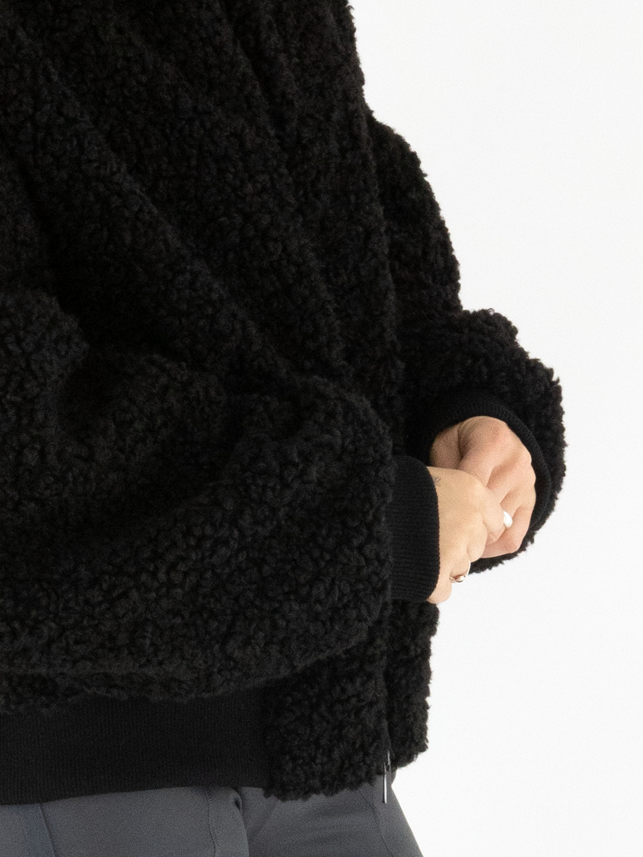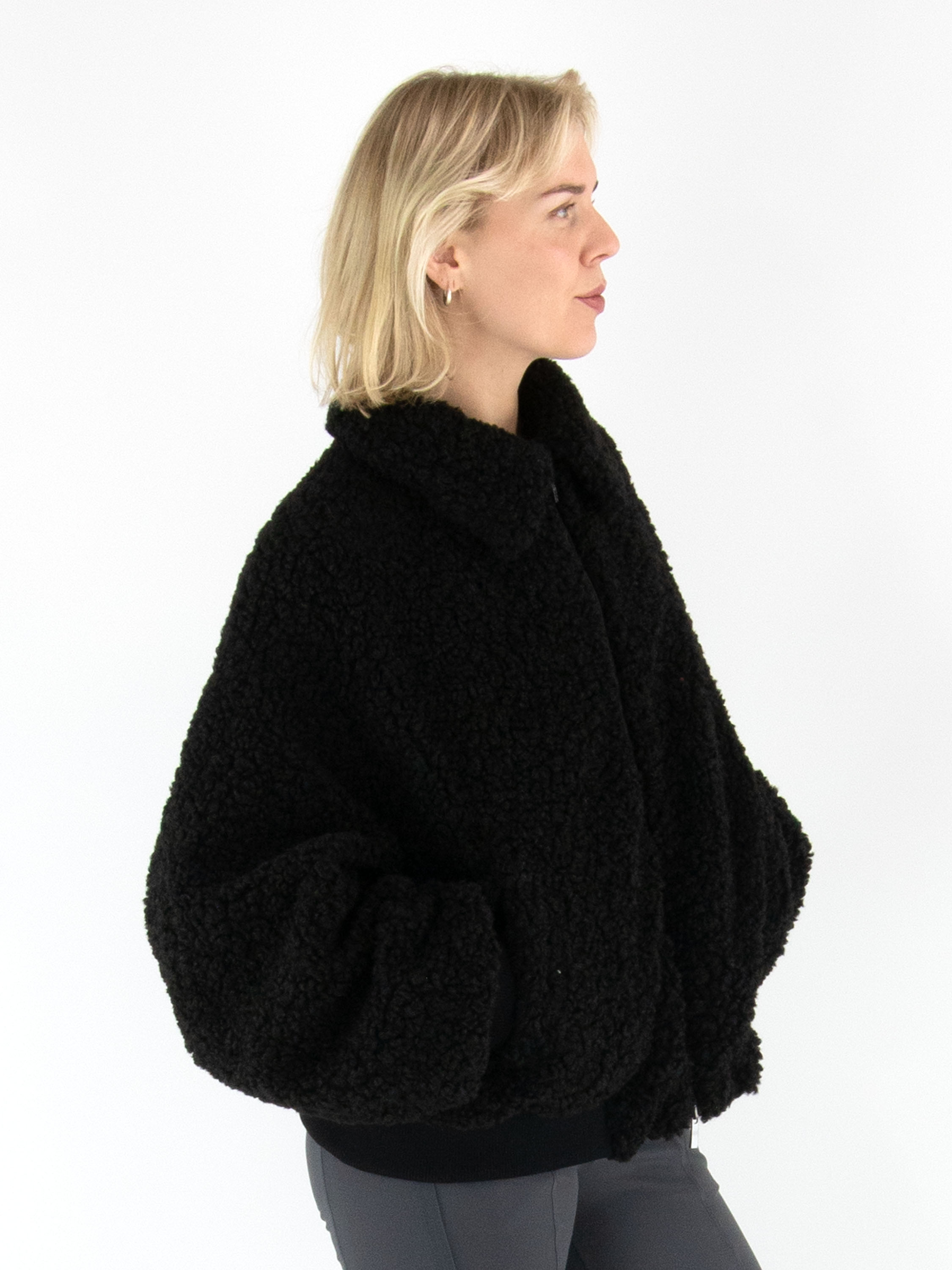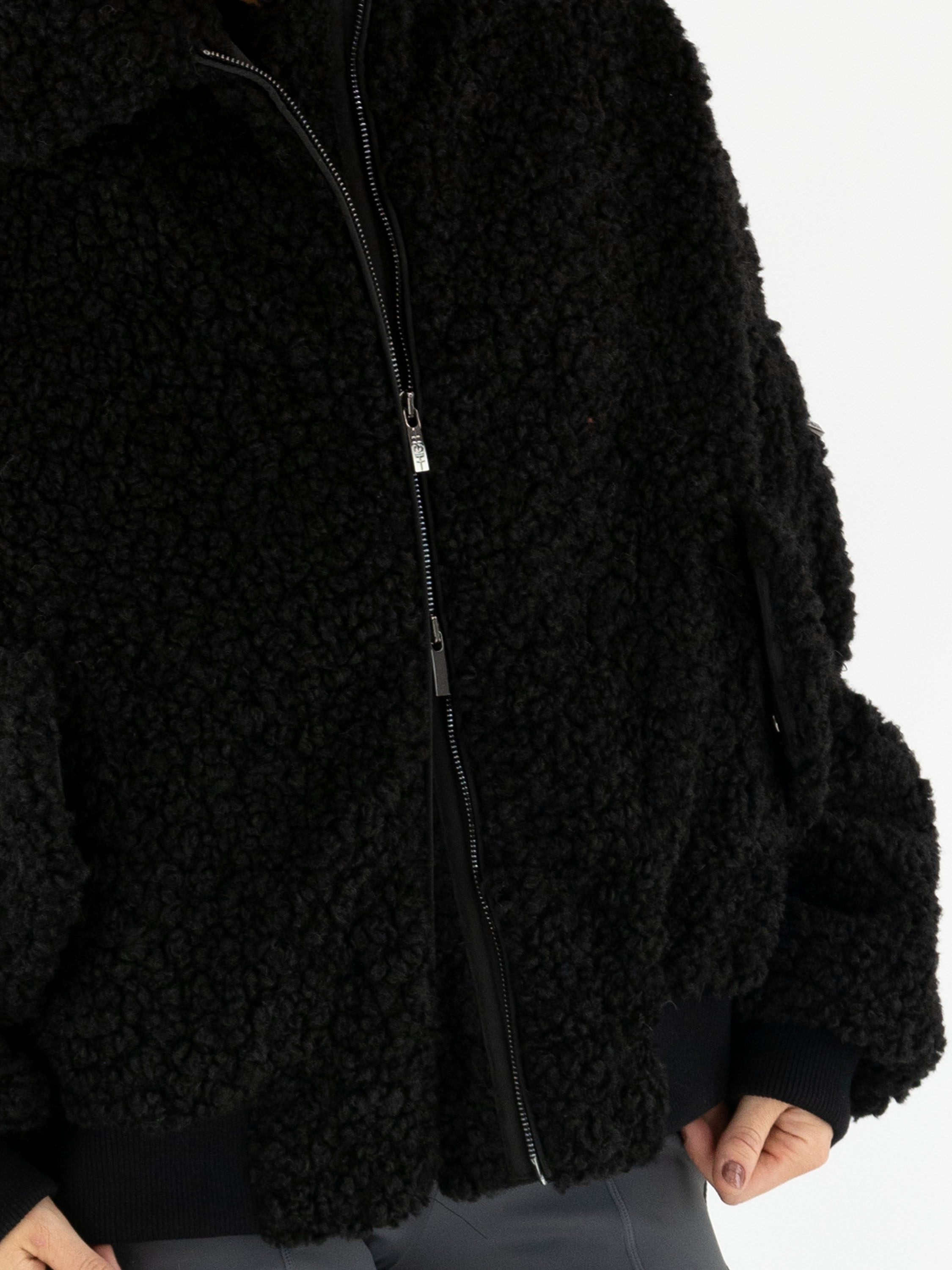 Een korte curly coat van High in de kleur zwart. De jas sluit met een rits en heeft steekzakken op taillehoogte met een omslag. Aan de uiteinden van de lange mouwen en langs de onderkant is de coat afgewerkt met een brede, fijn geribbelde tricot boord, wat zorgt voor een sportief accent. Deze coat mag niet worden gewassen.