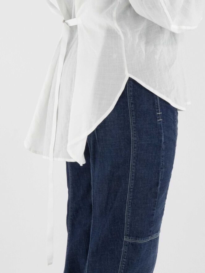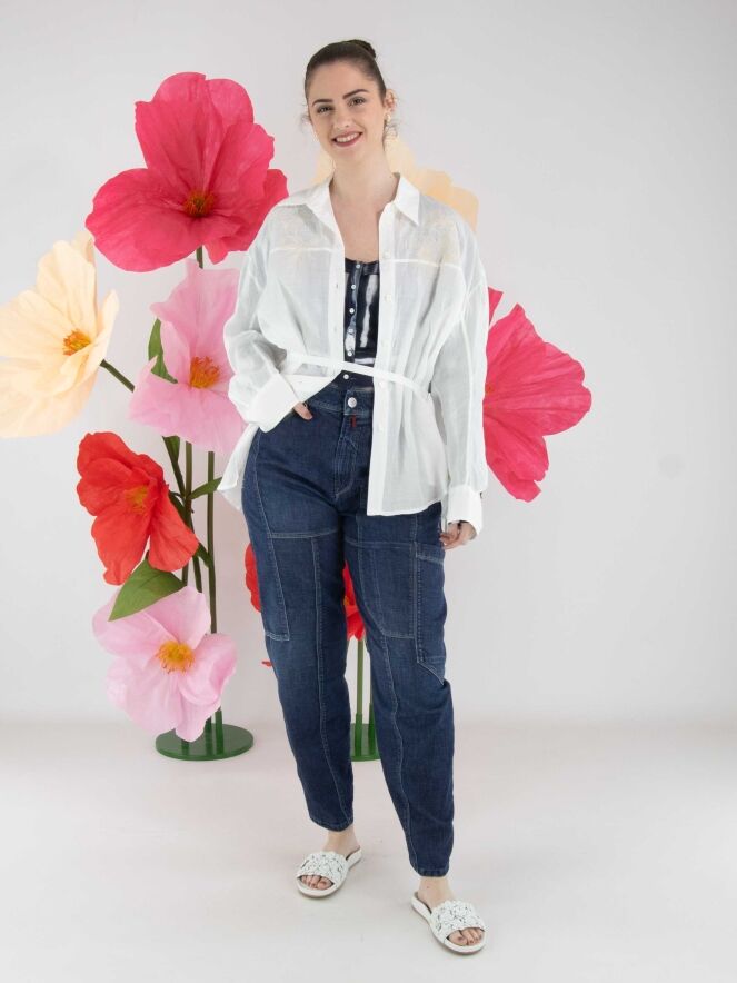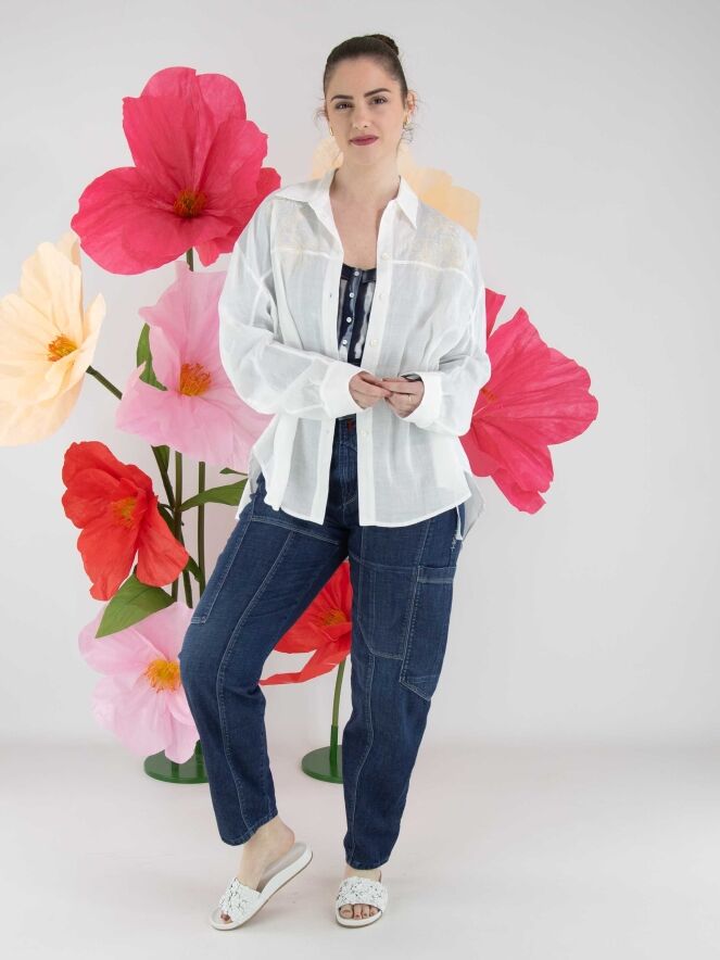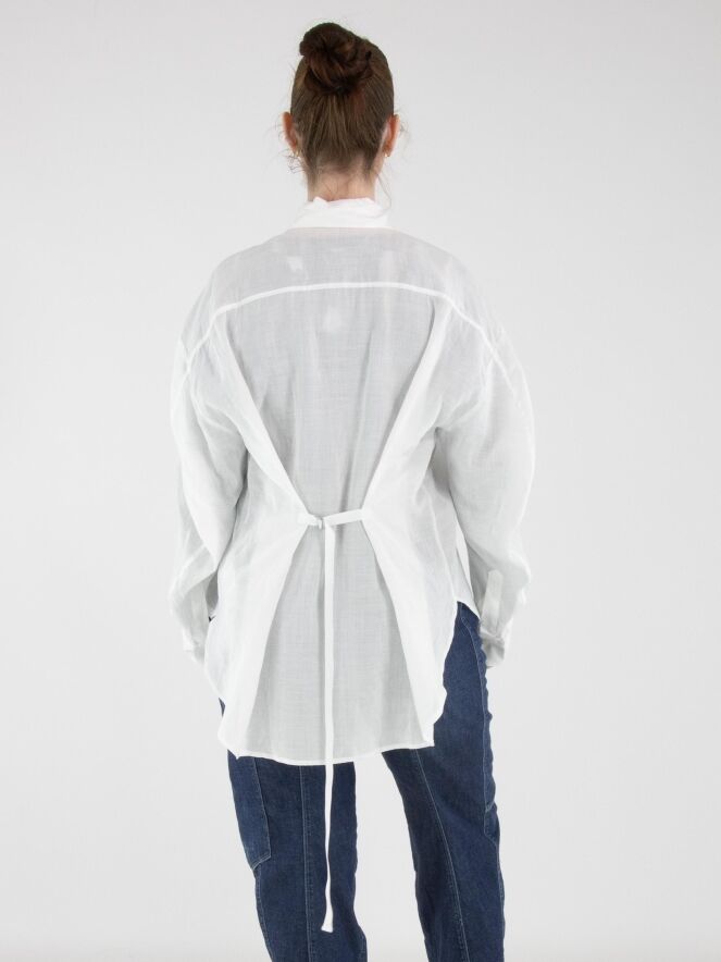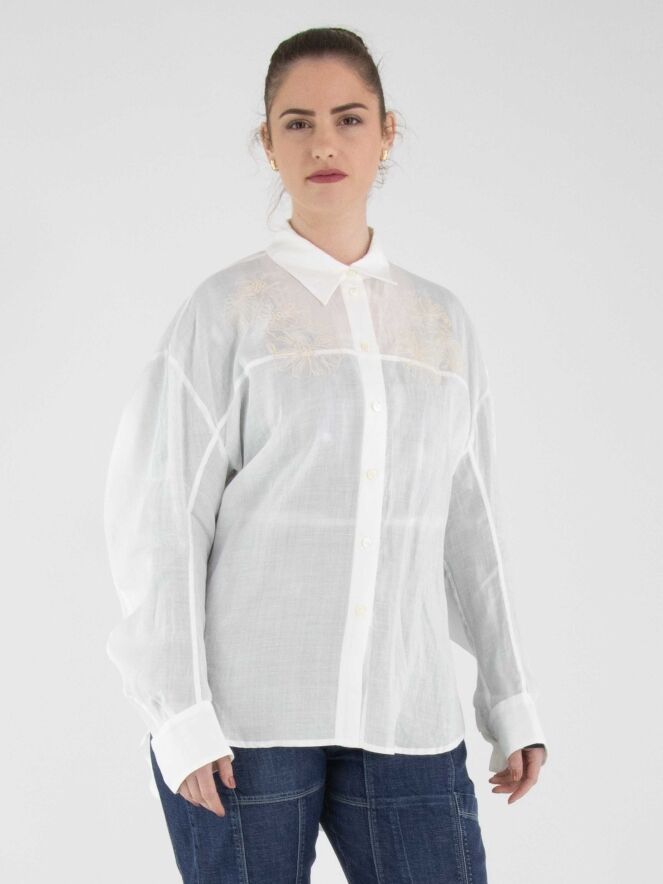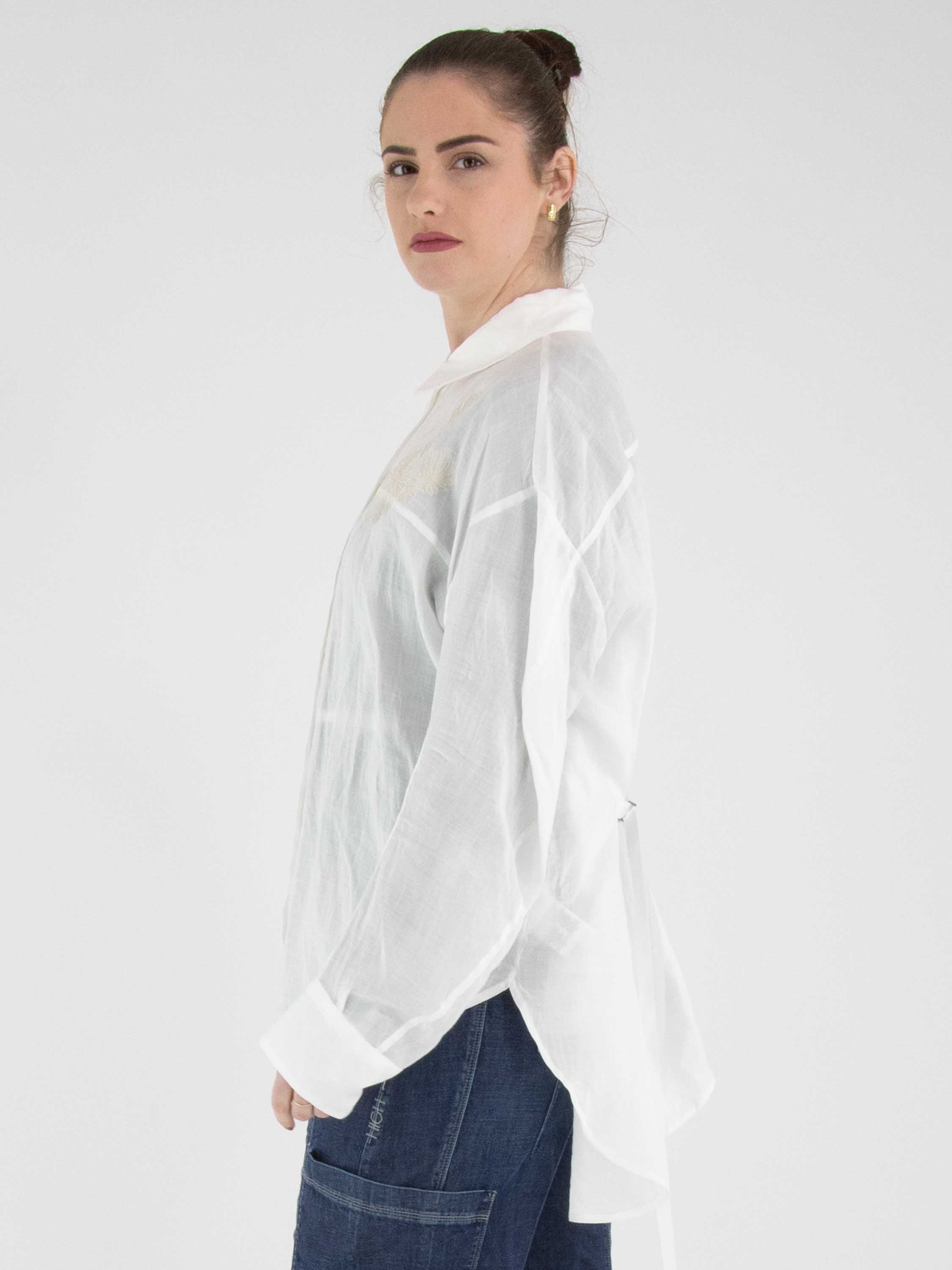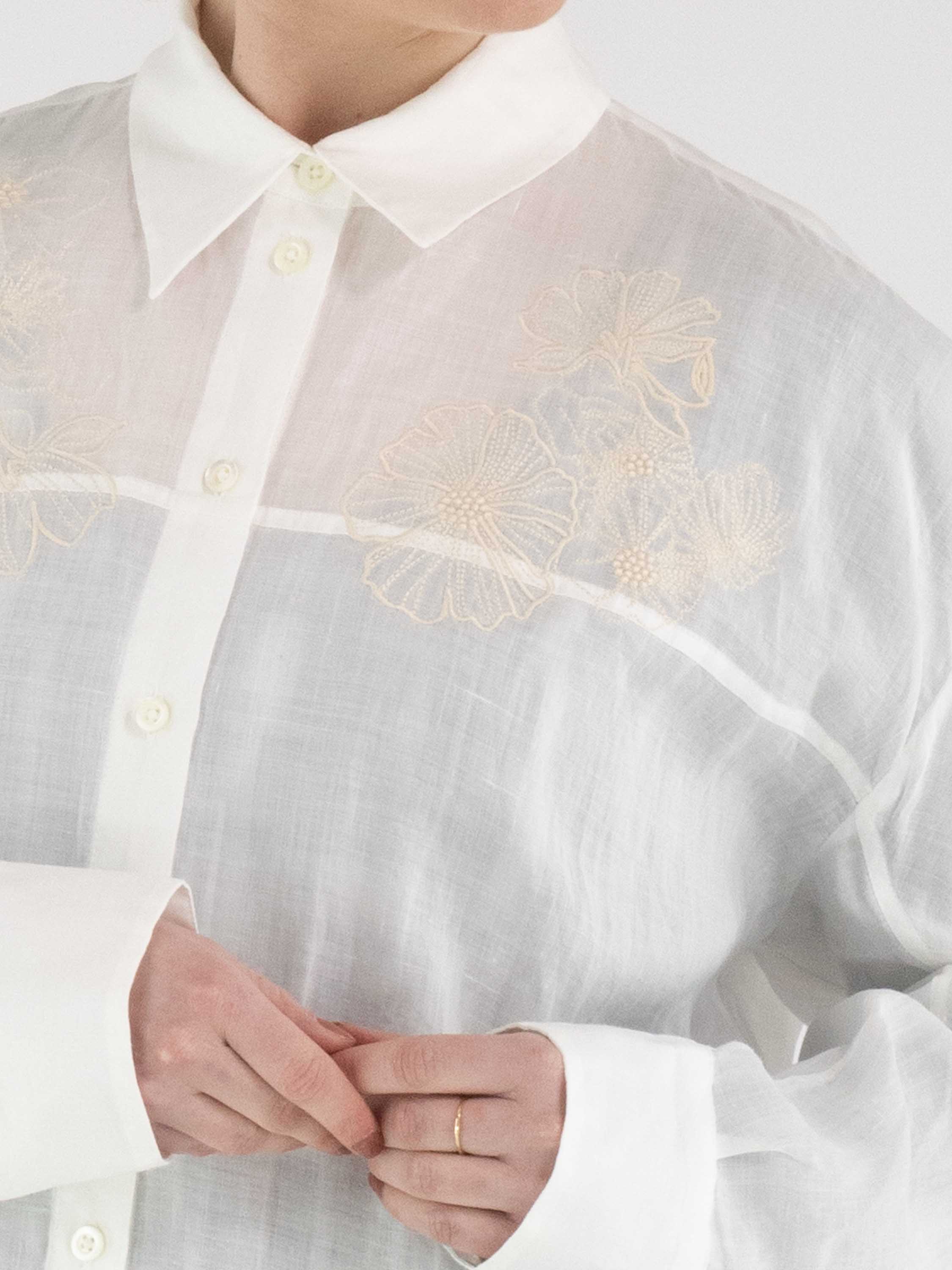 Een ruime blouse van High in de kleur wit. Boven de buste, net onder de schouders, is een bloemrijke broderie uitgevoerd in een zandkleur. Ter hoogte van de taille bevindt zich een smalle ceintuur in dezelfde stof als de blouse, die aan de achterkant vast is bevestigd en waarmee een getailleerd effect aan de achterzijde kan worden gecreëerd. Deze blouse kan met de hand worden gewassen.