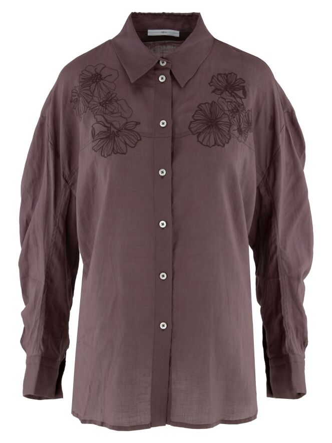 Een ruime blouse van High in de kleur mauve. Boven de buste, net onder de schouders, is een bloemrijke broderie verwerkt. Ter hoogte van de taille bevindt zich een smalle ceintuur in dezelfde stof als de blouse, die aan de achterkant vast is bevestigd en waarmee aan de achterzijde een getailleerd effect kan worden gecreëerd. Deze blouse kan met de hand worden gewassen.