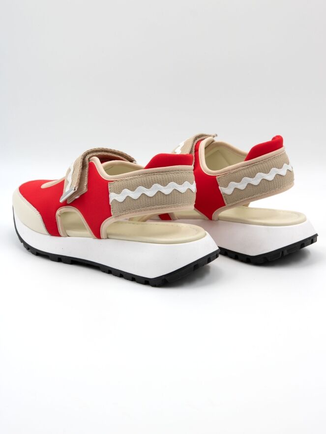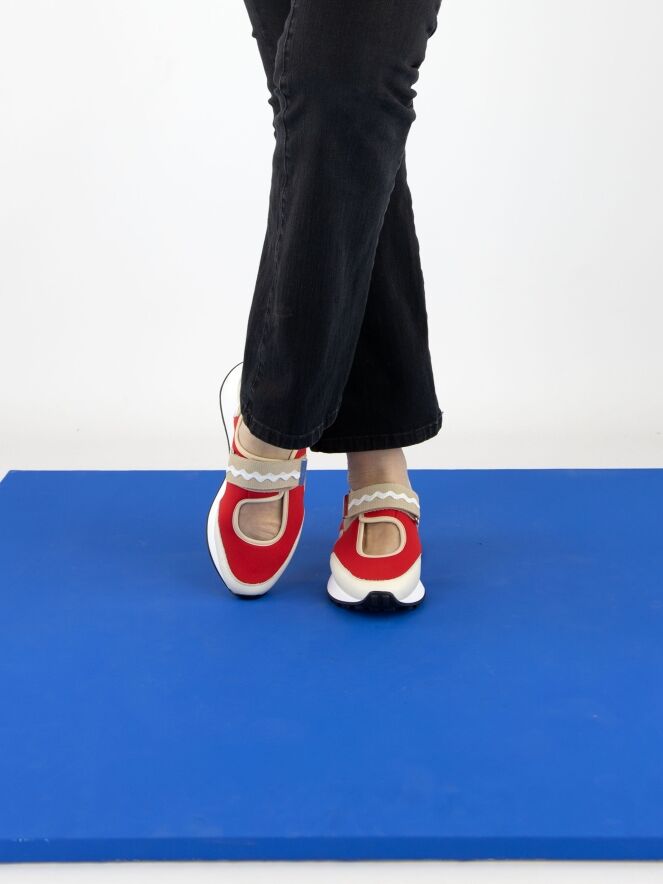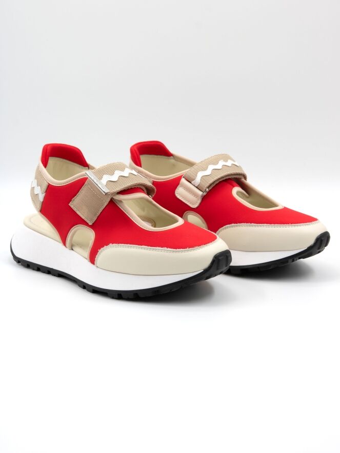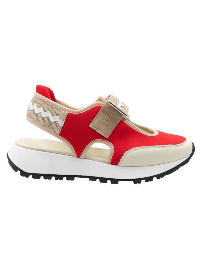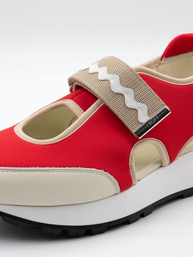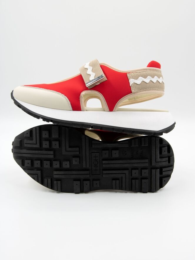 Een sneaker met een open hiel van High in de kleuren rood en zand. In het midden van de voorvoet bevindt zich een opening. Langs de randen loopt een zandkleurige lederen bies. Over de voorvoet is een klittenbandsluiting aangebracht. De zool is uitgevoerd in een heldere witte kleur.