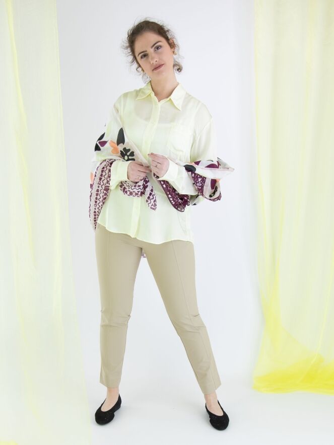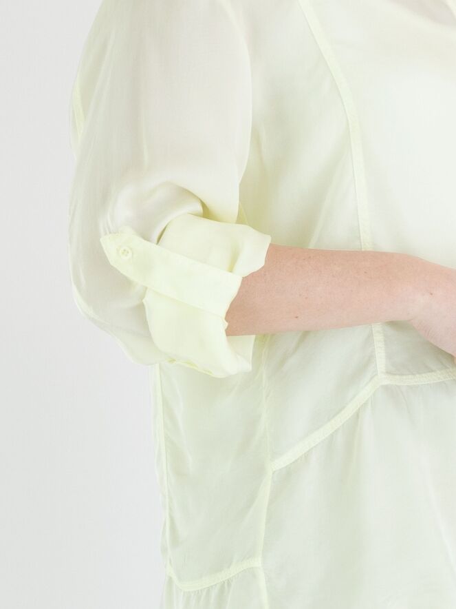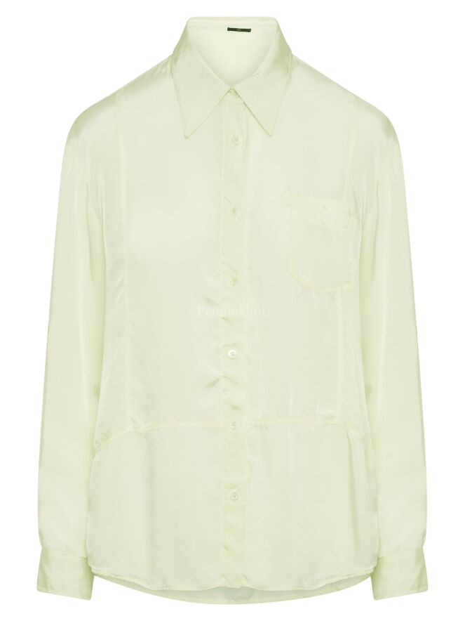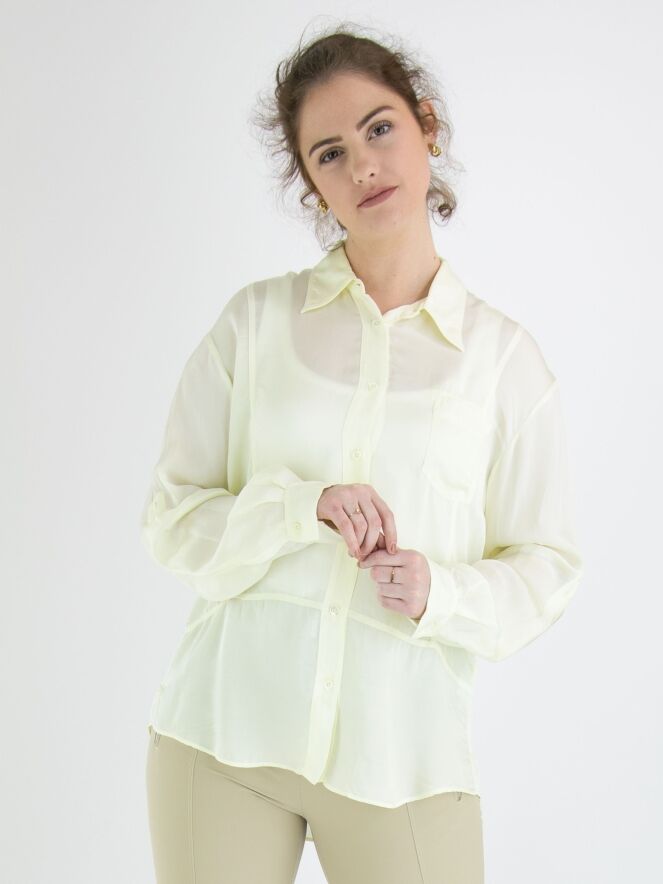 Een mat satijnen blouse van High in een limoen gele kleur. De blouse is licht transparant en mag op de hand worden gewassen.