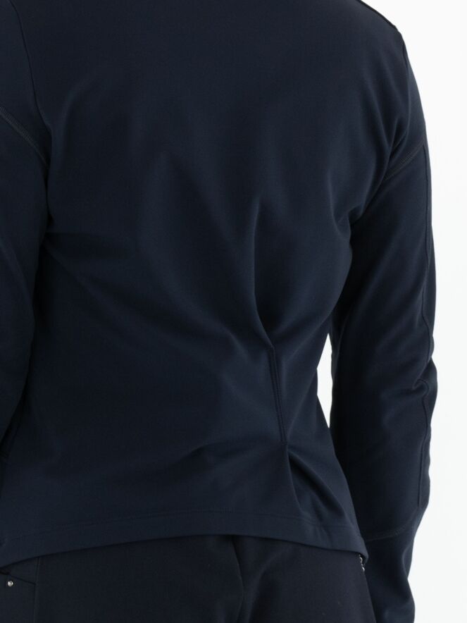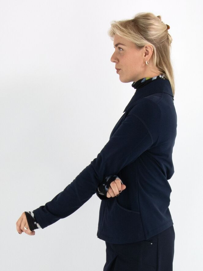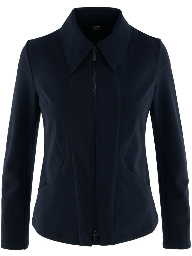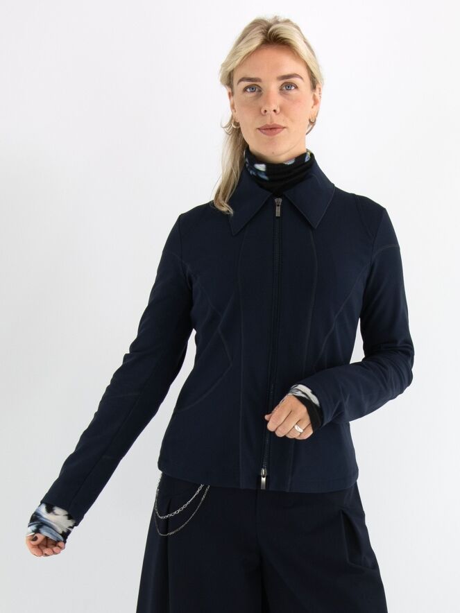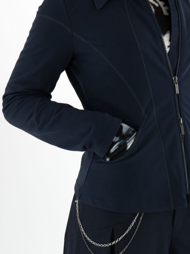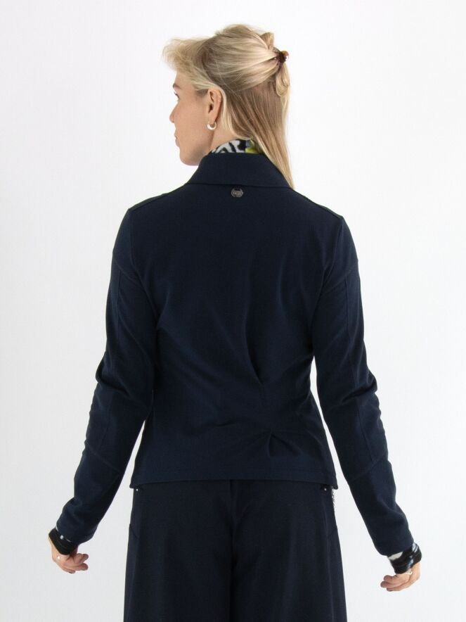 Een blazer van High in de kleur marineblauw. De blazer heeft meerdere decoratieve stiknaden en een ritssluiting. Aan de achterkant, ter hoogte van de taille rechts van het midden, bevindt zich een plisséplooi met een diagonale stiknaad. Deze blazer mag op 30 graden worden gewassen.
