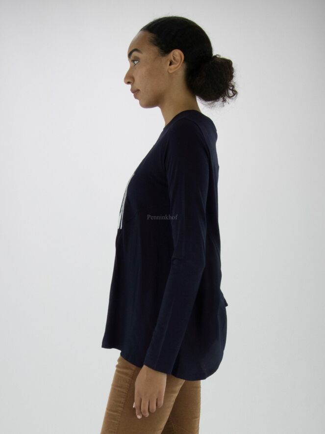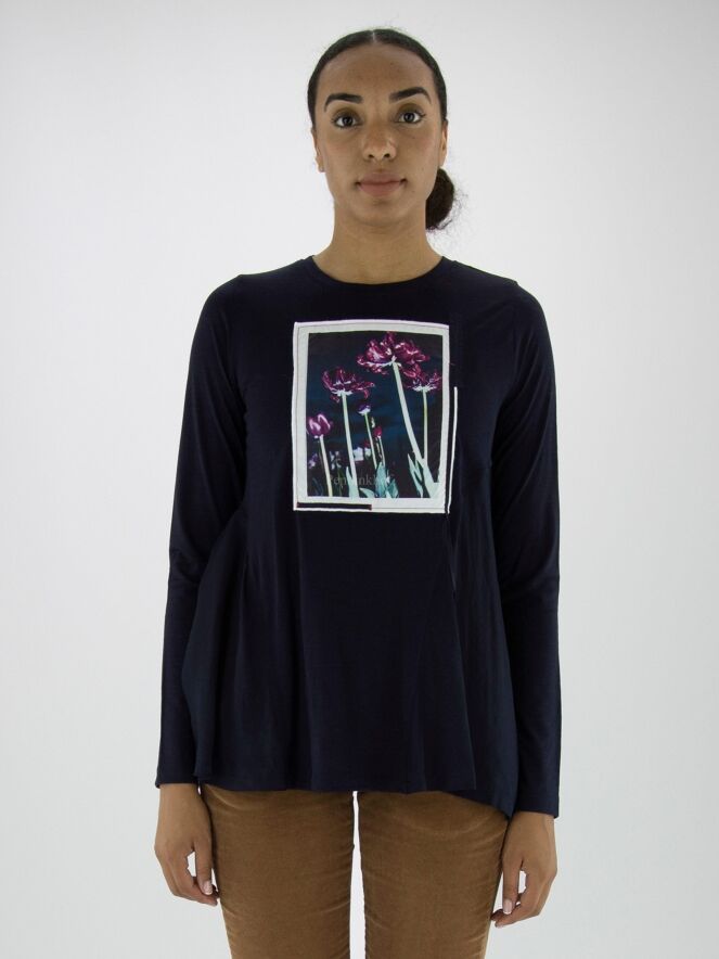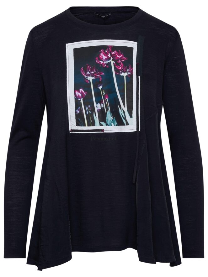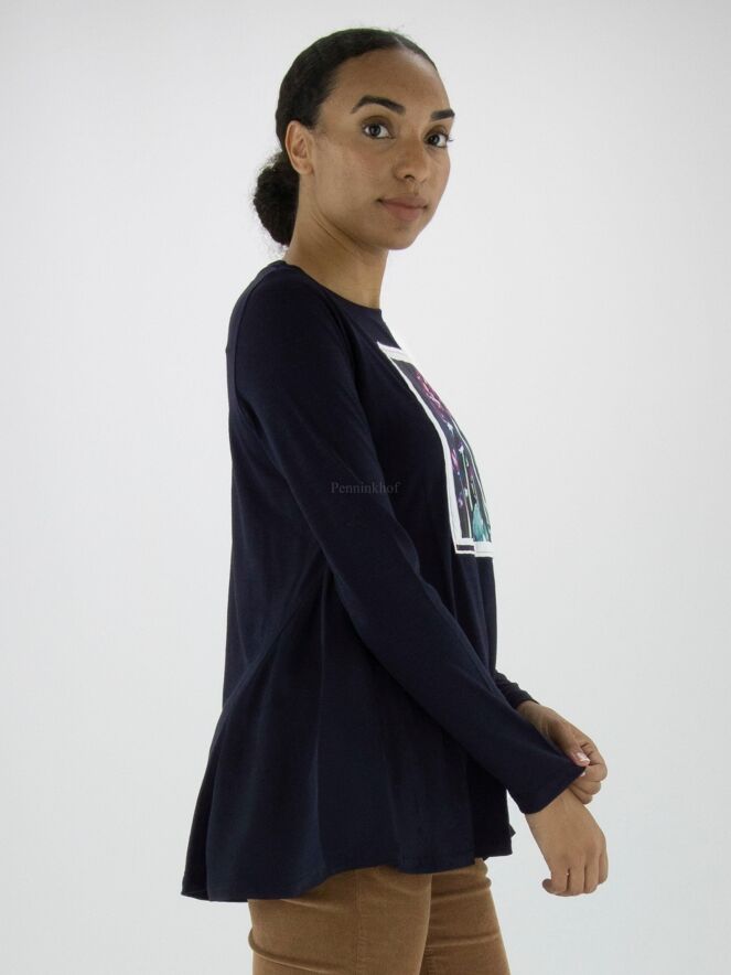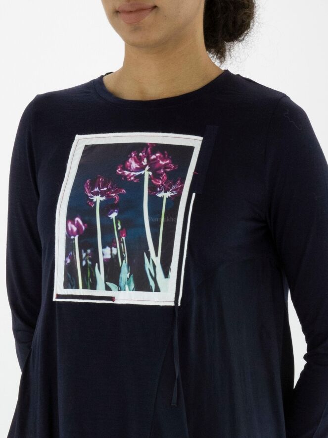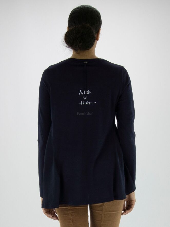 Een shirt van High in de kleur marineblauw. Aan de voorkant is een foto van de fotograaf Enrico de Luigi. Het shirt heeft een A - Lijn en vanuit de oksel zijn de zijkanten in een mat satijnen stof. Dit shirt mag op de hand worden gewassen.