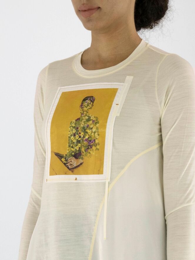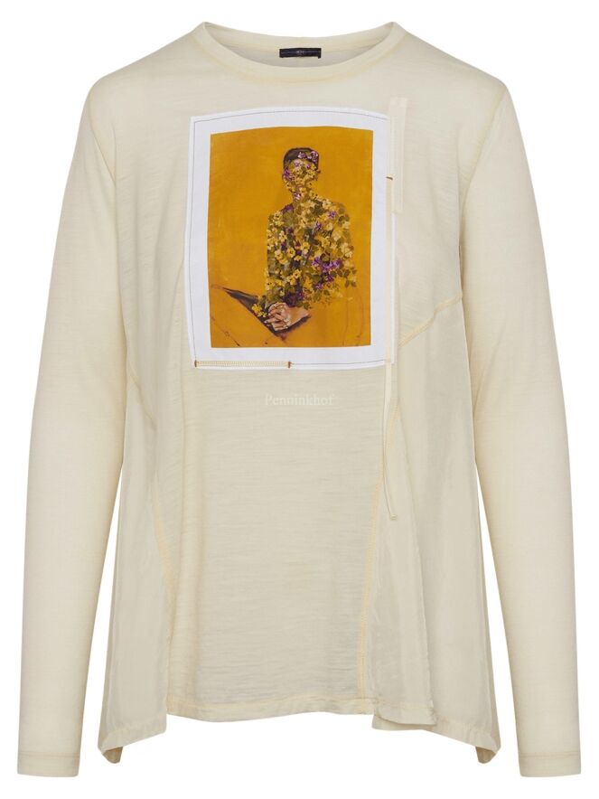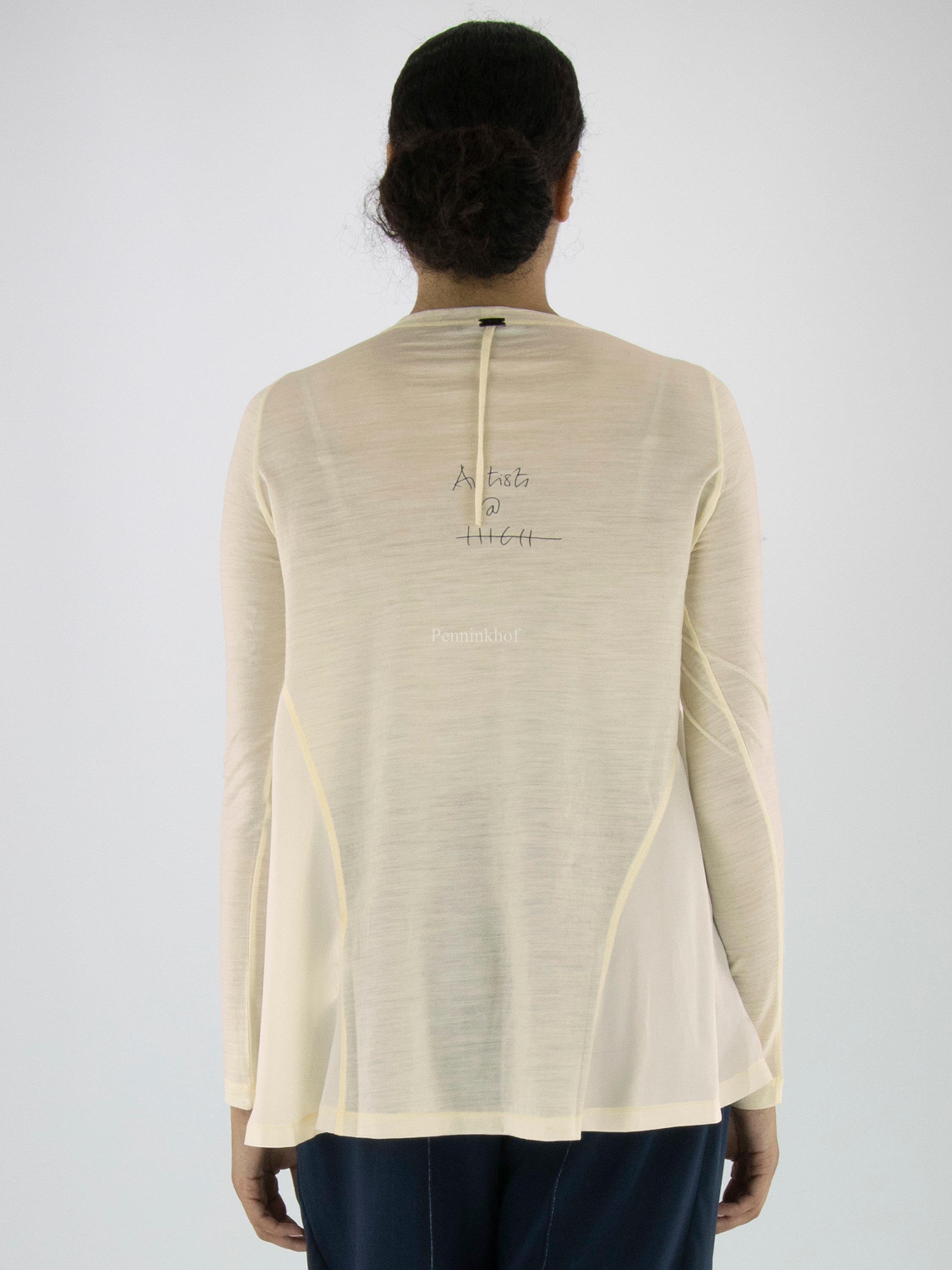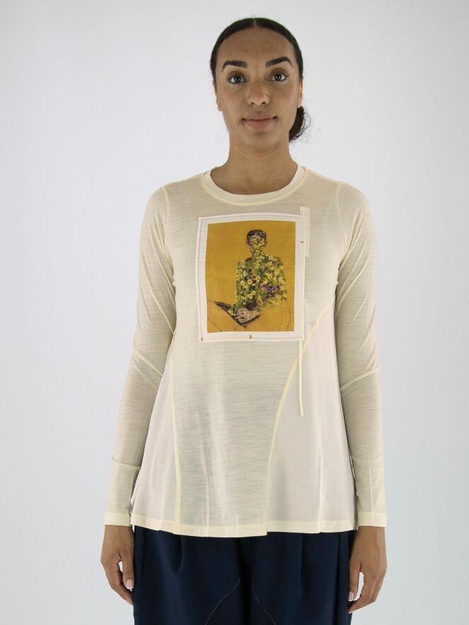 Een shirt van High in de kleur roomwit. Aan de voorkant is een foto van de fotograaf Enrico de Luigi. Het shirt heeft een A - Lijn en vanuit de oksel zijn de zijkanten in een mat satijnen stof. Dit shirt mag op de hand worden gewassen.