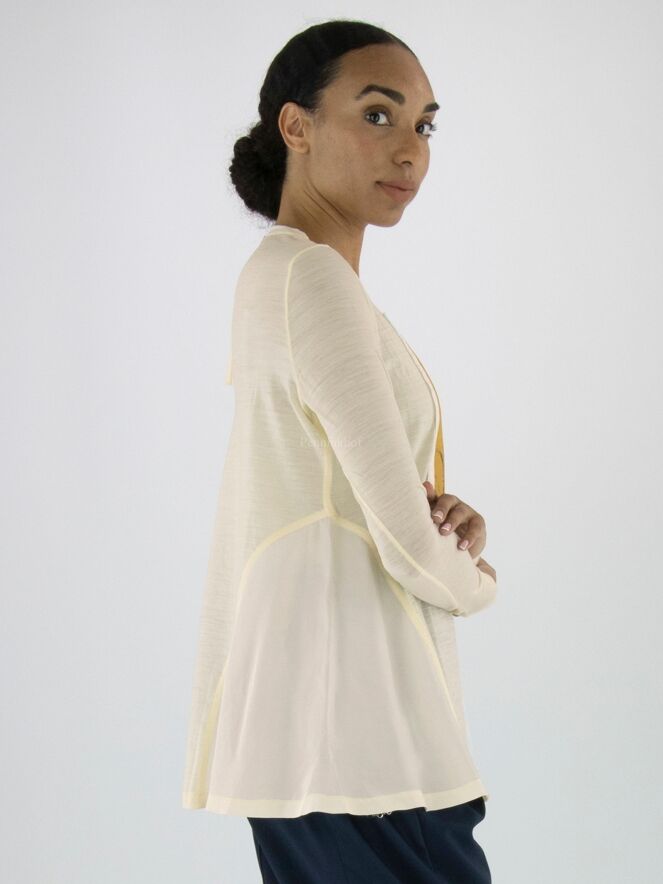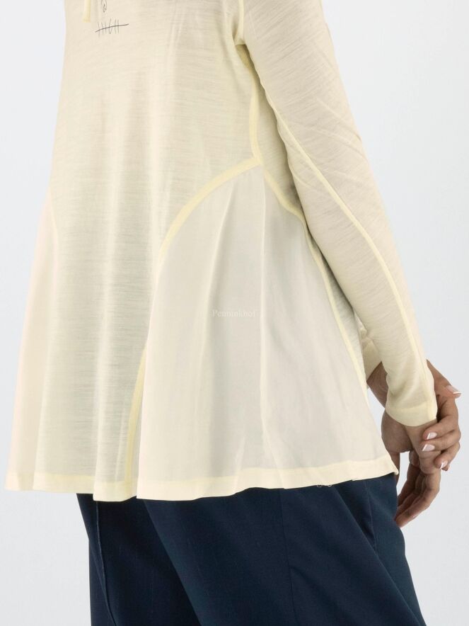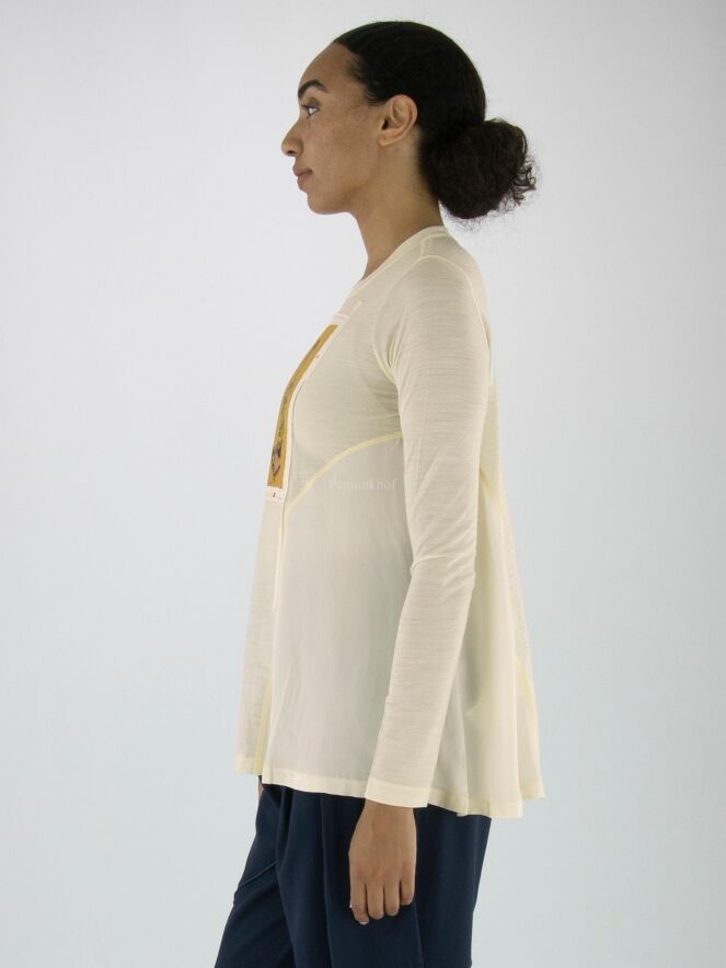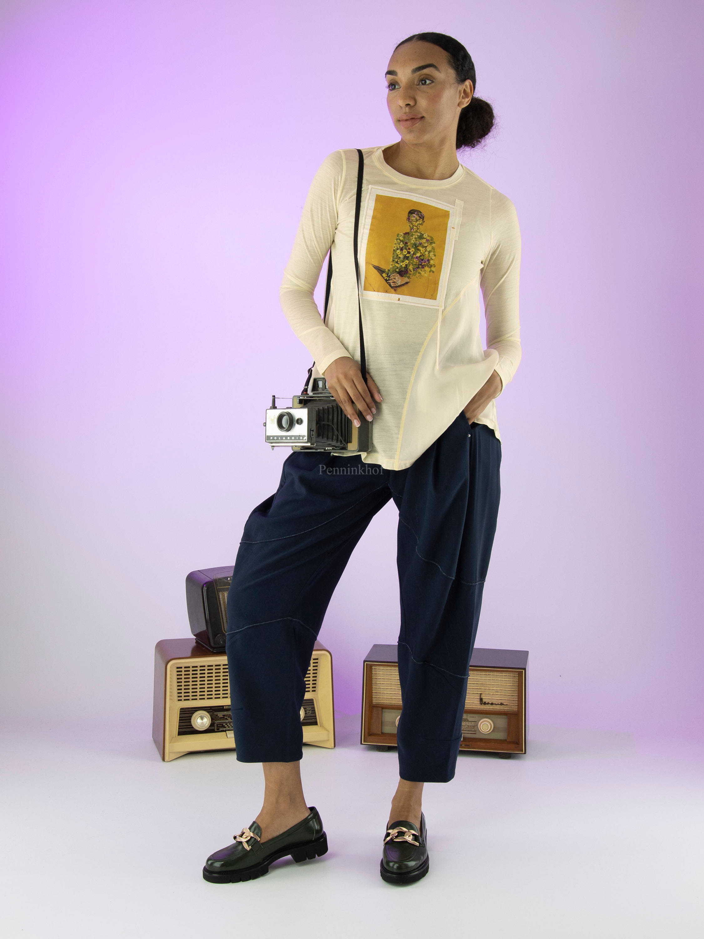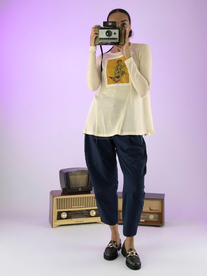 Een shirt van High in de kleur roomwit. Aan de voorkant is een foto van de fotograaf Enrico de Luigi. Het shirt heeft een A - Lijn en vanuit de oksel zijn de zijkanten in een mat satijnen stof. Dit shirt mag op de hand worden gewassen.