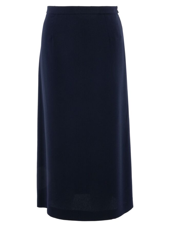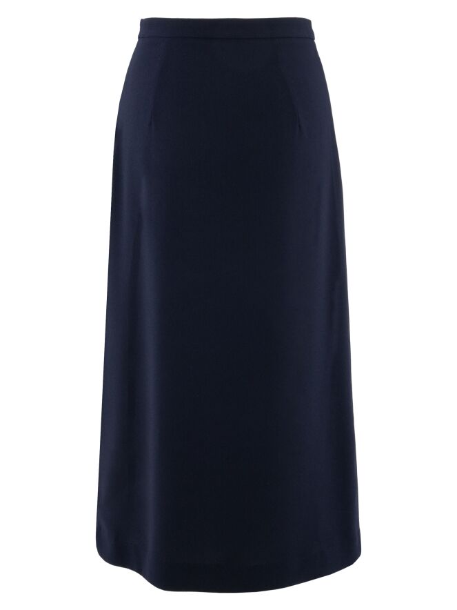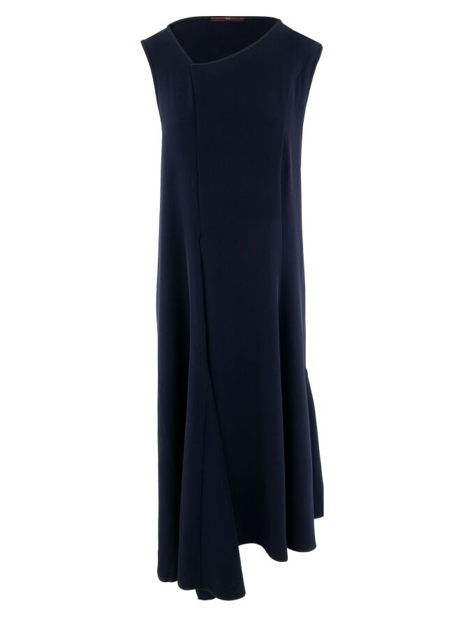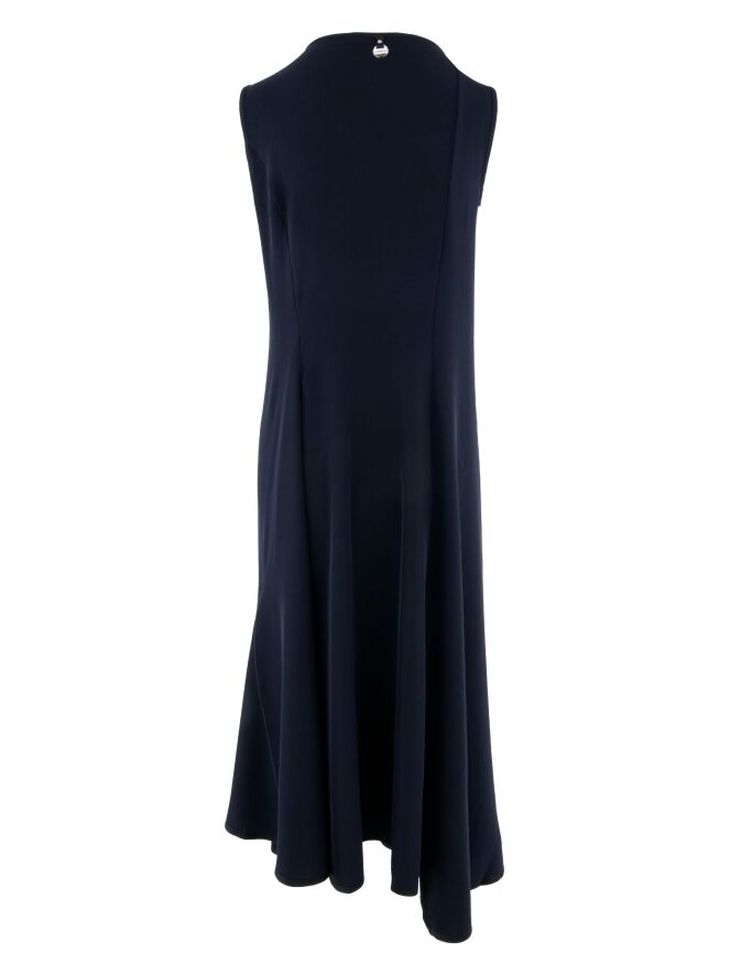Jurk van High in een elegante marineblauwe tint. De V-hals is asymmetrisch vormgegeven, wat het ontwerp een modern en karakteristiek accent geeft. Vanaf de taille loopt de jurk uit in een A-lijn, waarbij enkele bandplooien zorgen voor een vloeiende en vrouwelijke valling. Deze jurk kan op 30 graden worden gewassen.