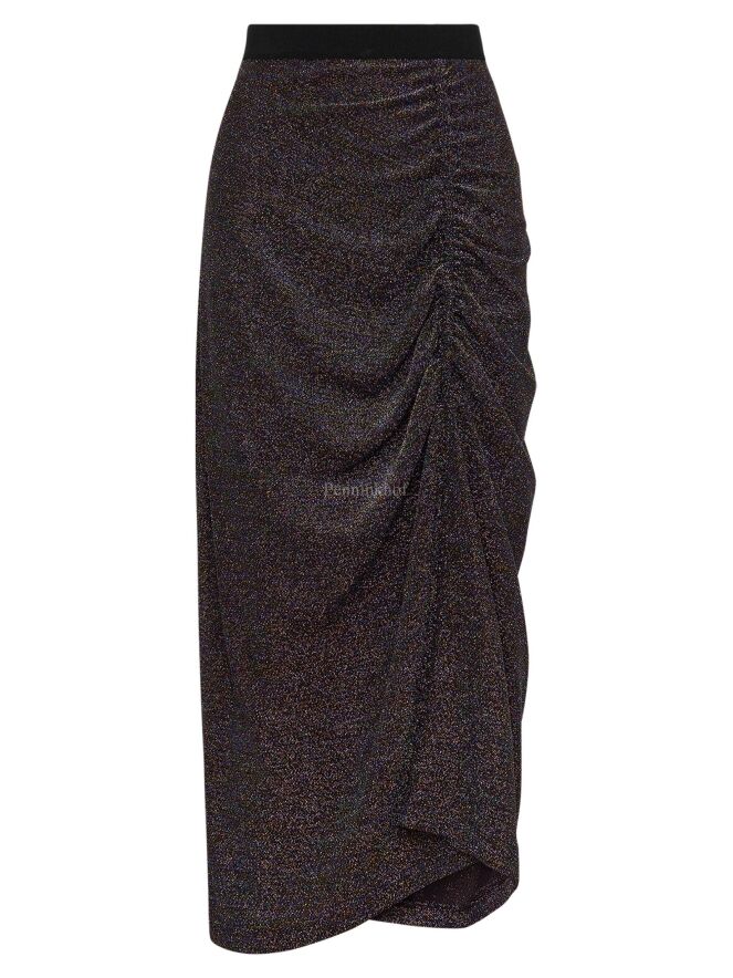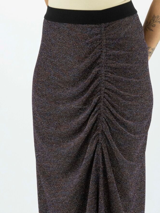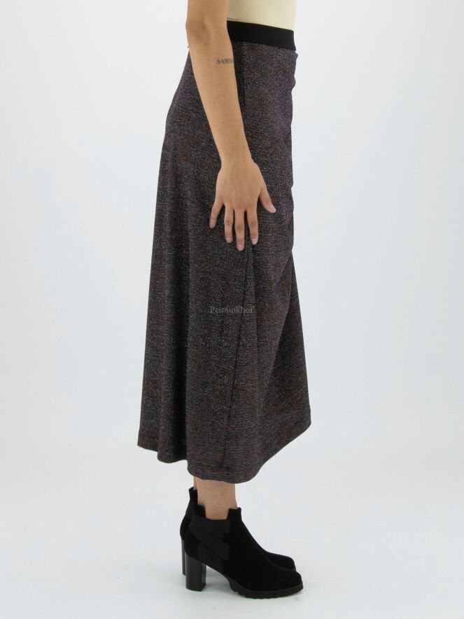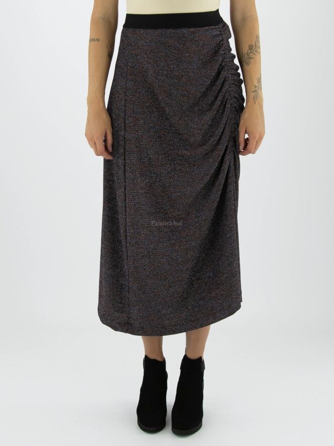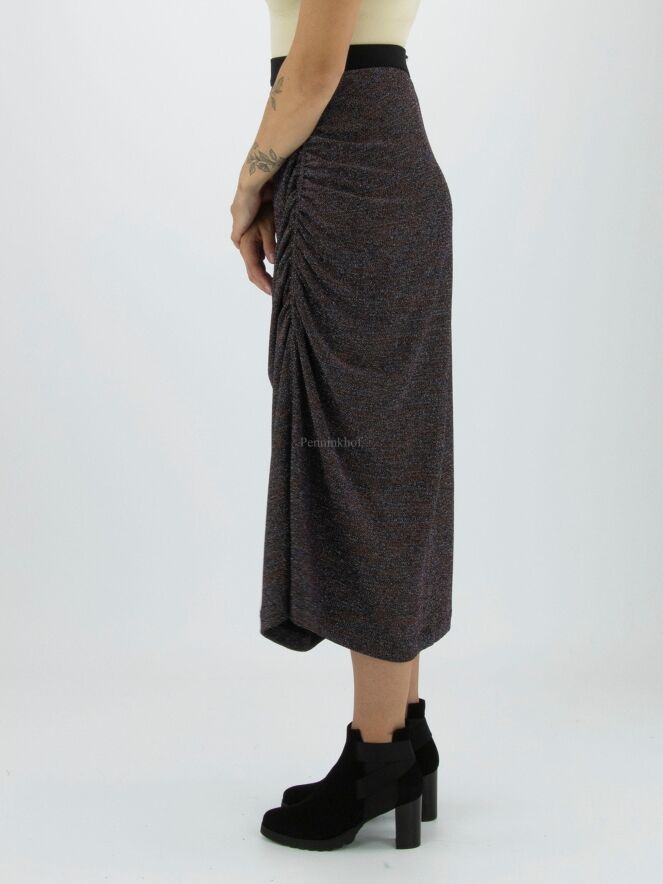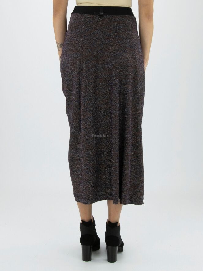 Een lurex rok van High met meerdere kleuren in de stof zoals bordeauxrood, blauw, zilver en zwart. In de taille is een elastieken band. Aan de voorkant is in het midden een verticale stiknaad waarlangs de stof geplooid is wat een drapeer effect geeft. Deze rok mag op de hand worden gewassen.
