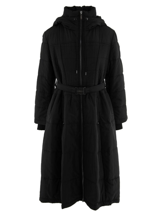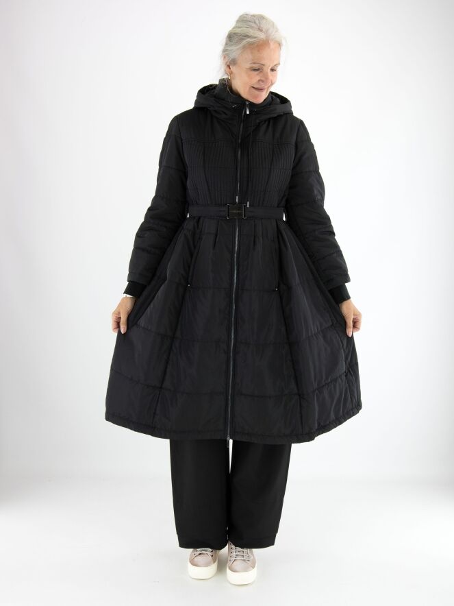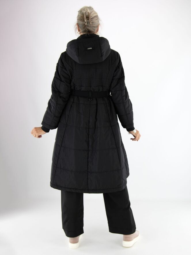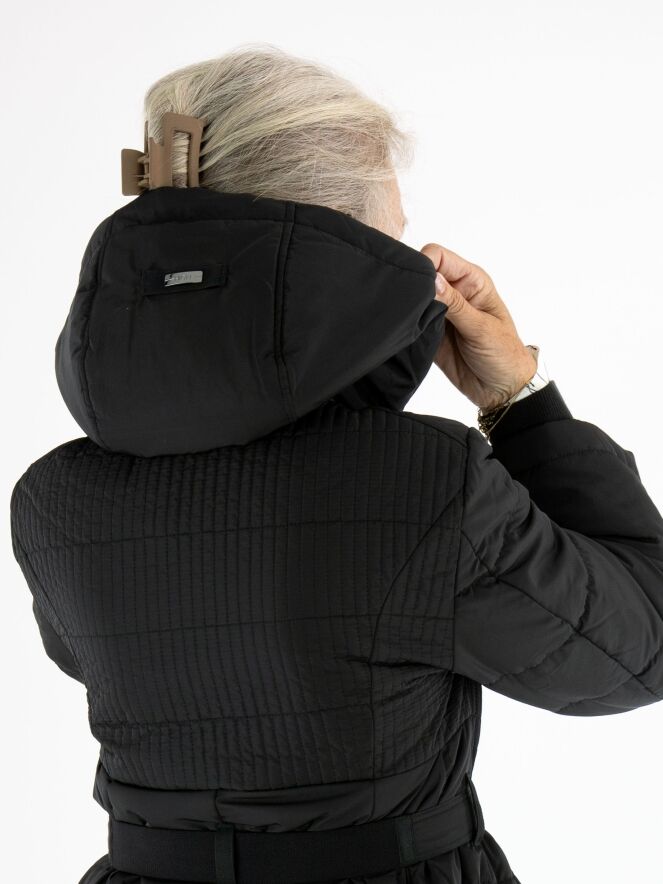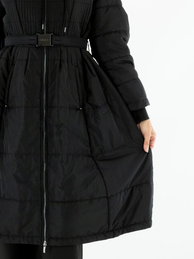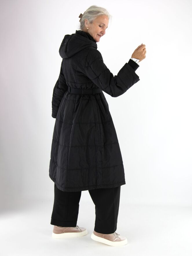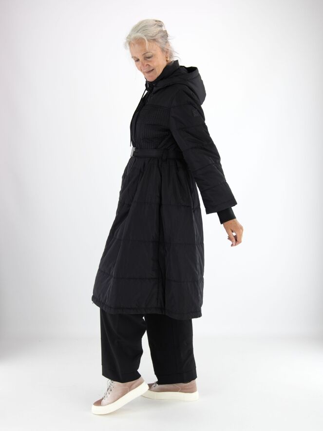 Een lange coat van High in de kleur zwart. In de rand van de capuchon is een koord verwerkt in een tunnel. Ter hoogte van de taille zit een ceintuur met een nikkelkleurige gesp. Vanaf borsthoogte tot de taille is de stof gestikt in een gesmokt patroon. De coat heeft steekzakken en mag op 30 graden worden gewassen.