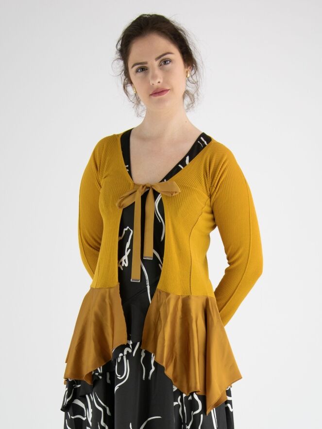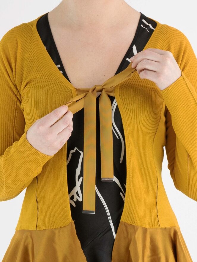Een fijn geweven en licht transparant vest van High in de kleur wit. Ter hoogte van de buste is een sluiting met 2 linten. In het midden is de stof fijn geribbeld en aan de zijkanten glad met op de scheidslijn een ajourlijn. Onder de taille is een mat satijnen stof. Dit vest mag op de hand worden gewassen.