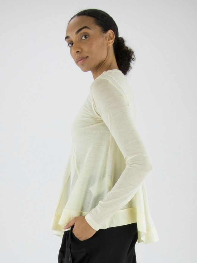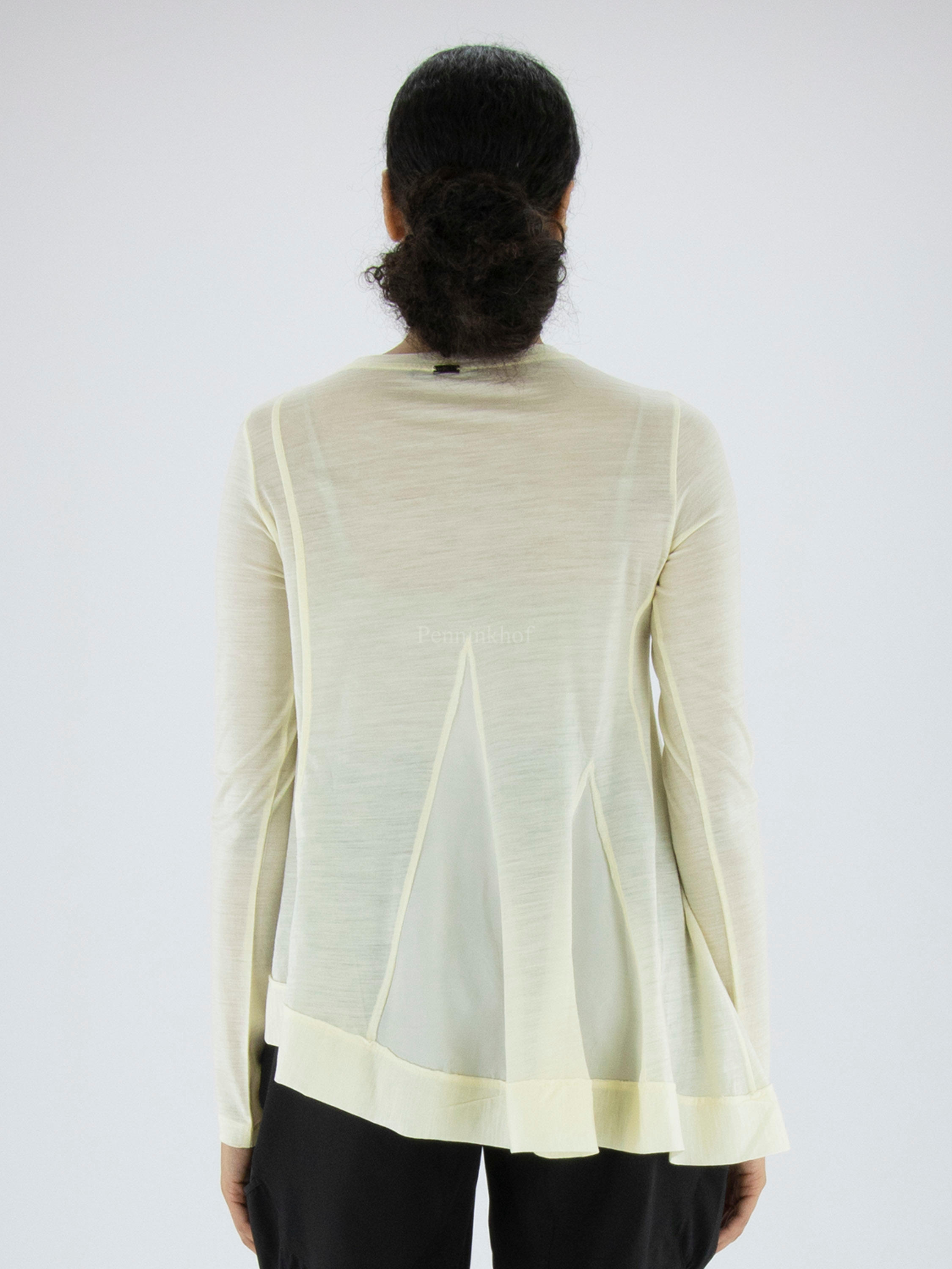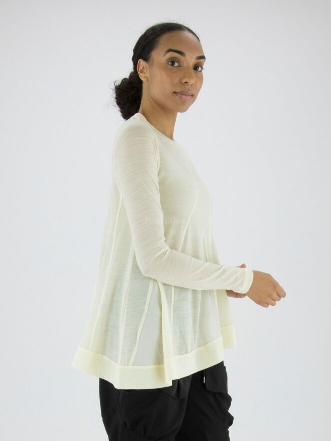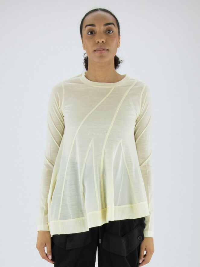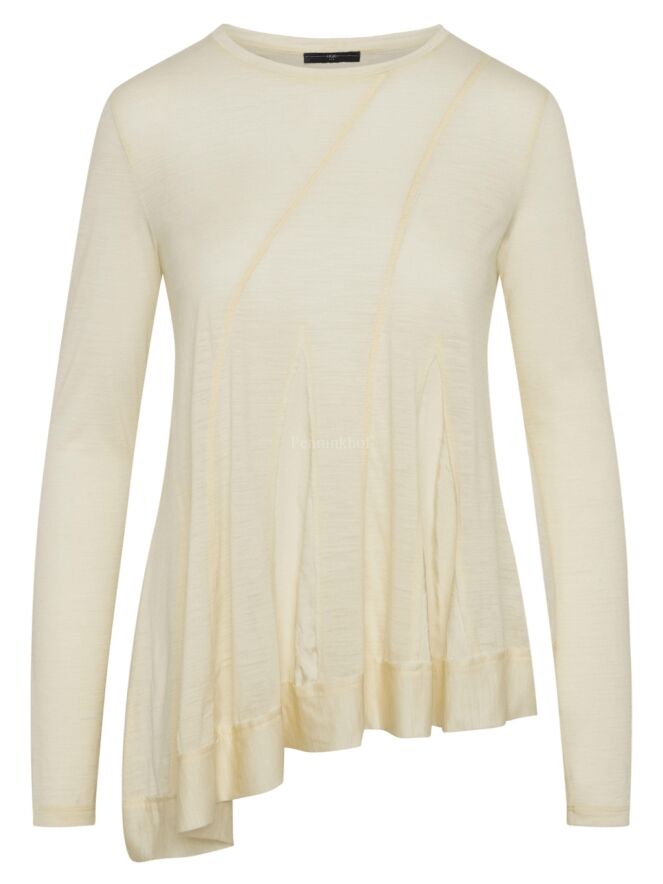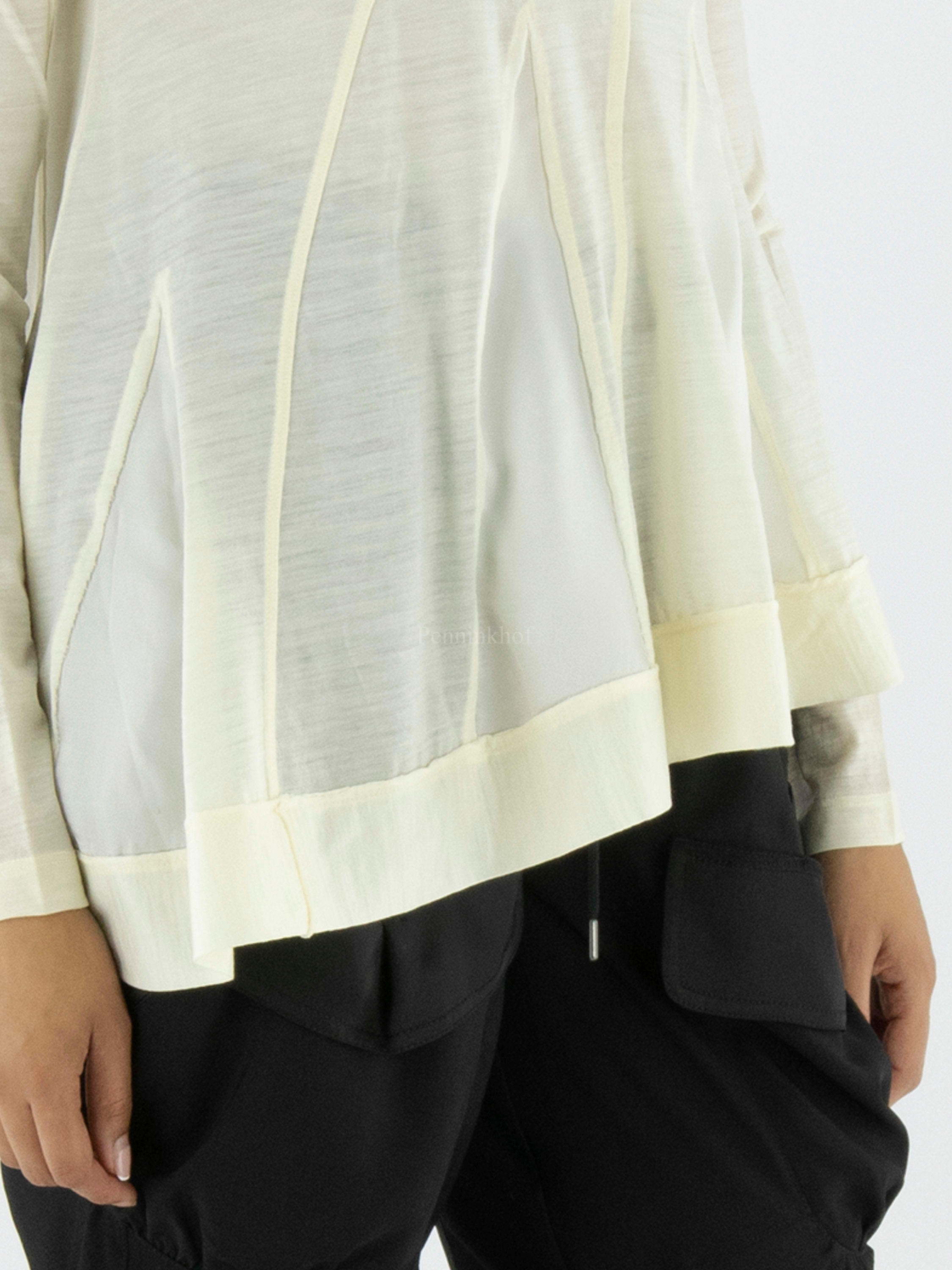 Een shirt van High in een roomwitte kleur. Aan de voorkant zijn enkele diagonale stiknaden waartussen een mat satijnen stof is. Aan de onderkant is een brede band met een stiknaad. Dit shirt mag op de hand worden gewassen.